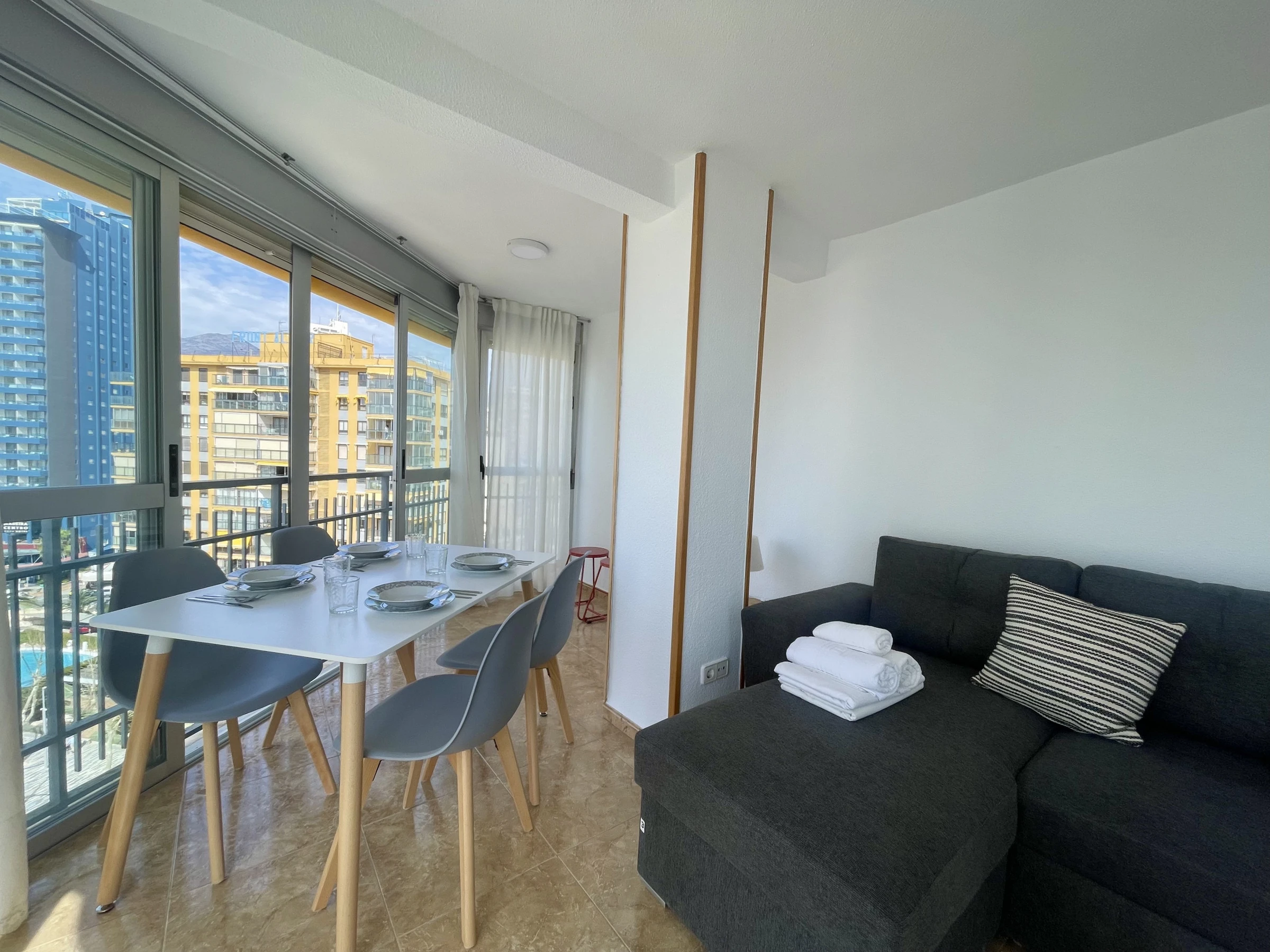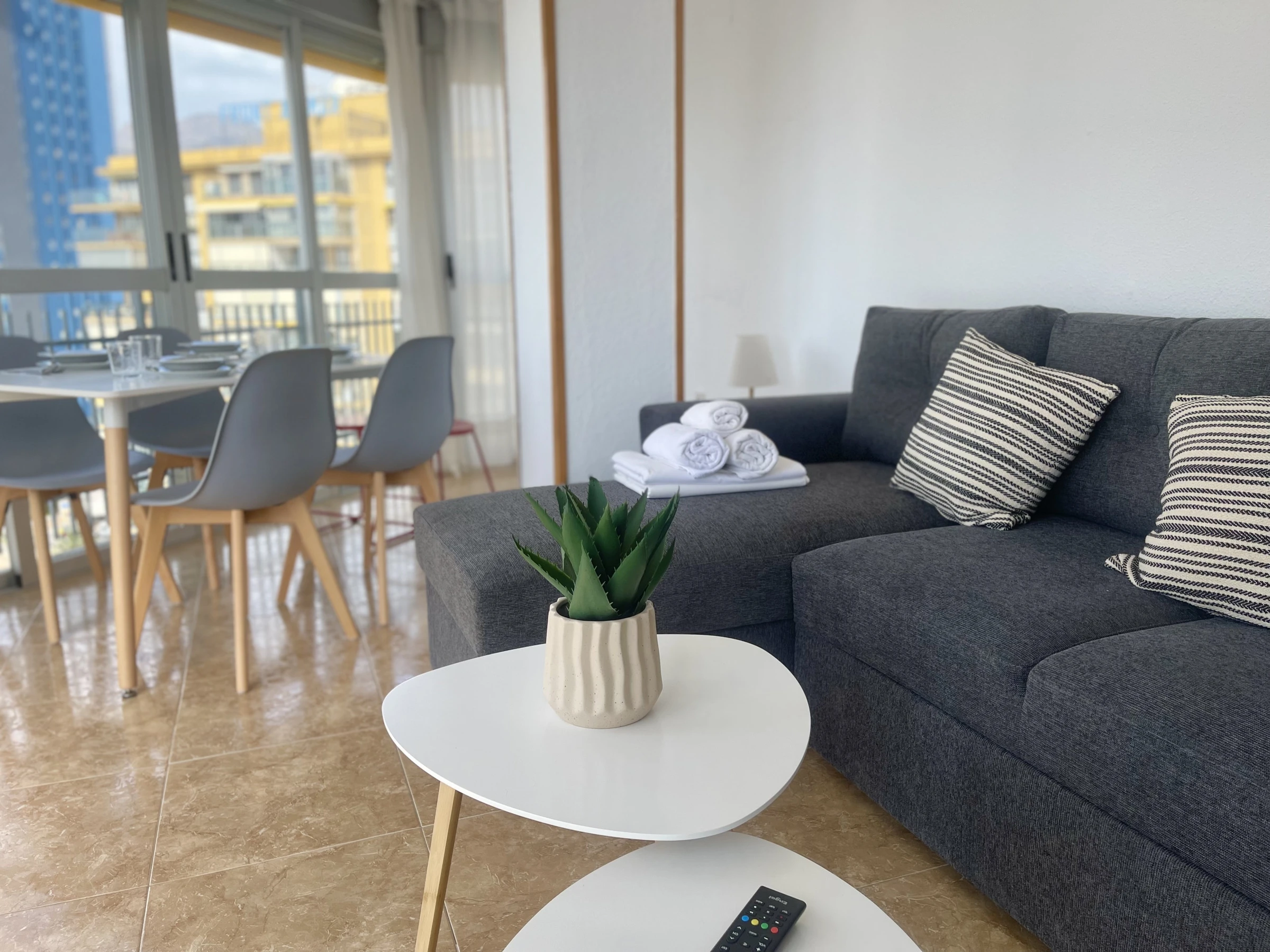 Die Wohnung in Benidorm verfügt über 2 Schlafzimmer und Platz für 5 Personen. Unterkunft mit 70 m² geschmackvoll und modern eingerichtet. Sie befindet sich in einer idealen Zone für Familien und direkt am Meer. Verfügt über Aufzug, Waschmaschine, Bügeleisen, Internetzugang (WLAN), Klimaanlage, Parkplatz im Freien im selben Gebäude, Fernsehen. Die separate Küche ist ausgestattet mit Kühlschrank, Mikrowelle, Backofen, Geschirr/Besteck, Küchenutensilien, Kaffeemaschine, Toaster und Wasserkocher.
