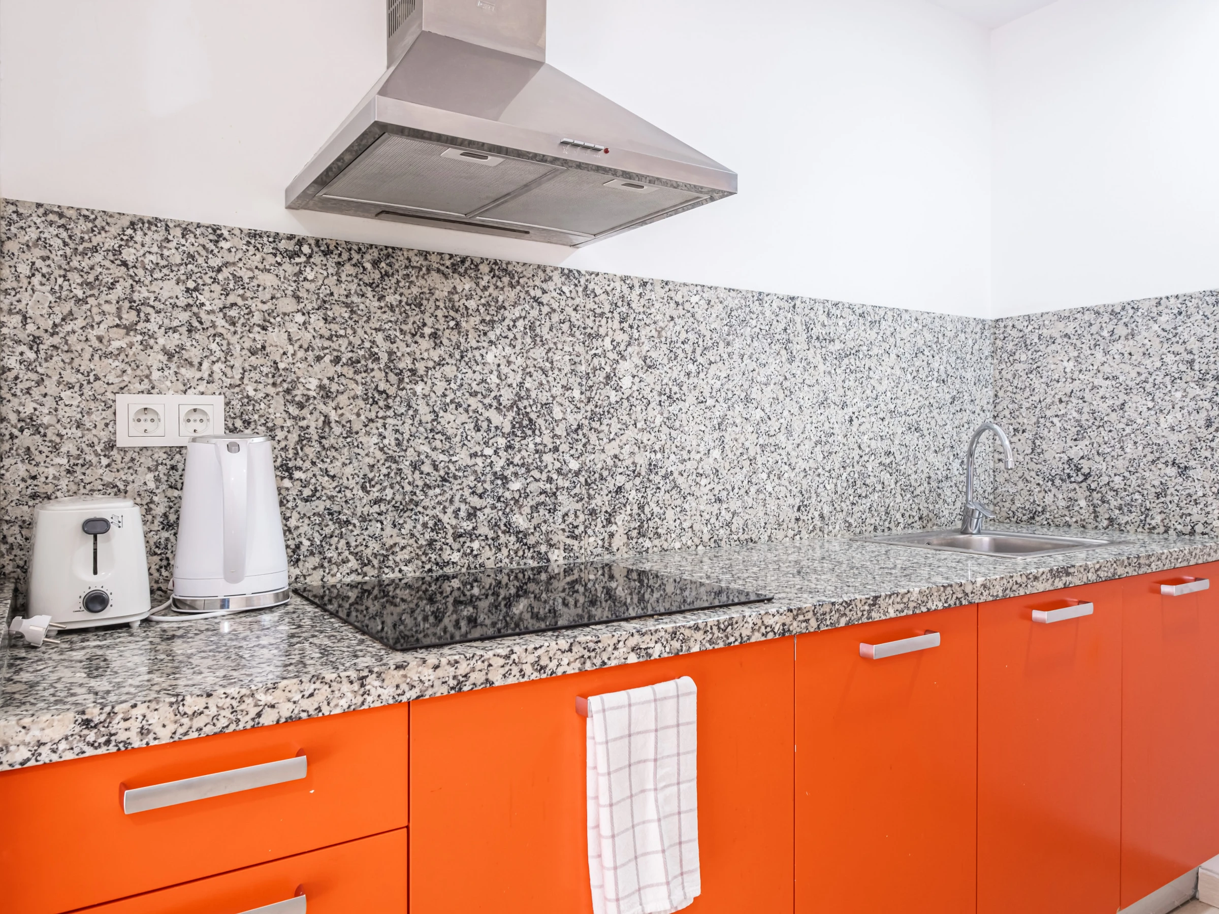 Dieses offene küche, mit ceranfeld, ist ausgestattet in kühlschrank, mikrowelle, gefrierschrank, geschirr/besteck, kochutensilien, kaffeemaschine, toaster, wasserkocher und saftpresse.
