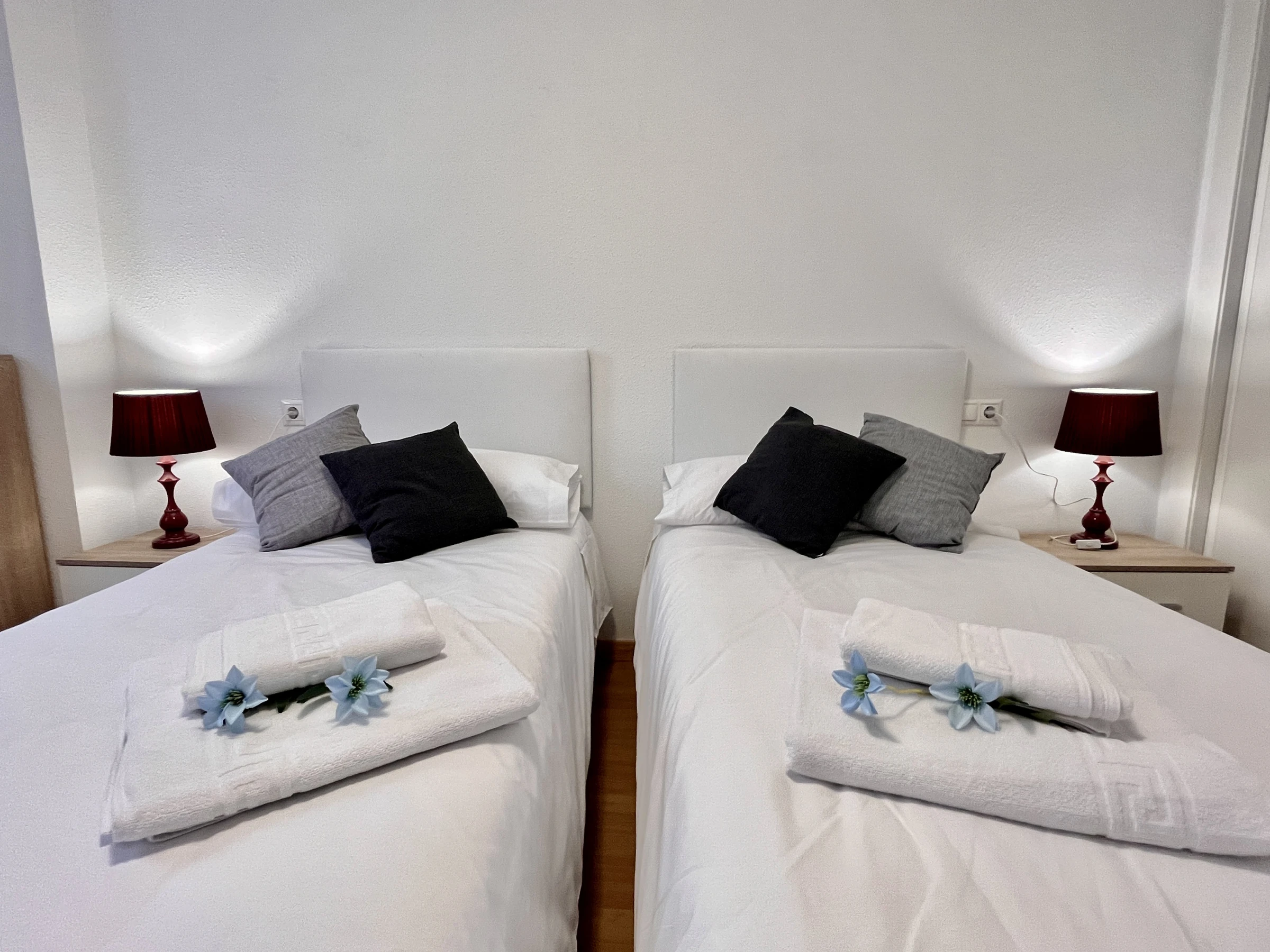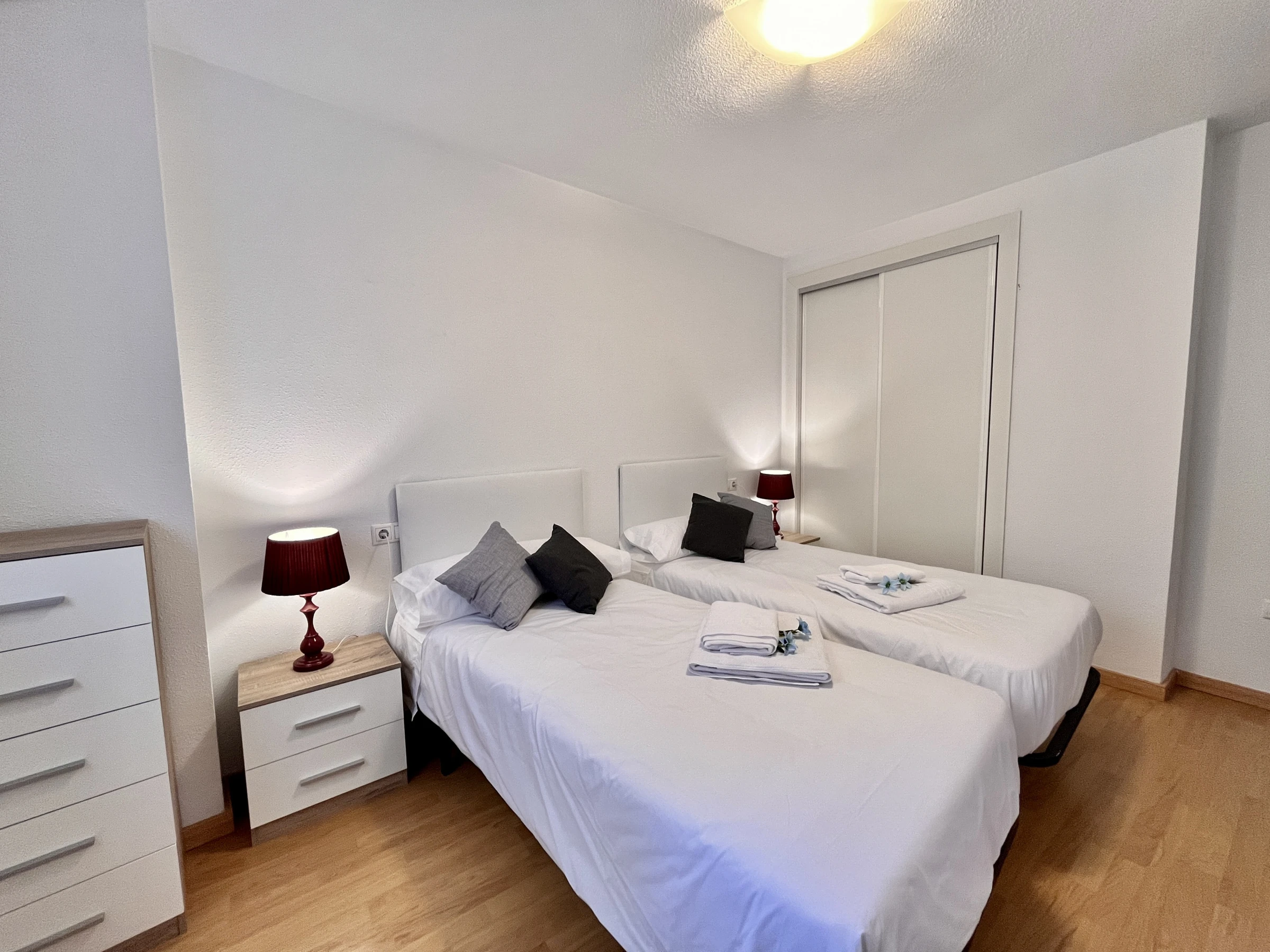 Das Hauptschlafzimmer verfügt über zwei Einzelbetten, Bettwäsche, einen Heizkörper und einen Kleiderschrank für Ihre Sachen. Das Wohnzimmer hat ein Doppelschlafsofa, das Badezimmer ist mit einer Dusche, einem Haartrockner und Handtüchern ausgestattet und bietet alles, was Sie brauchen, um sich nach einem Tag am Strand oder beim Erkunden der Stadt zu erfrischen.