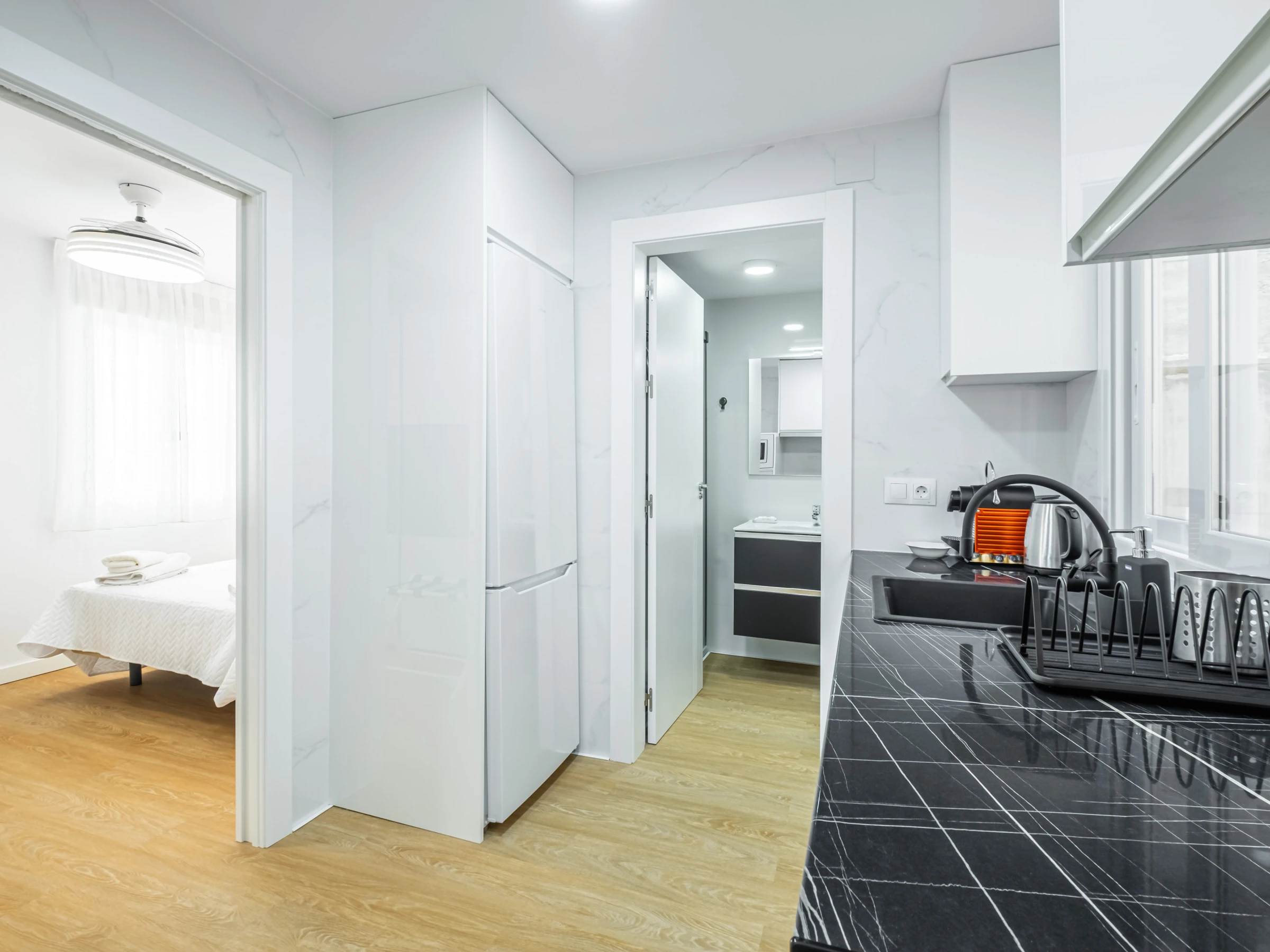 Dieses offene küche, mit induktions-kochfeld, ist ausgestattet in kühlschrank, mikrowelle, backofen, gefrierschrank, spülmaschine, geschirr/besteck, kochutensilien, kaffeemaschine, toaster, wasserkocher und saftpresse.
