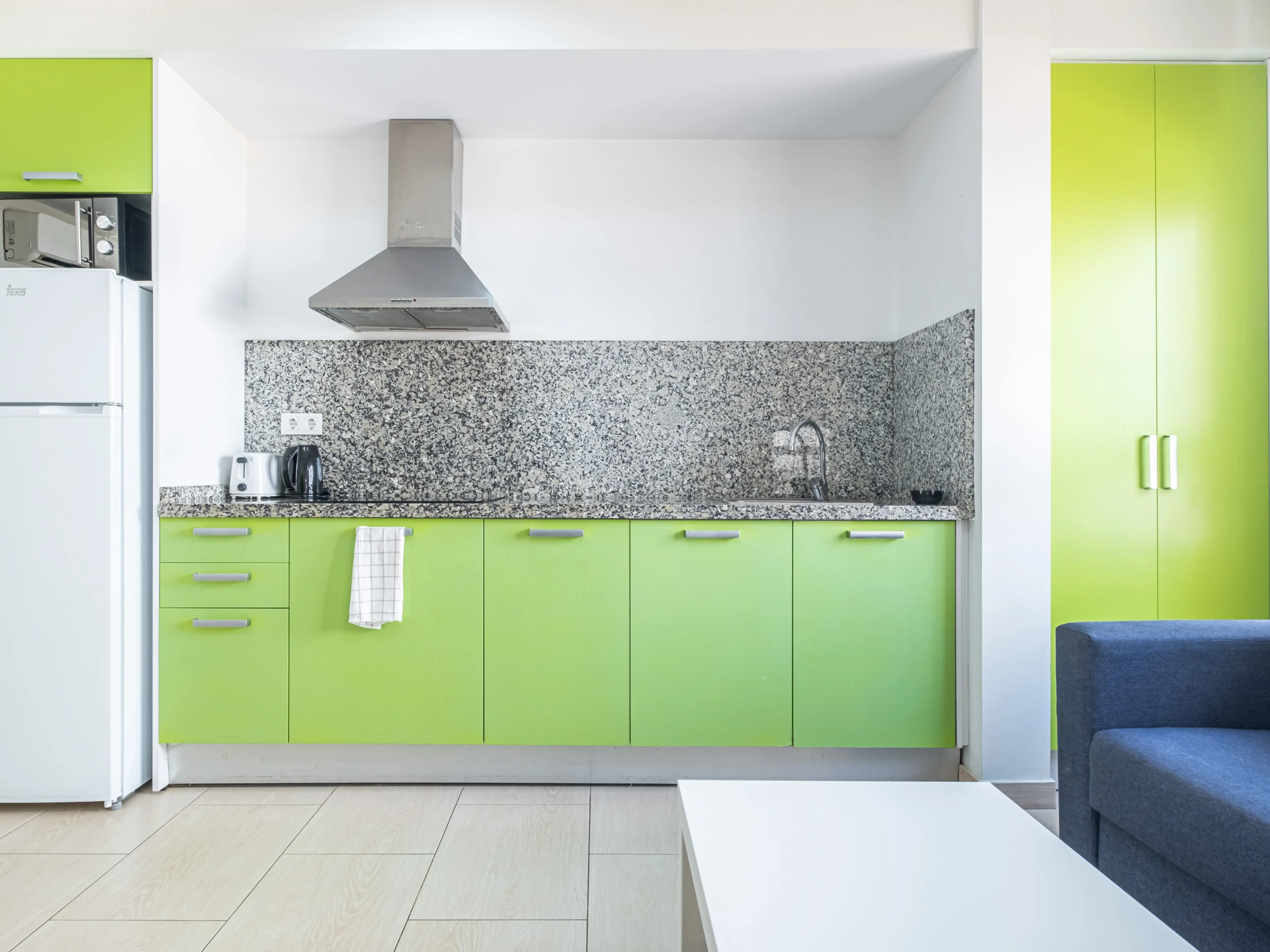 Dieses offene küche, mit ceranfeld, ist ausgestattet in kühlschrank, mikrowelle, gefrierschrank, geschirr/besteck, kochutensilien, kaffeemaschine, toaster, wasserkocher und saftpresse.