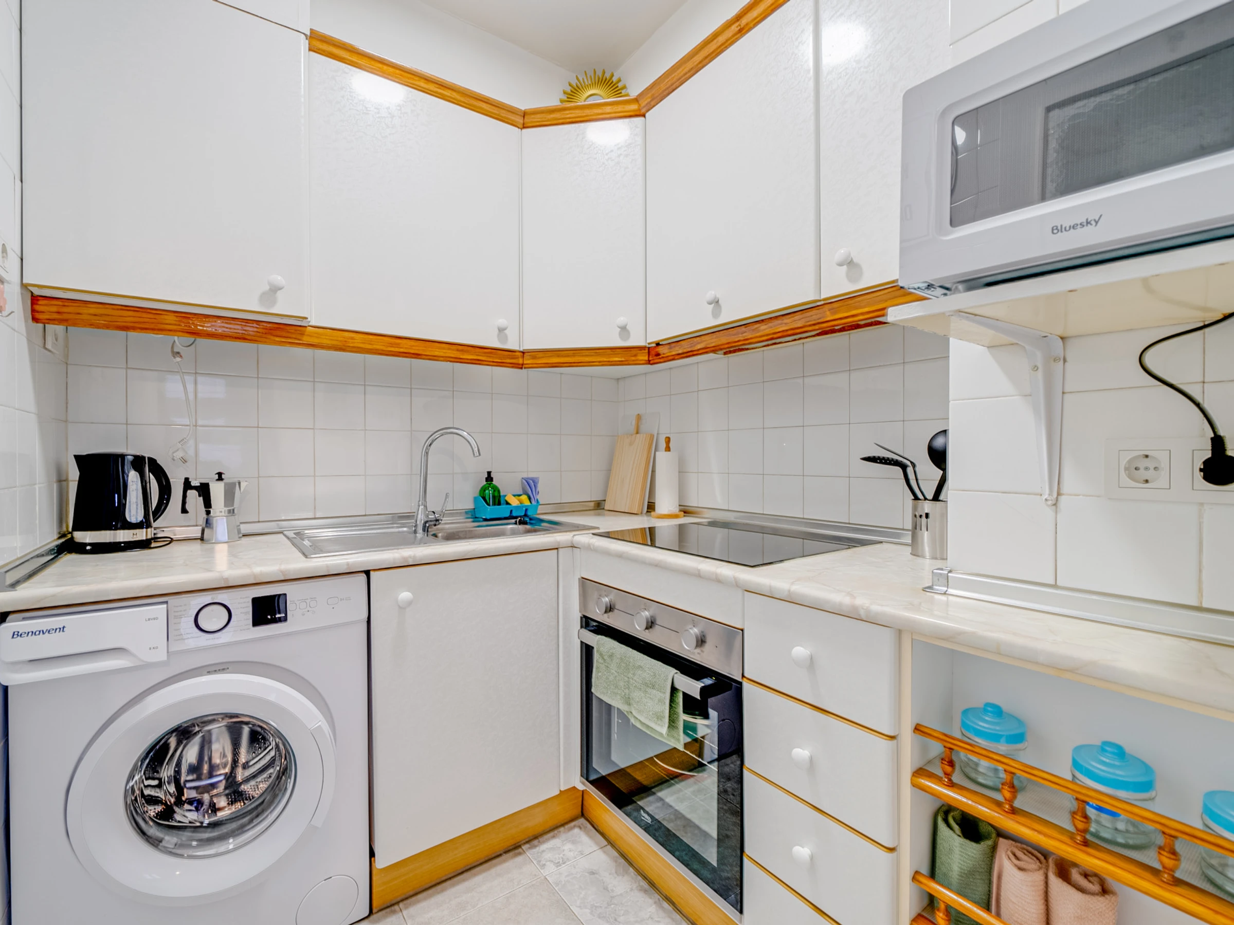 Dieses küche, mit ceranfeld, ist ausgestattet in kühlschrank, mikrowelle, backofen, gefrierschrank, geschirr/besteck, kochutensilien, kaffeemaschine und wasserkocher.