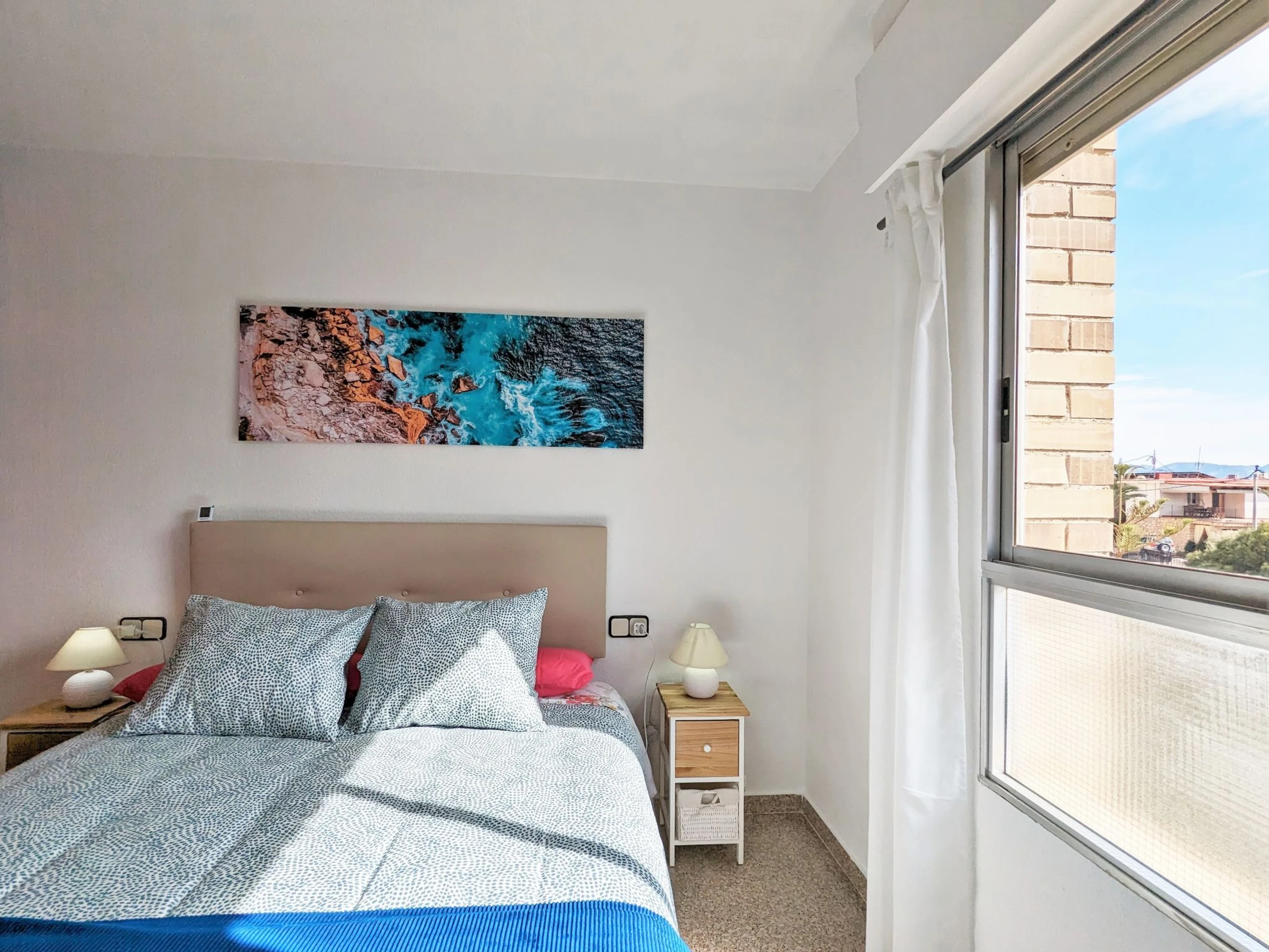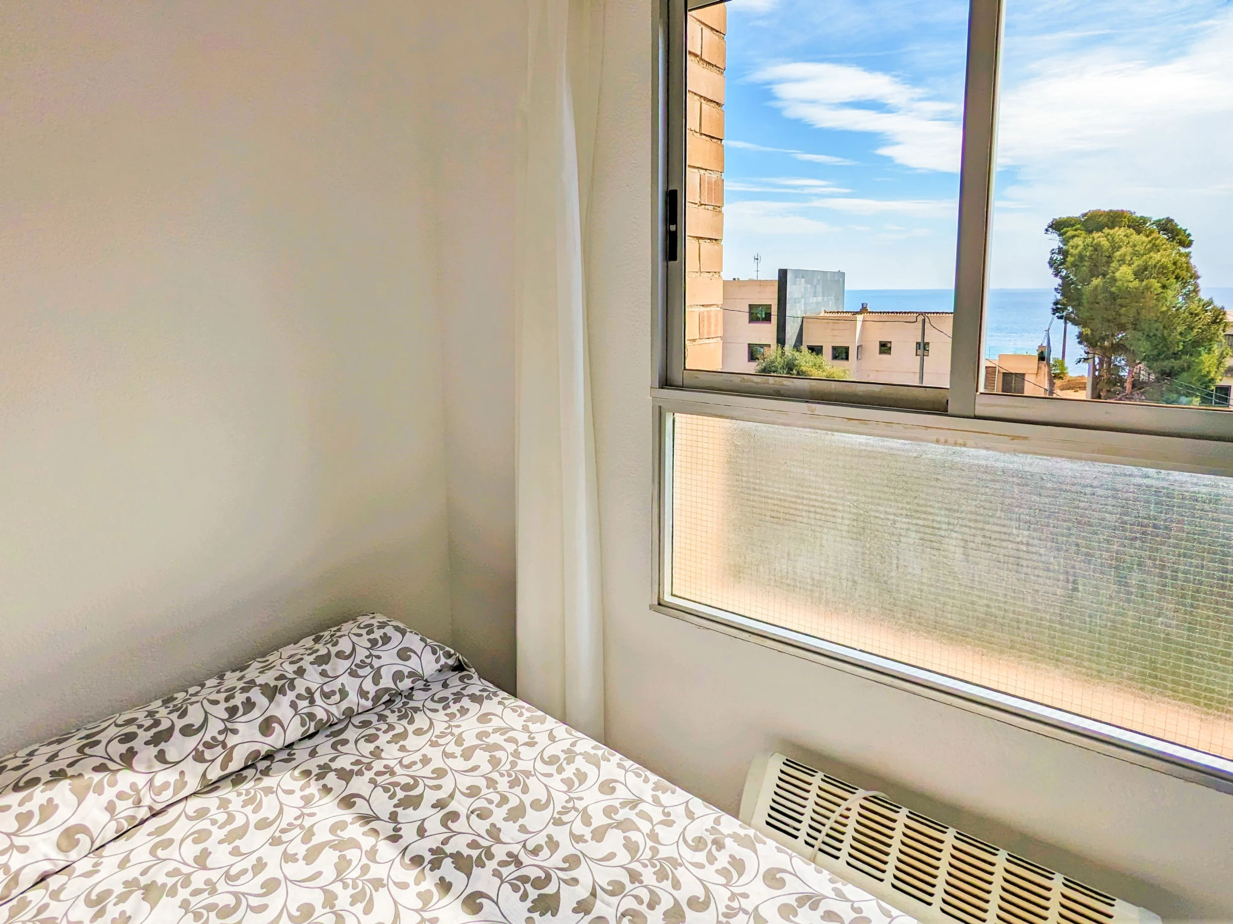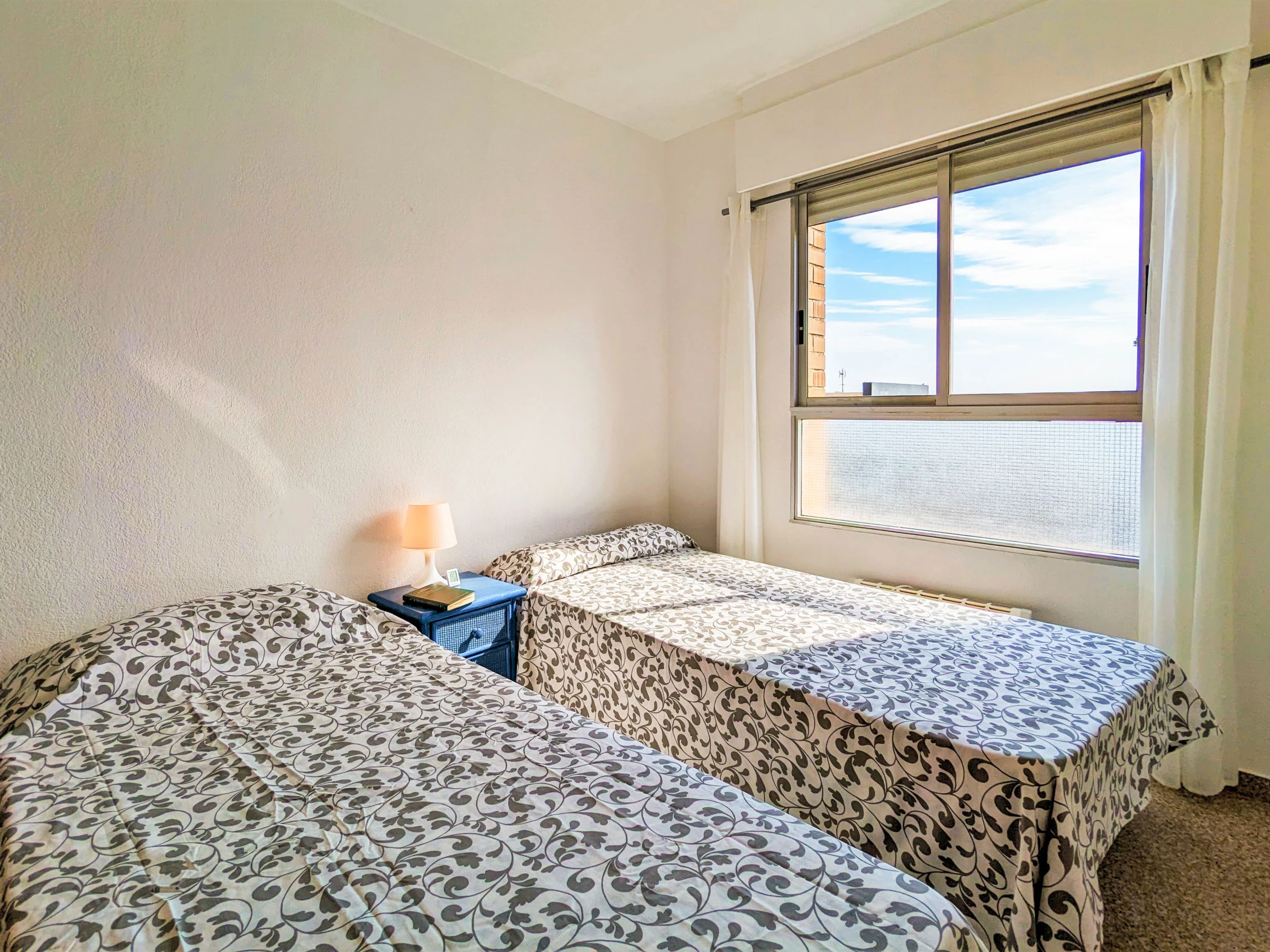 "Coblanca XVI", 3-Zimmer-Wohnung 50 m2 im 4. Stock, Ostlage. Geräumig und hell, zweckmässig und komfortabel eingerichtet: Wohn-/Esszimmer 16 m2 mit Digital-TV, E-Heizung, Klimaanlage, Ventilator und Warmluftheizung. Ausgang zur Terrasse. 1 Zimmer 7 m2 mit 2 Betten (90 cm, Länge 190 cm), Ventilator. 1 Zimmer 10 m2 mit 1 franz. Bett (150 cm, Länge 200 cm), Digital-TV und Ventilator. Küche (Backofen, Geschirrspüler, 4 Glaskeramikplatten, Toaster, Wasserkocher, Mikrowelle, Tiefkühler, elektrische Kaffeemaschine). Bad/Bidet/WC. Boiler (50 Liter). Kleine Terrasse. Terrassenmöbel. Fernsicht auf das Meer, die Berge, den Garten und die Ortschaft. Zur Verfügung: Waschmaschine, Bügeleisen, Haartrockner. Parkplatz Nr. S/N. [hidden] // Reg. Nr.: ESFCTU000003043000052904000000000000[hidden]5
