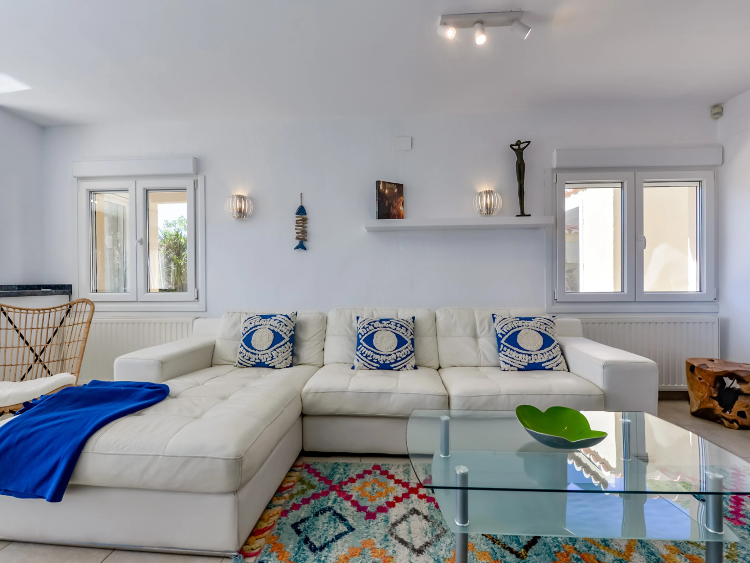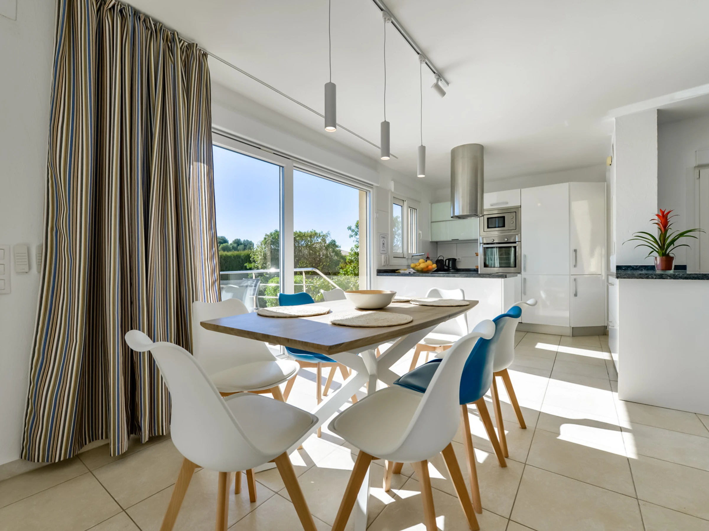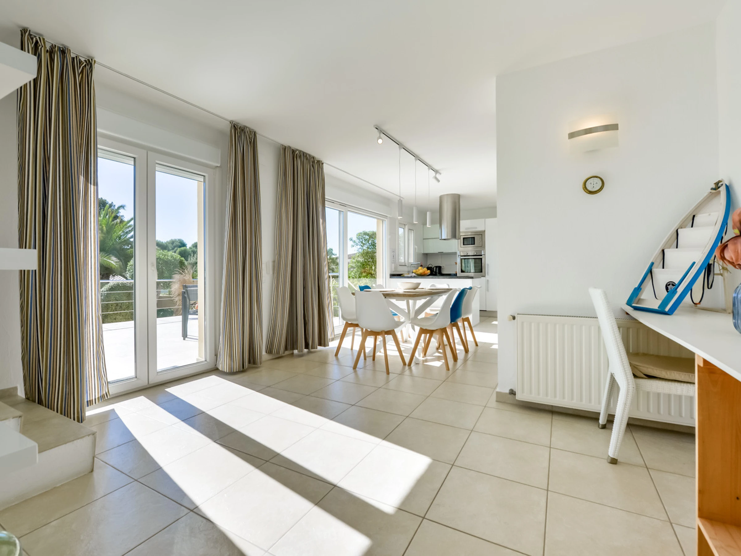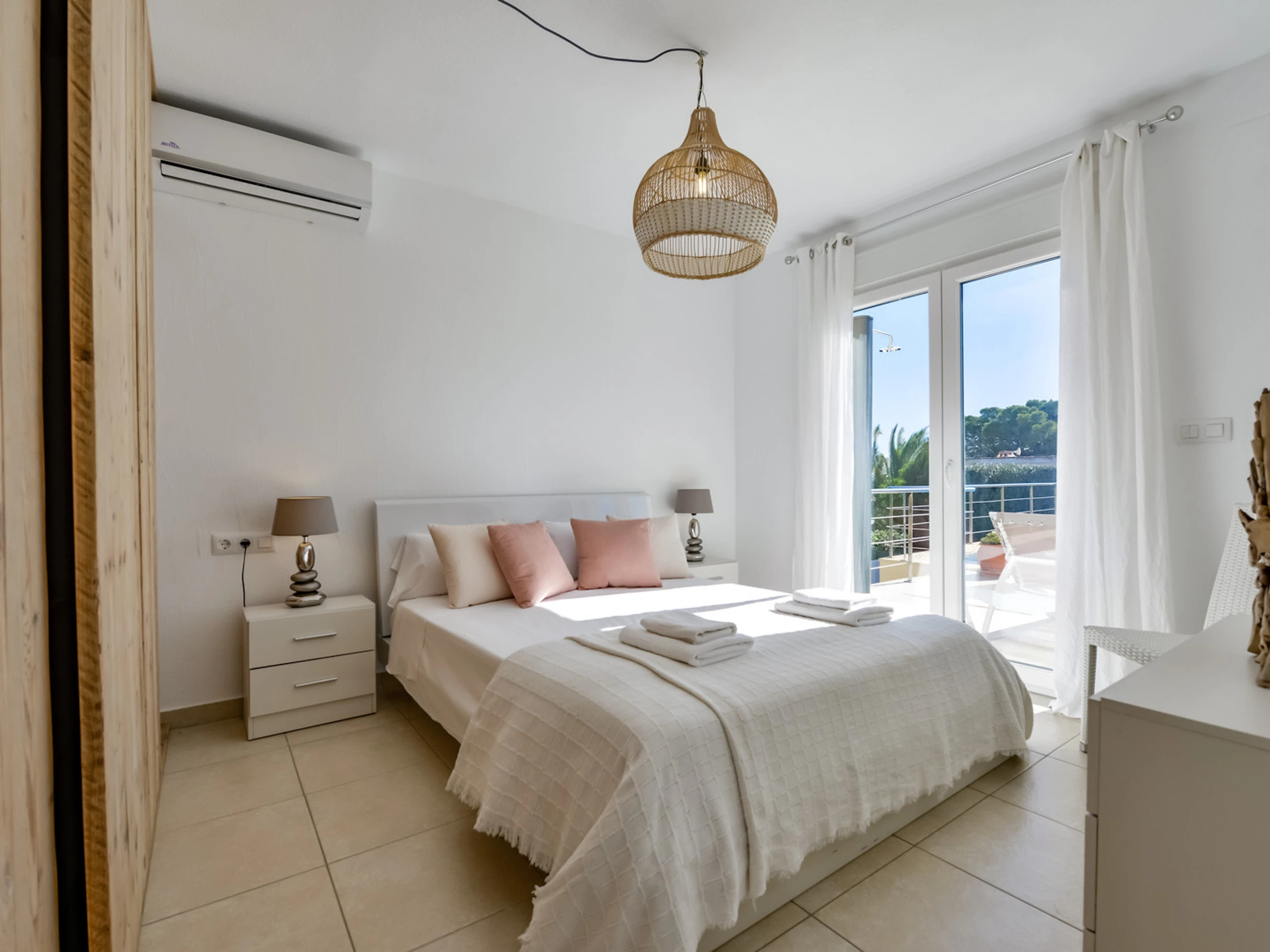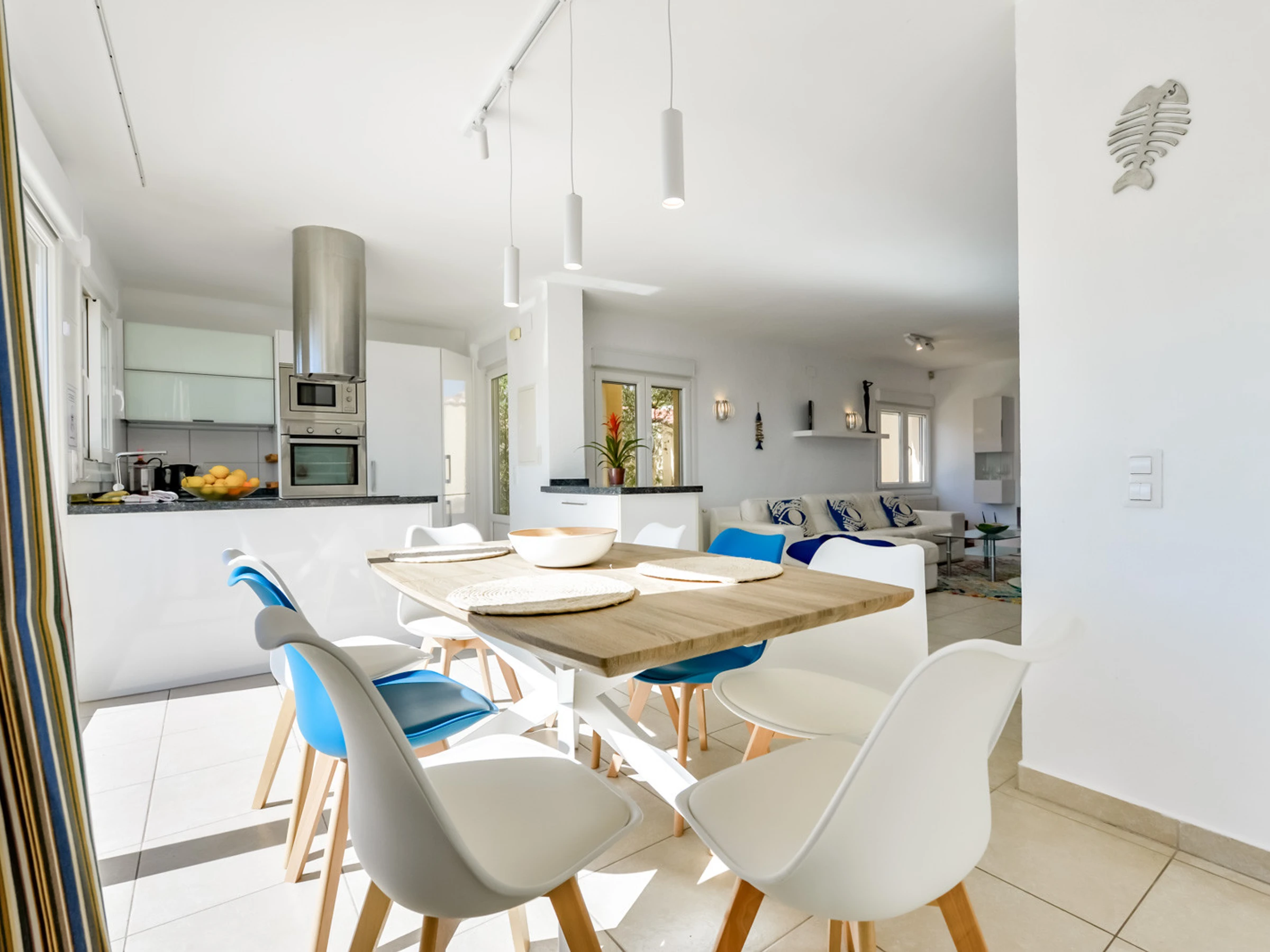 Die Villa mit ihren 180 m2 sorgfältig eingerichteter Fläche verteilt sich auf zwei Etagen, die durch eine komfortable Innentreppe verbunden sind. Im Erdgeschoss empfängt Sie ein helles gemütlichen Sofas und einem Tisch für Familienabende und Mahlzeiten. Die moderne, voll ausgestattete Küche wartet auf Feinschmecker, während drei Schlafzimmer mit Doppelbetten und zwei Bäder mit Dusche einen gemütlichen und eleganten Raum im Hauptgeschoss bieten.