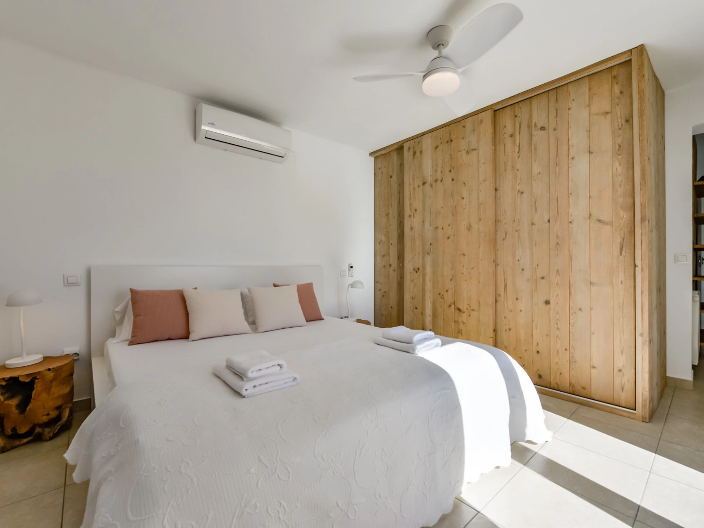 Über eine angenehme Innentreppe gelangt man zu einem geräumigen Schlafzimmer mit Doppelbett, Klimaanlage und einem großen Badezimmer mit Dusche und Badewanne. Die private Terrasse im Obergeschoss bietet eine exklusive Ecke, um den atemberaubenden Meerblick zu genießen und unter dem Sternenhimmel zu entspannen.