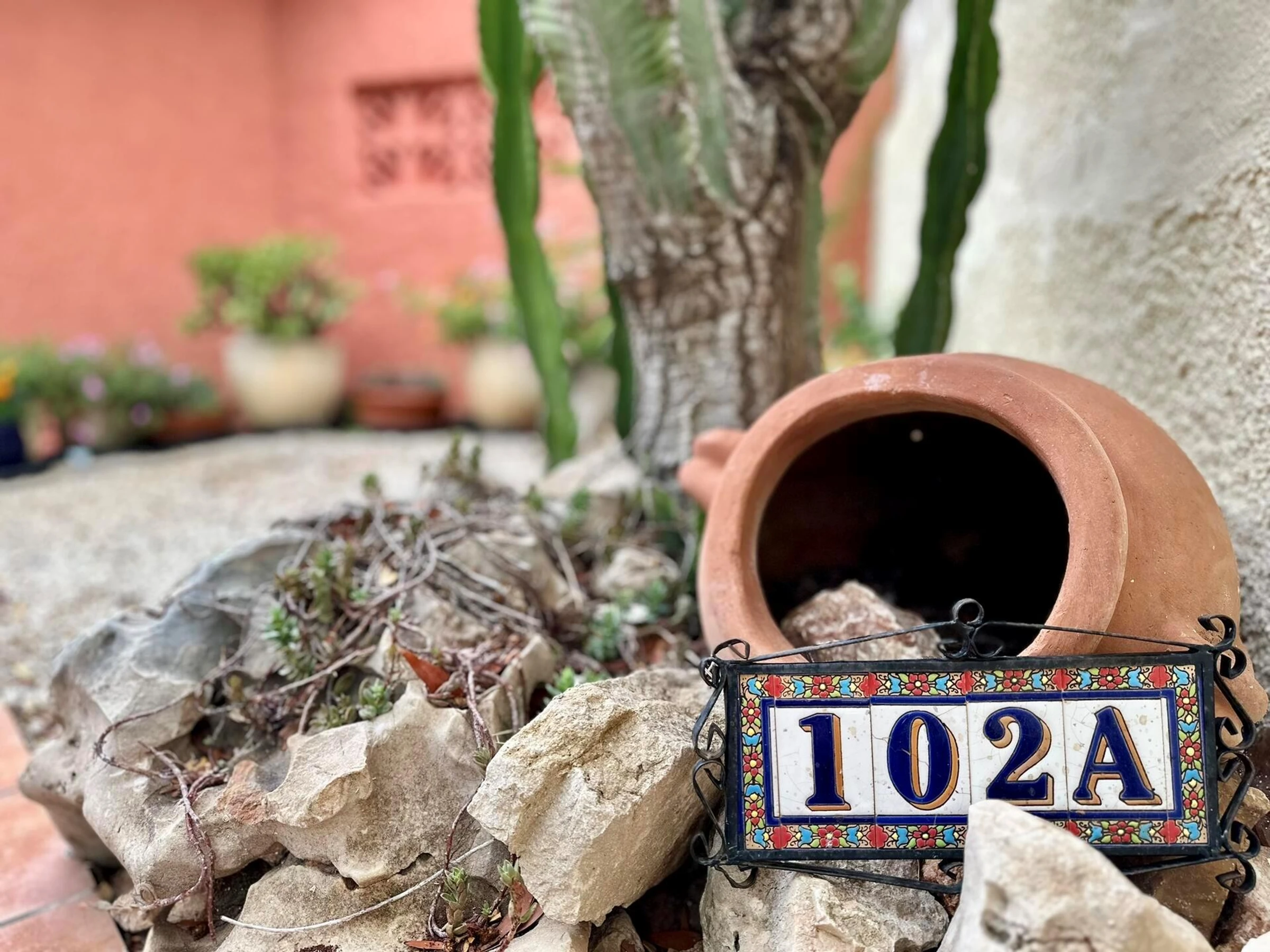 einen Garten mit Kies und Bäumen sowie einen Blick auf das Meer. Die Nähe zum