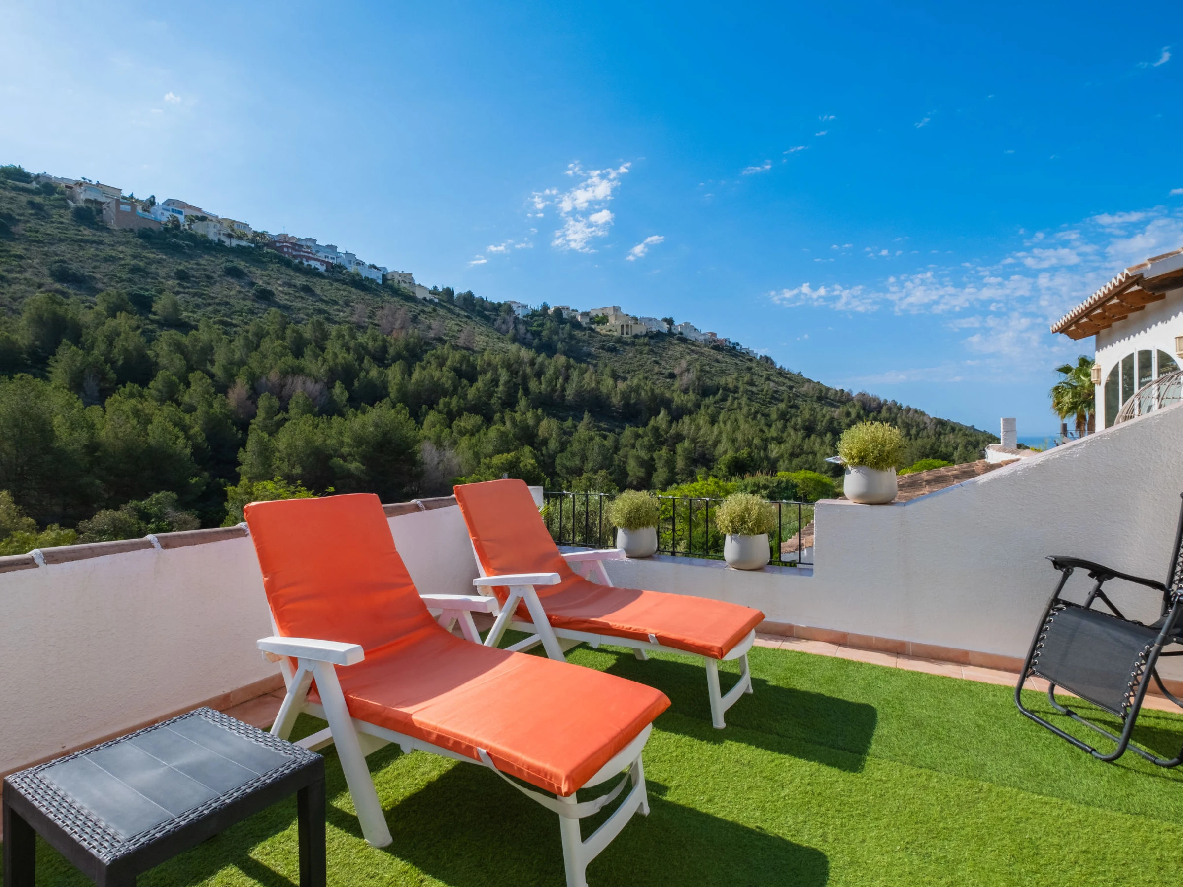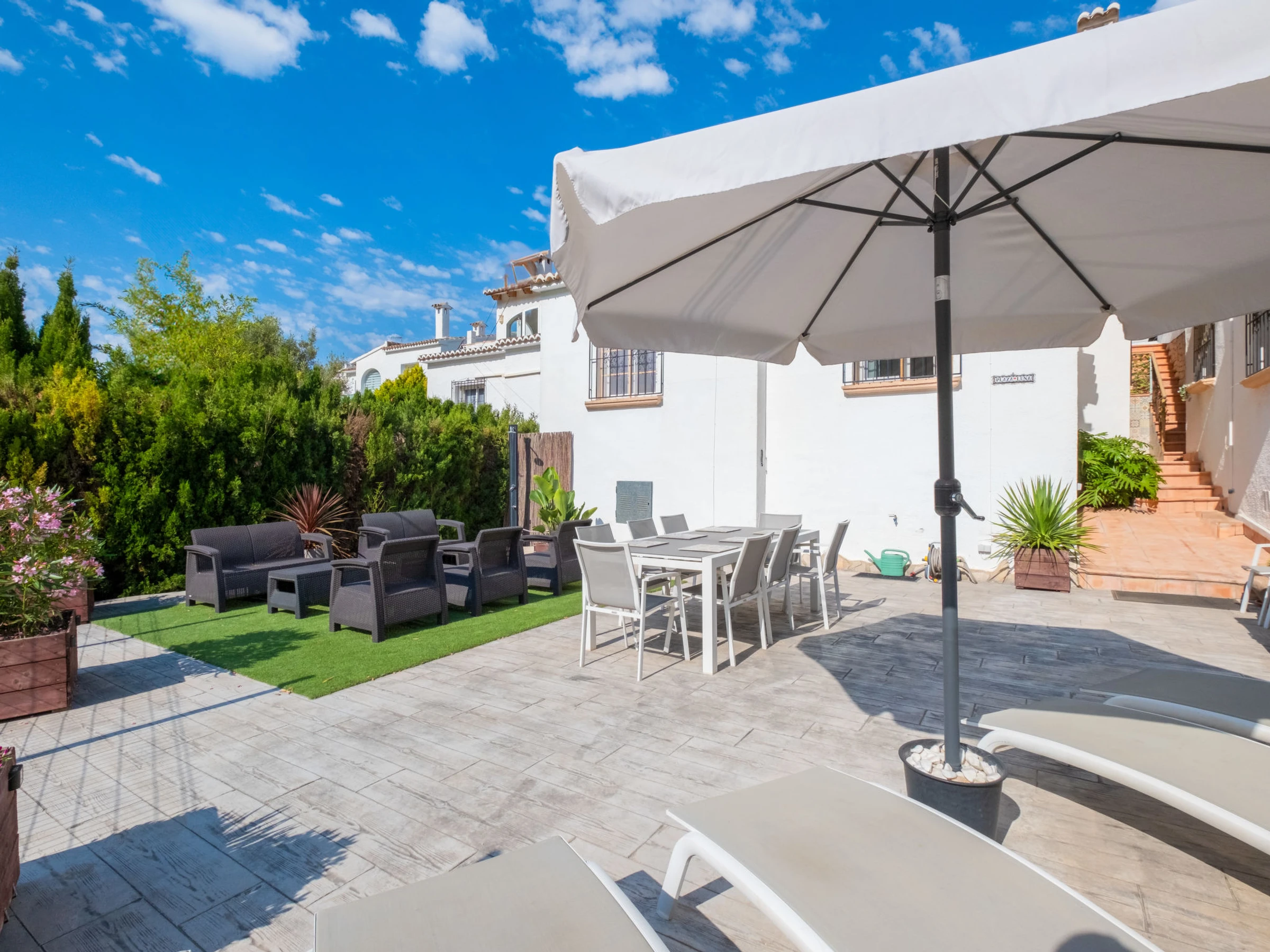 Golden Valley: Schöner Bungalow "Luna", auf 2 Stockwerken. 3 km vom Zentrum von Moraira, 2 km vom Zentrum von Cumbre del Sol, ruhige, sonnige Lage im Villenviertel, verkehrsberuhigte Zone, 5 km vom Meer, 5 km vom Strand. Zur Mitbenutzung: Grundstück (eingezäunt), Garten (eingezäunt) mit Rasen, Schwimmbad (20 x 11 m, saisonale Verfügbarkeit: [hidden] - [hidden] mit Innentreppe. Aussendusche. Zur Alleinbenutzung: Aussendusche, Terrasse (100 m2), Gartenmöbel. Lebensmittelgeschäft 3 km, Supermarkt 3 km, Restaurant 2 km, Bushaltestelle 4 km, Sandstrand "Playa L'Ampolla" 5 km. Sporthafen 5 km, Jacht-Hafen 5 km, Golfplatz (12 Loch) 7 km. Nahe gelegene Sehenswürdigkeiten: Aqualandia, Mundomar, Terra Mítica, Terra Natura, Benidorm Palace (Benidorm), Les Fonts de l'Algar, Castillo de Guadalest. Der Besitzer akzeptiert keine Jugendgruppen.