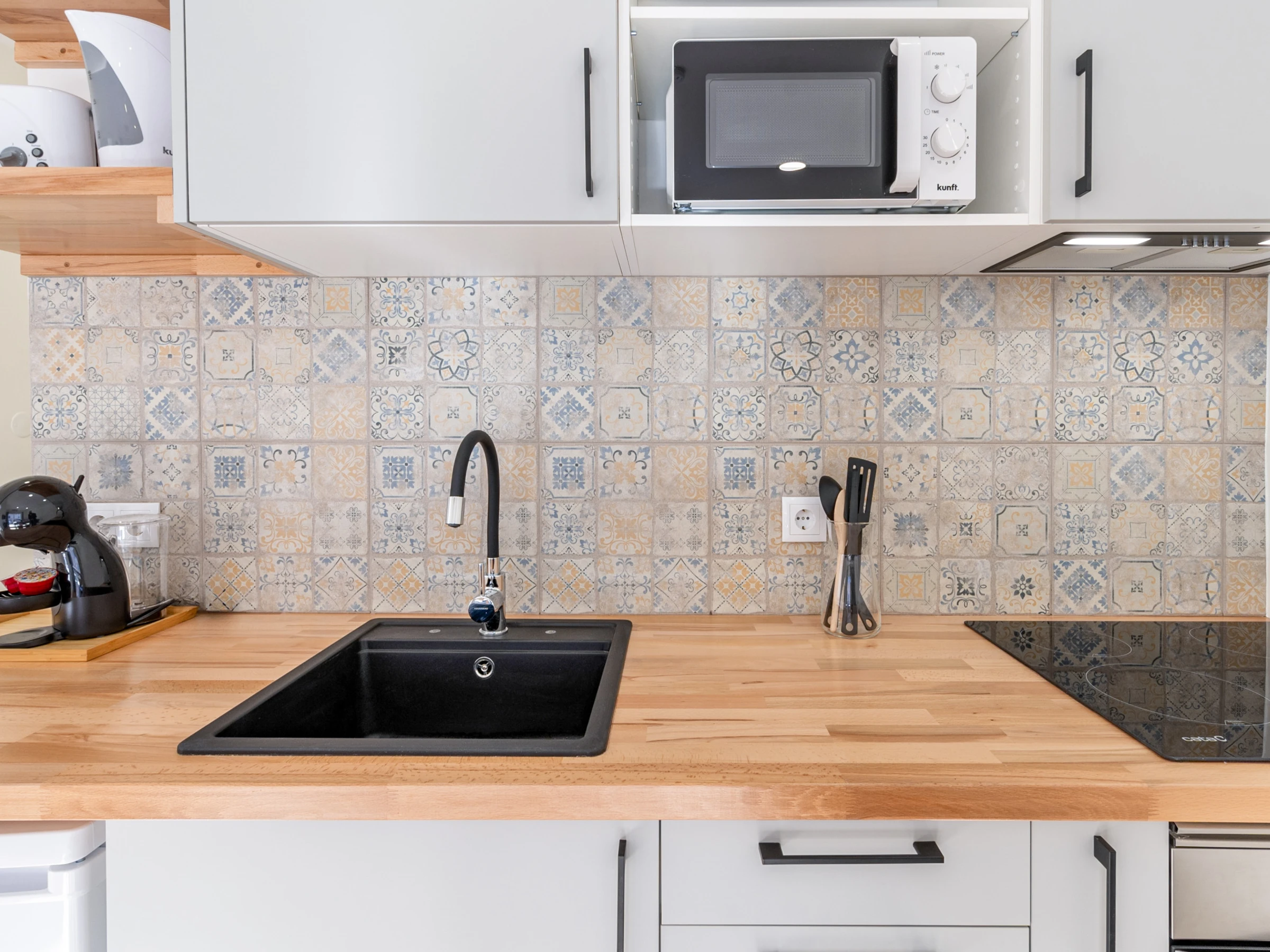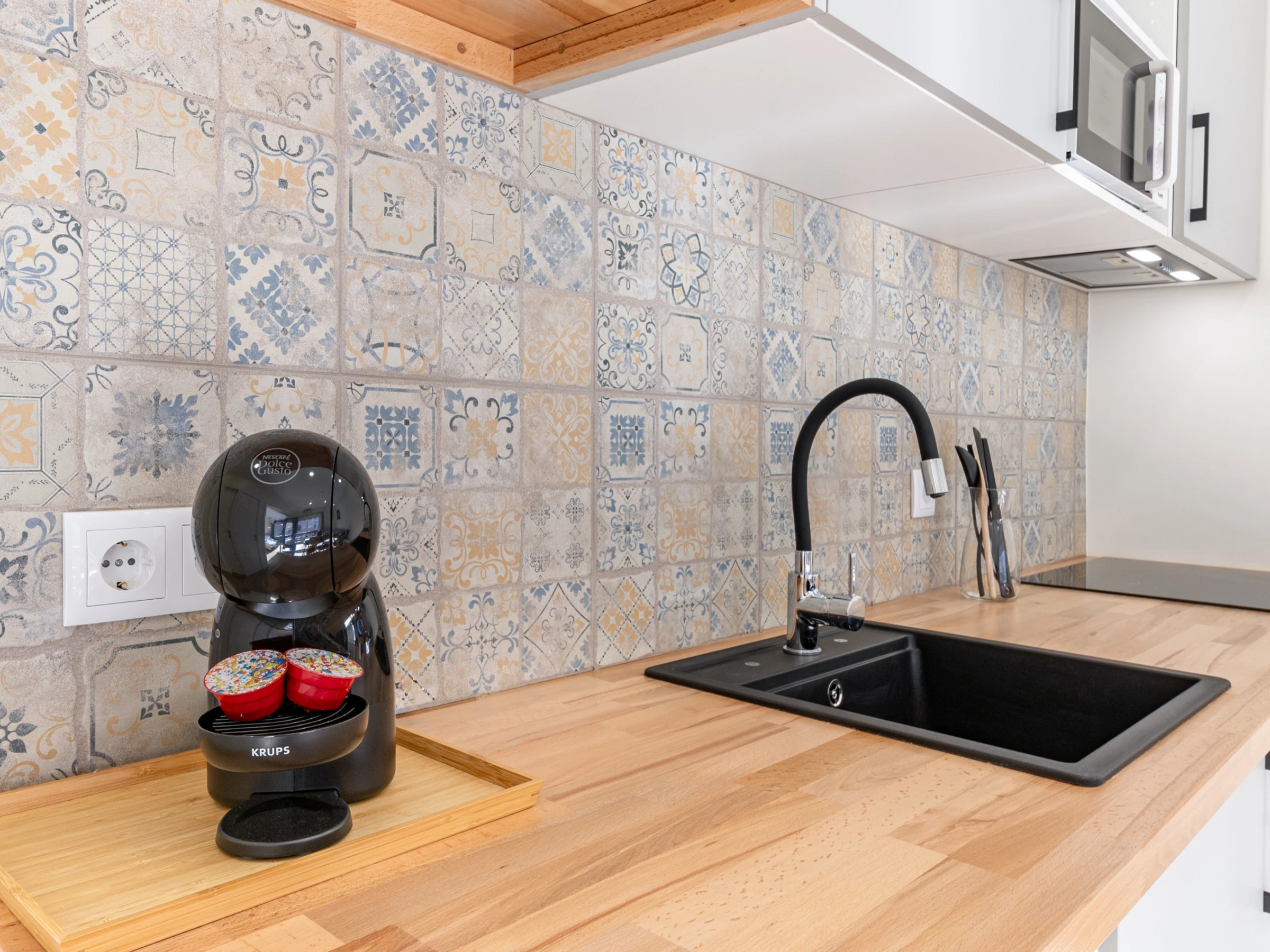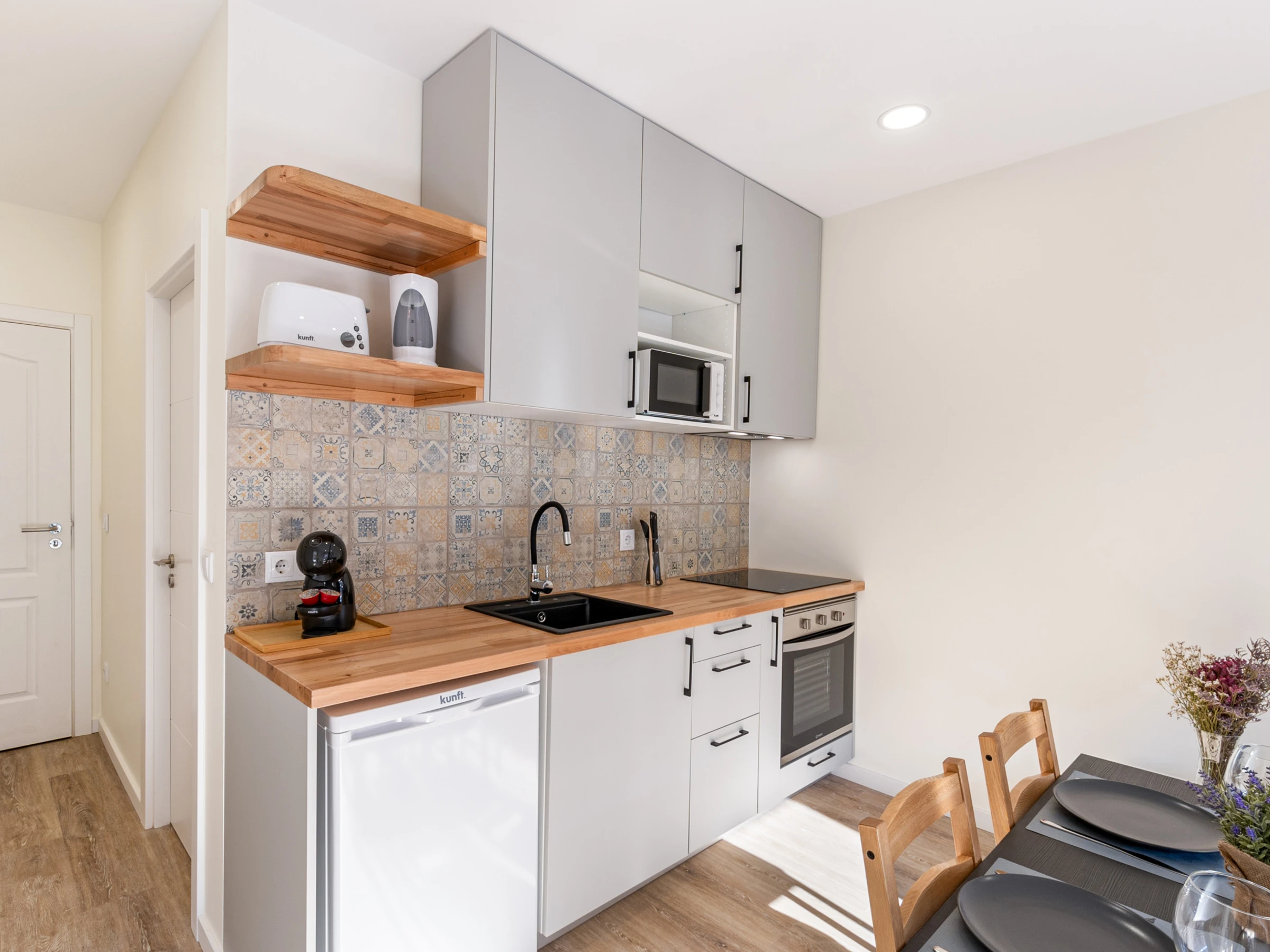 Dieses offene küche, elektrisches kochfeld, ist ausgestattet in kühlschrank, mikrowelle, backofen, gefrierschrank, geschirr/besteck, kochutensilien, kaffeemaschine, toaster und wasserkocher.