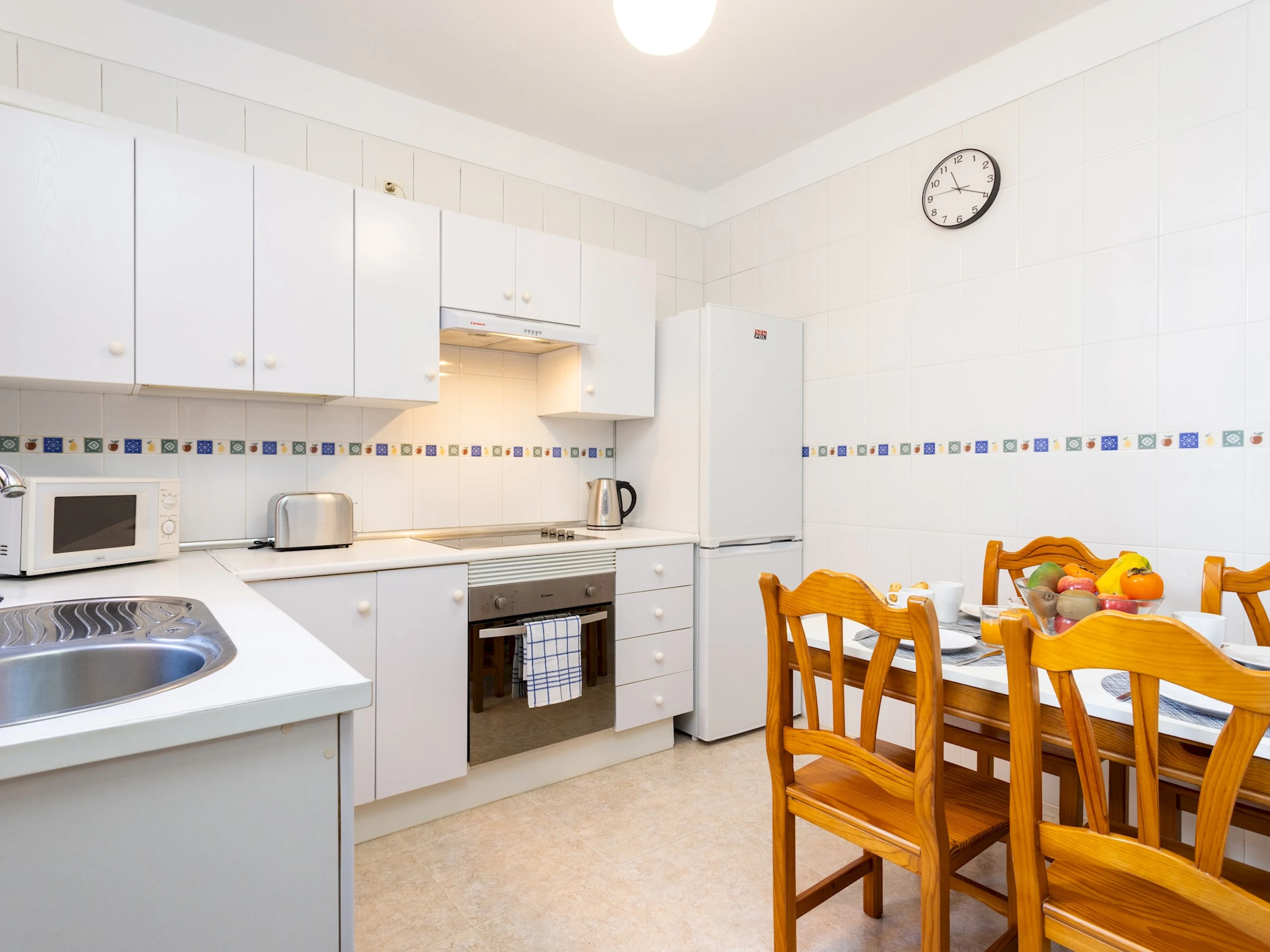 Dieses küche, ist ausgestattet in mikrowelle, backofen, kochutensilien, kaffeemaschine und toaster.