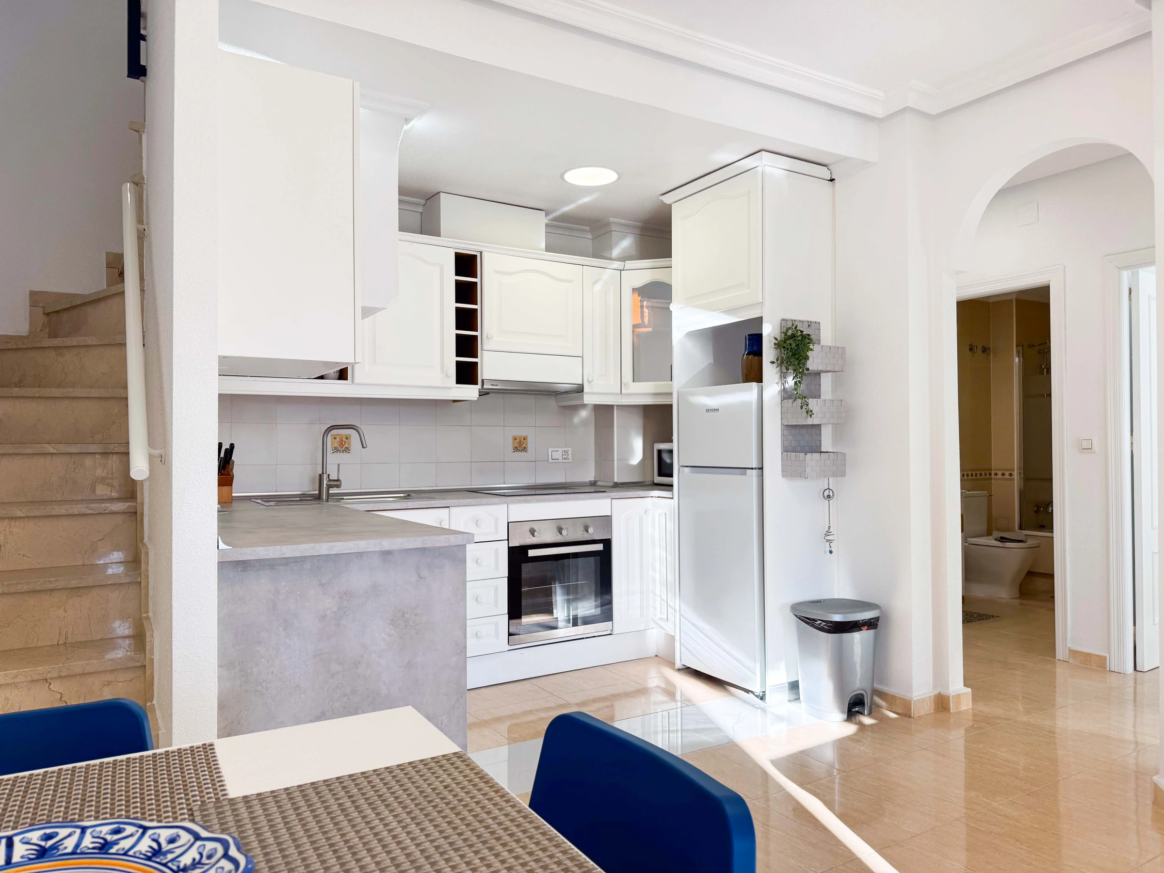Dieses offene küche, mit ceranfeld, ist ausgestattet in kühlschrank, mikrowelle, backofen, gefrierschrank, geschirr/besteck, kochutensilien, kaffeemaschine, toaster und wasserkocher.