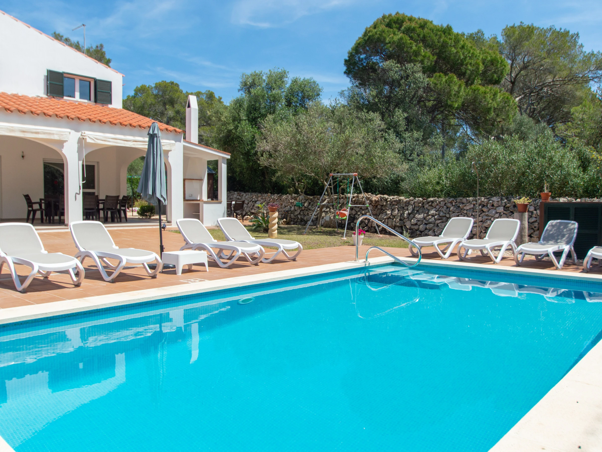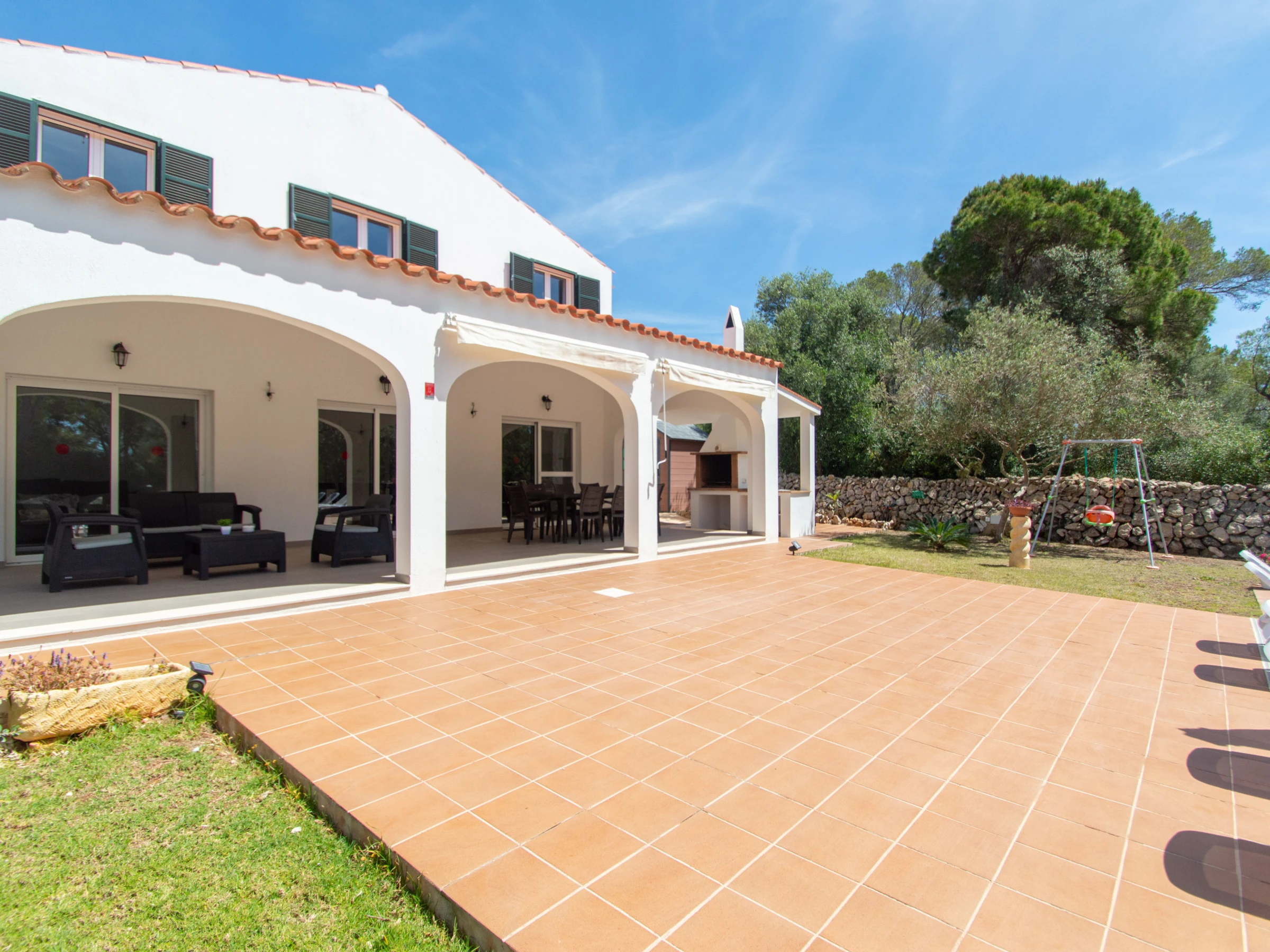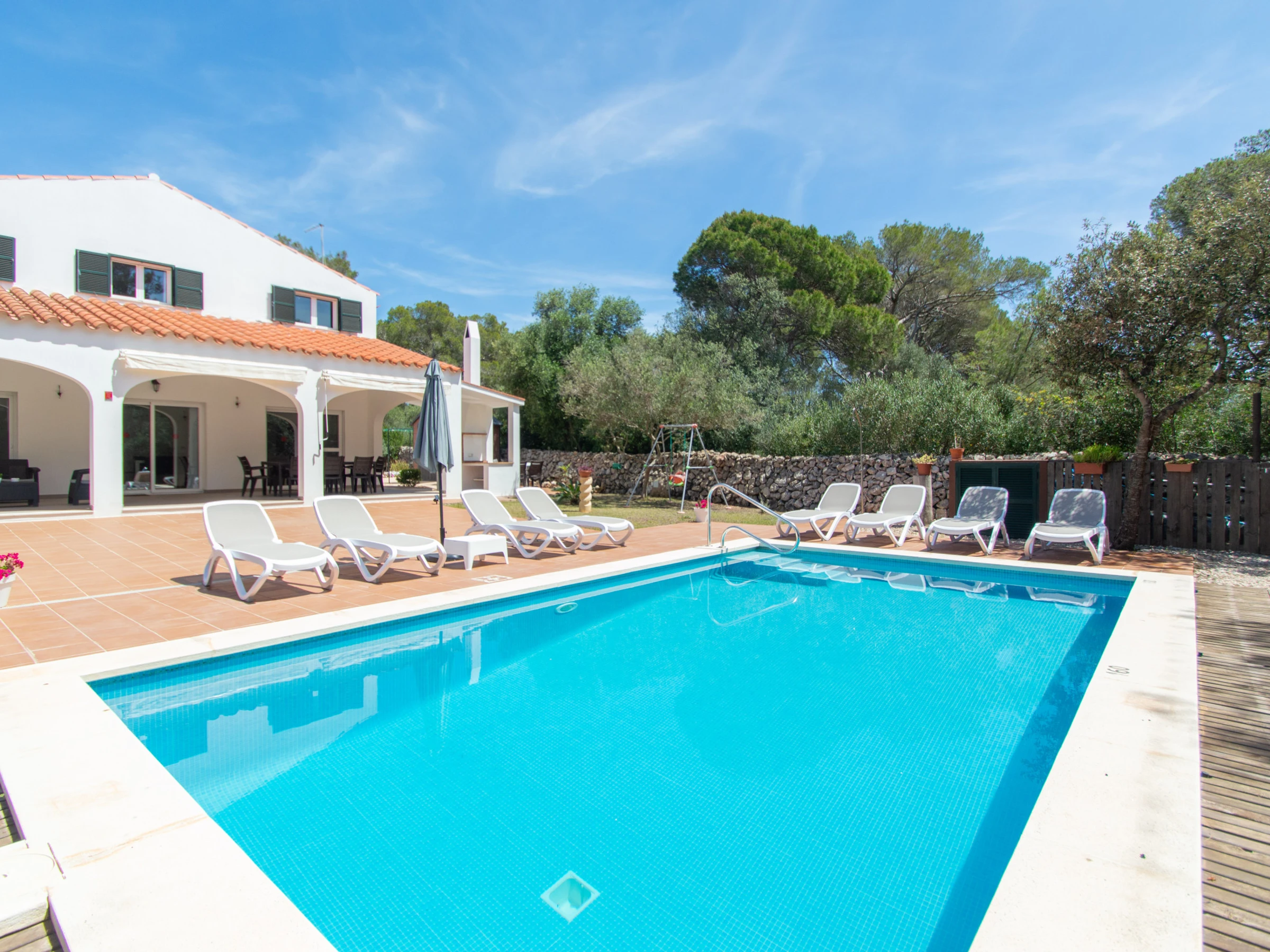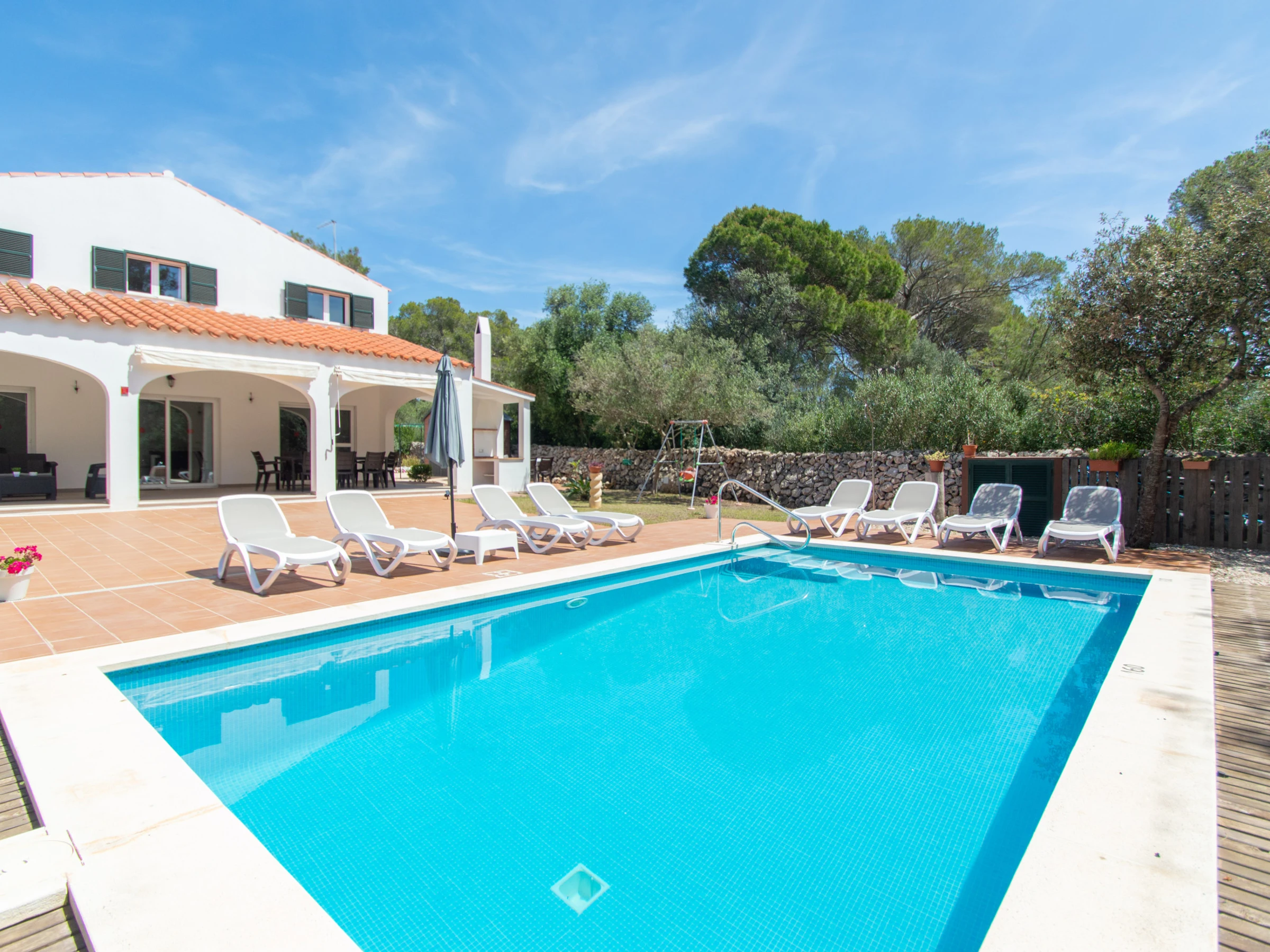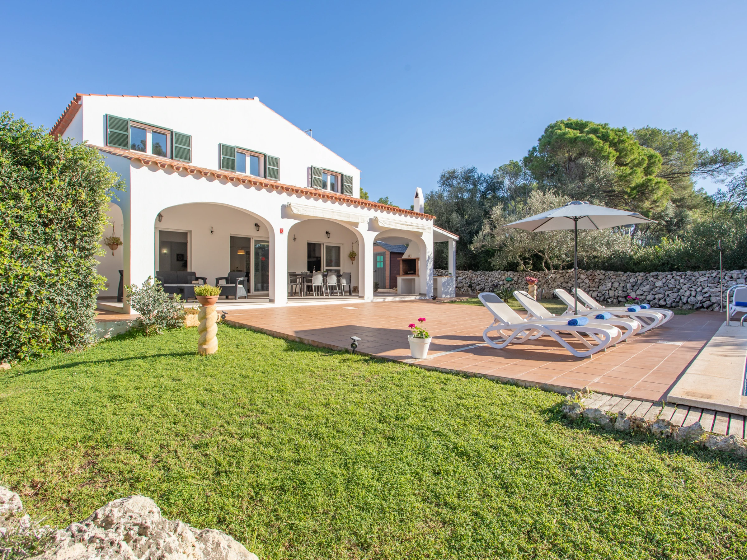 Das Äußere der Villa zur Miete auf Menorca ist der private Pool, der Grill und die Terrasse mit einem großen Gartenbereich. Es verfügt über acht Hängematten, einen Sonnenschirm und alle notwendigen Gartenmöbel, um die Sonne, den Pool sowie Mahlzeiten und Abende im Freien zu genießen. Auf der hinteren Terrasse gibt es auch Platz zum Aufhängen von Kleidung.