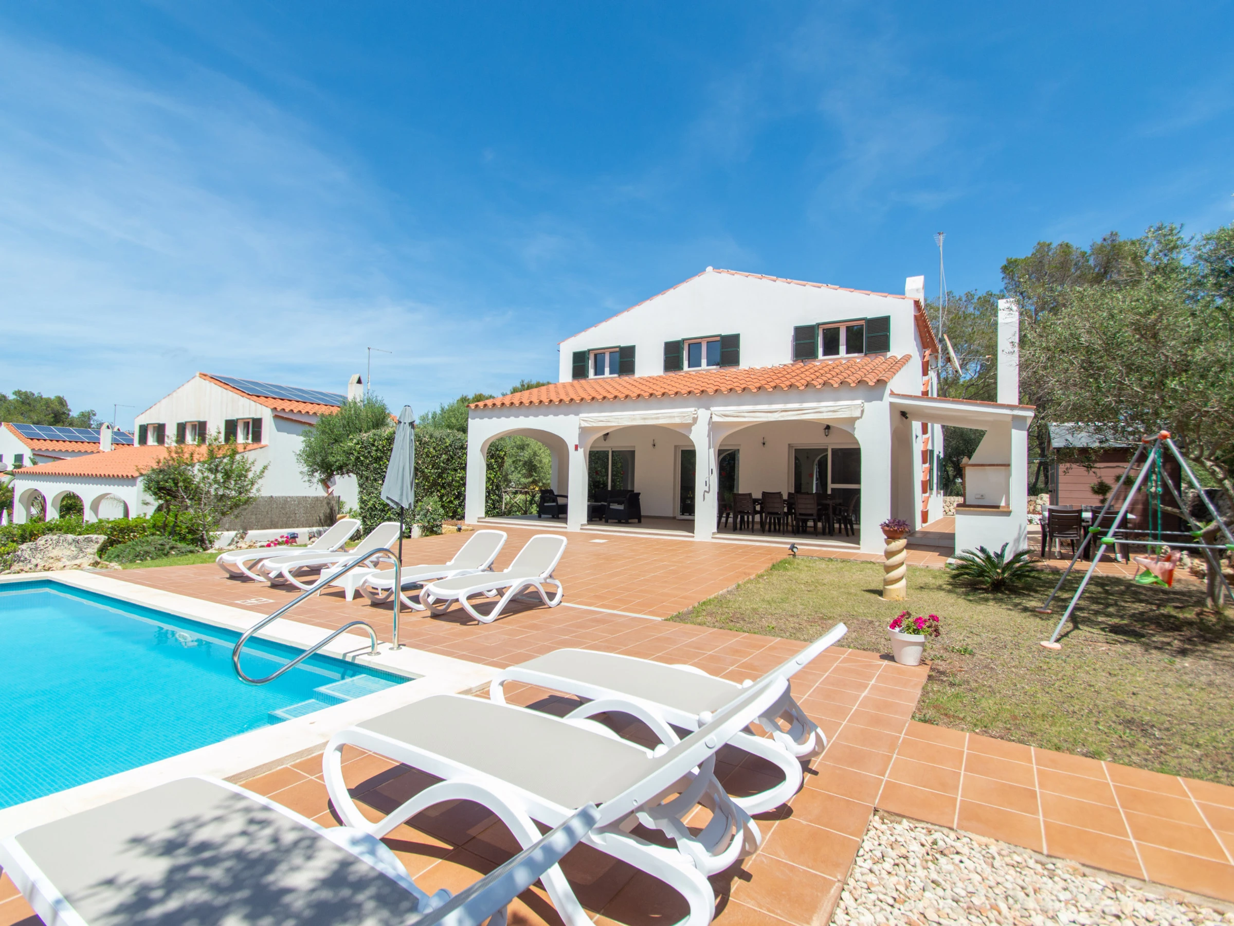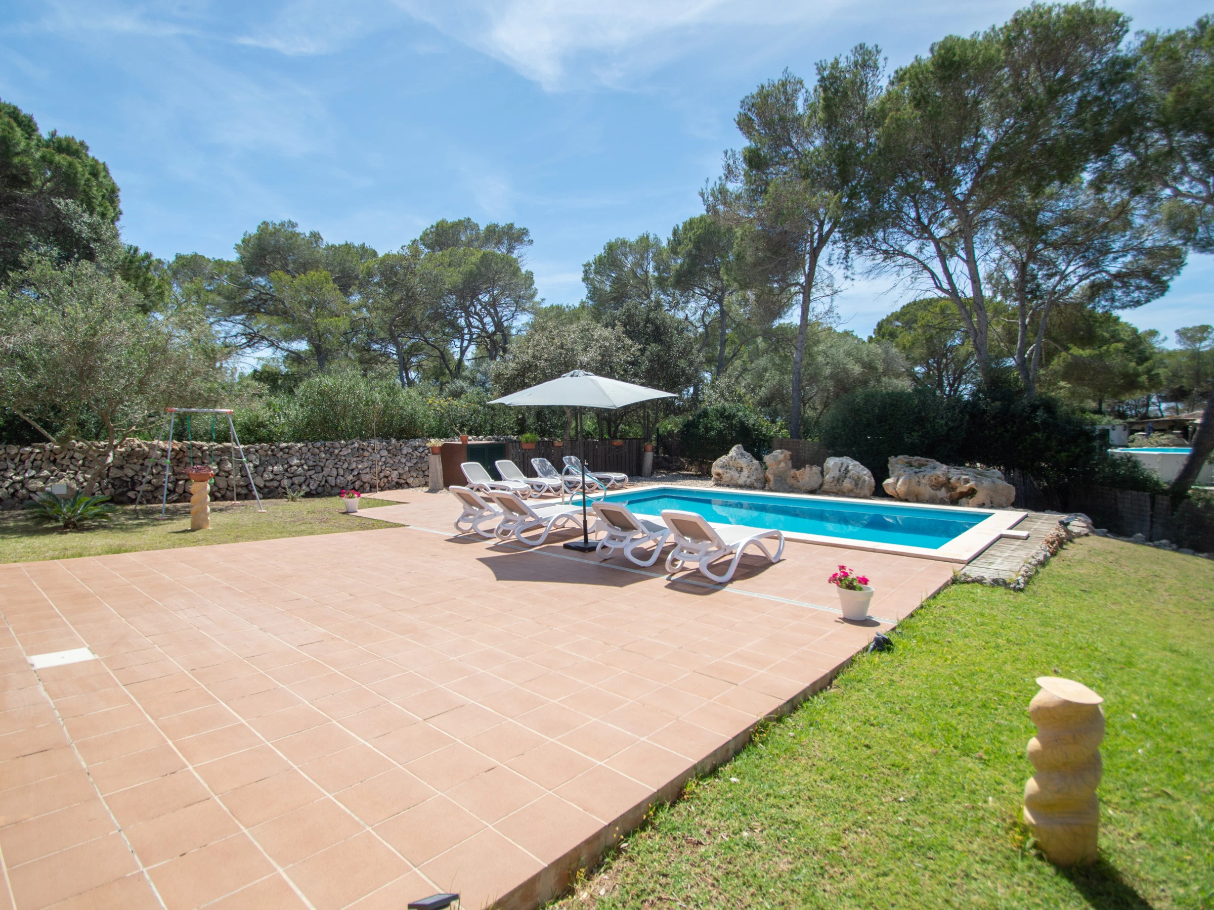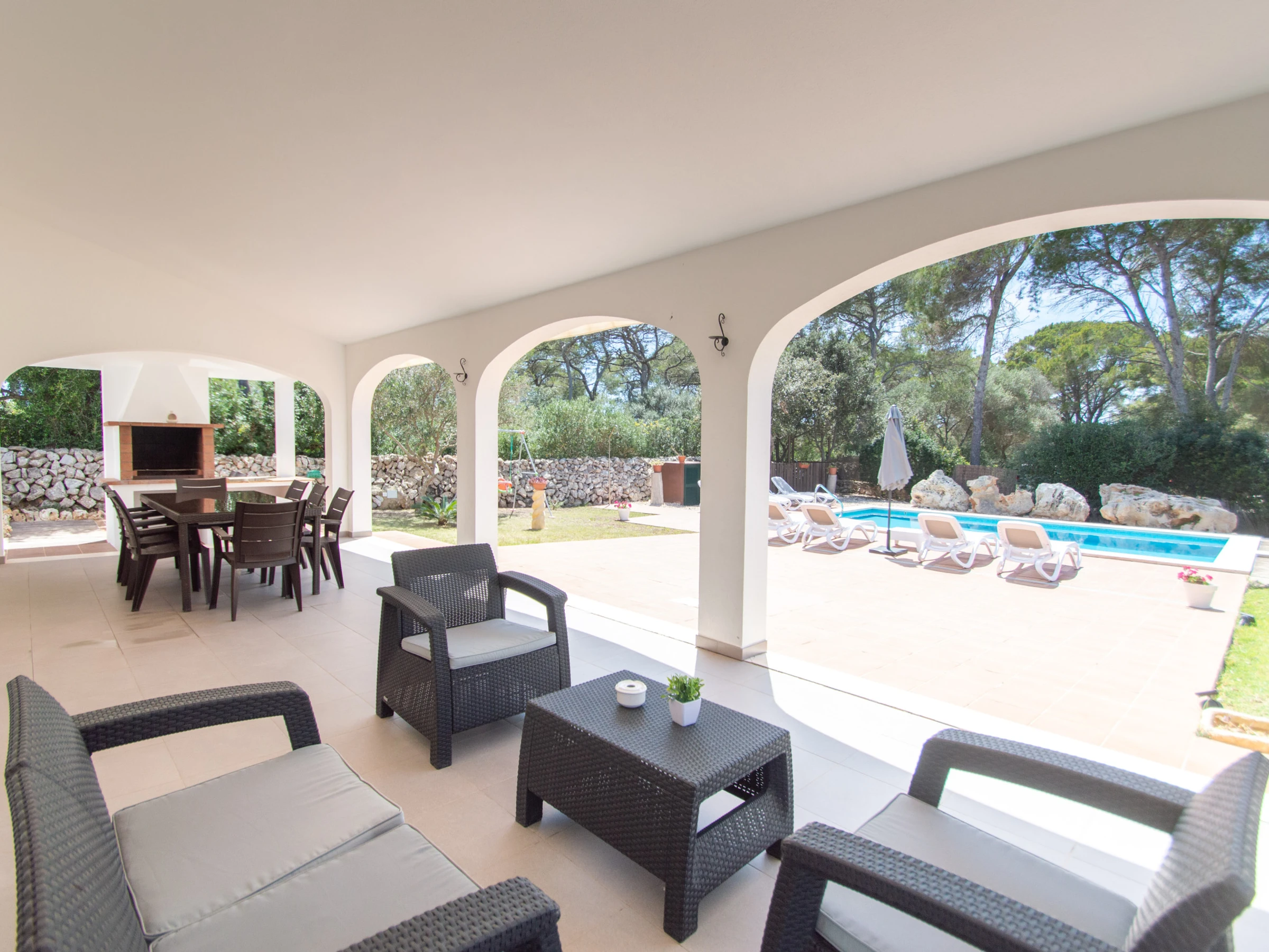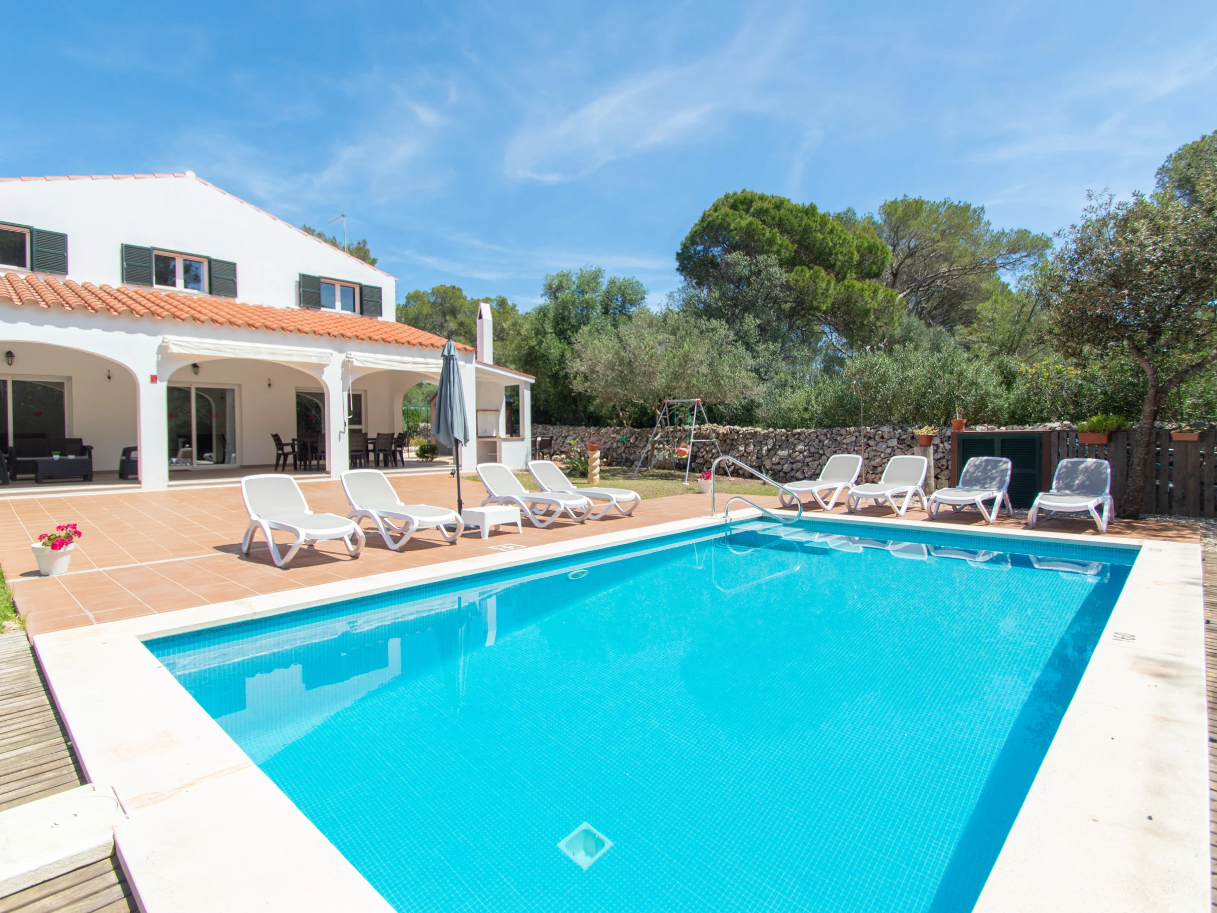Das Äußere der Villa zur Miete auf Menorca ist der private Pool, der Grill und die Terrasse mit einem großen Gartenbereich. Es verfügt über acht Hängematten, einen Sonnenschirm und alle notwendigen Gartenmöbel, um die Sonne, den Pool sowie Mahlzeiten und Abende im Freien zu genießen. Auf der hinteren Terrasse gibt es auch Platz zum Aufhängen von Kleidung.