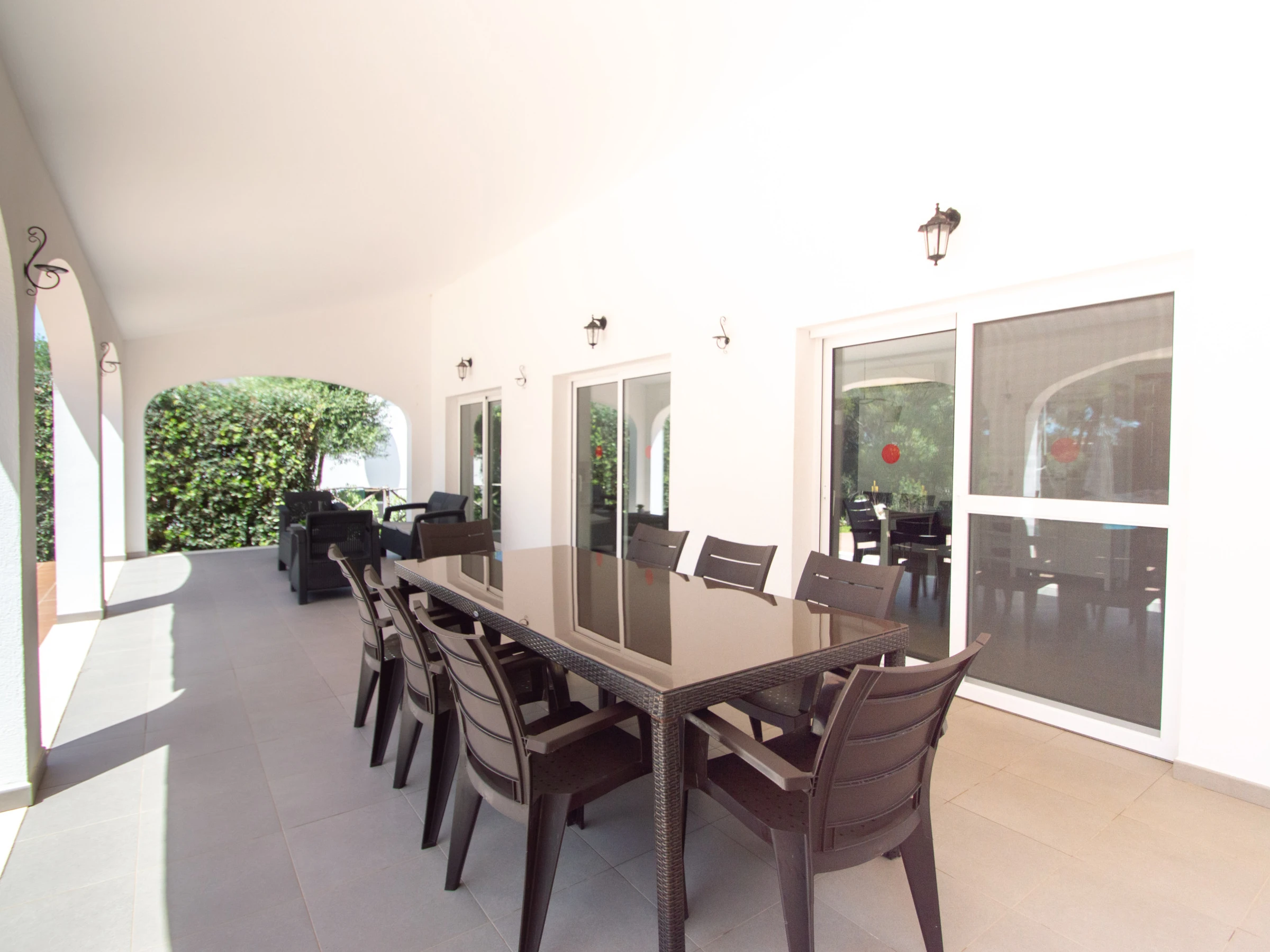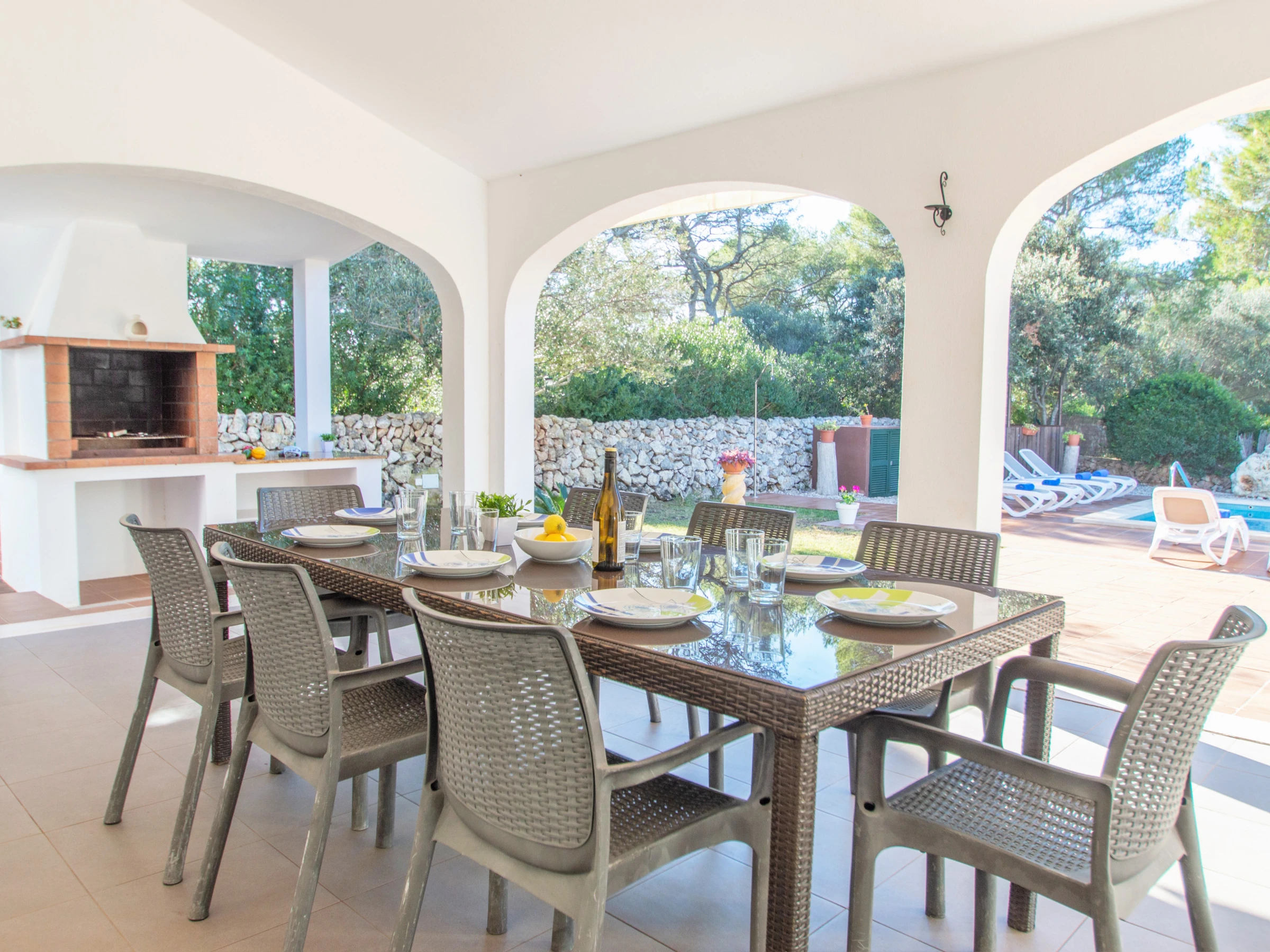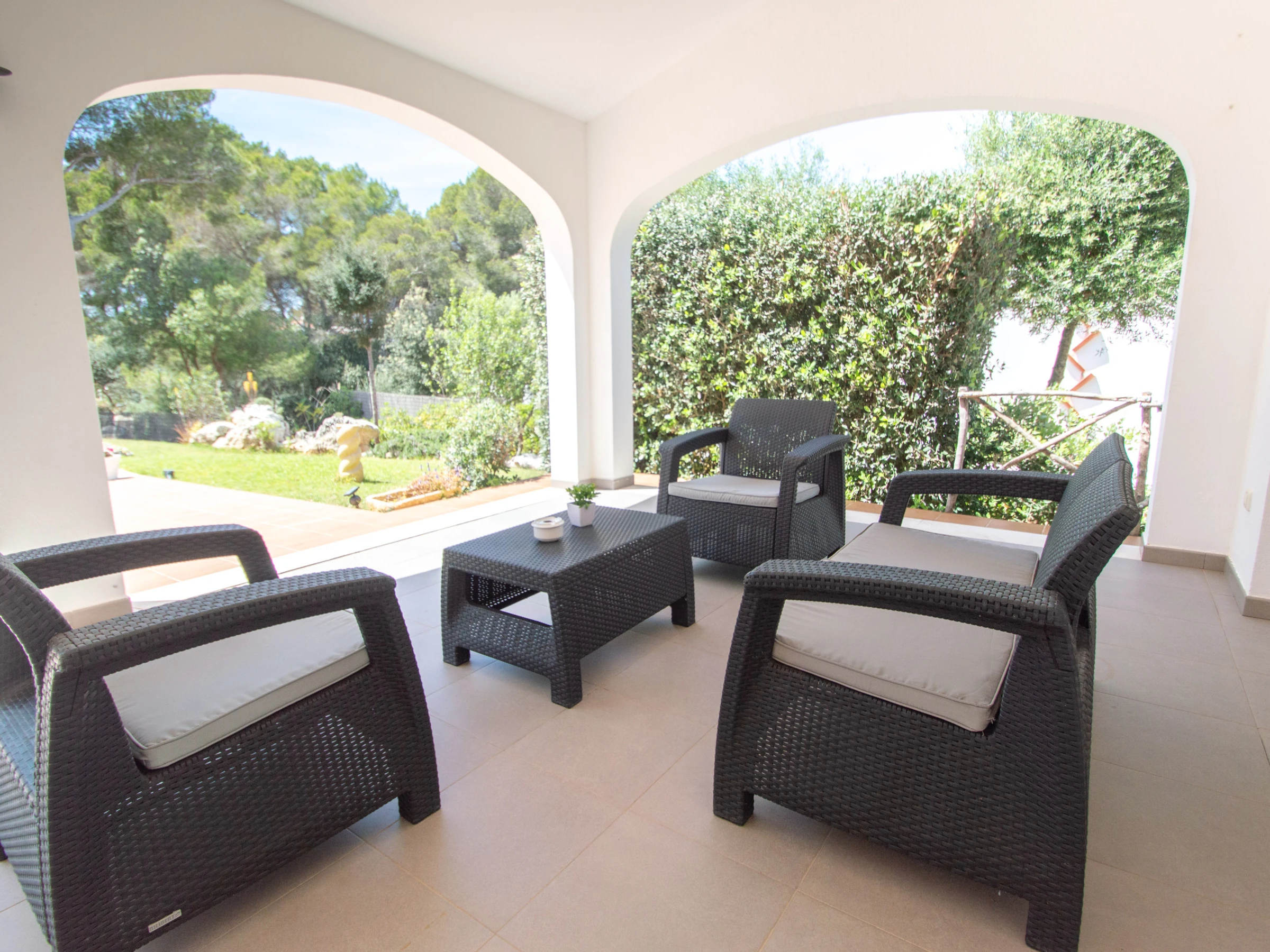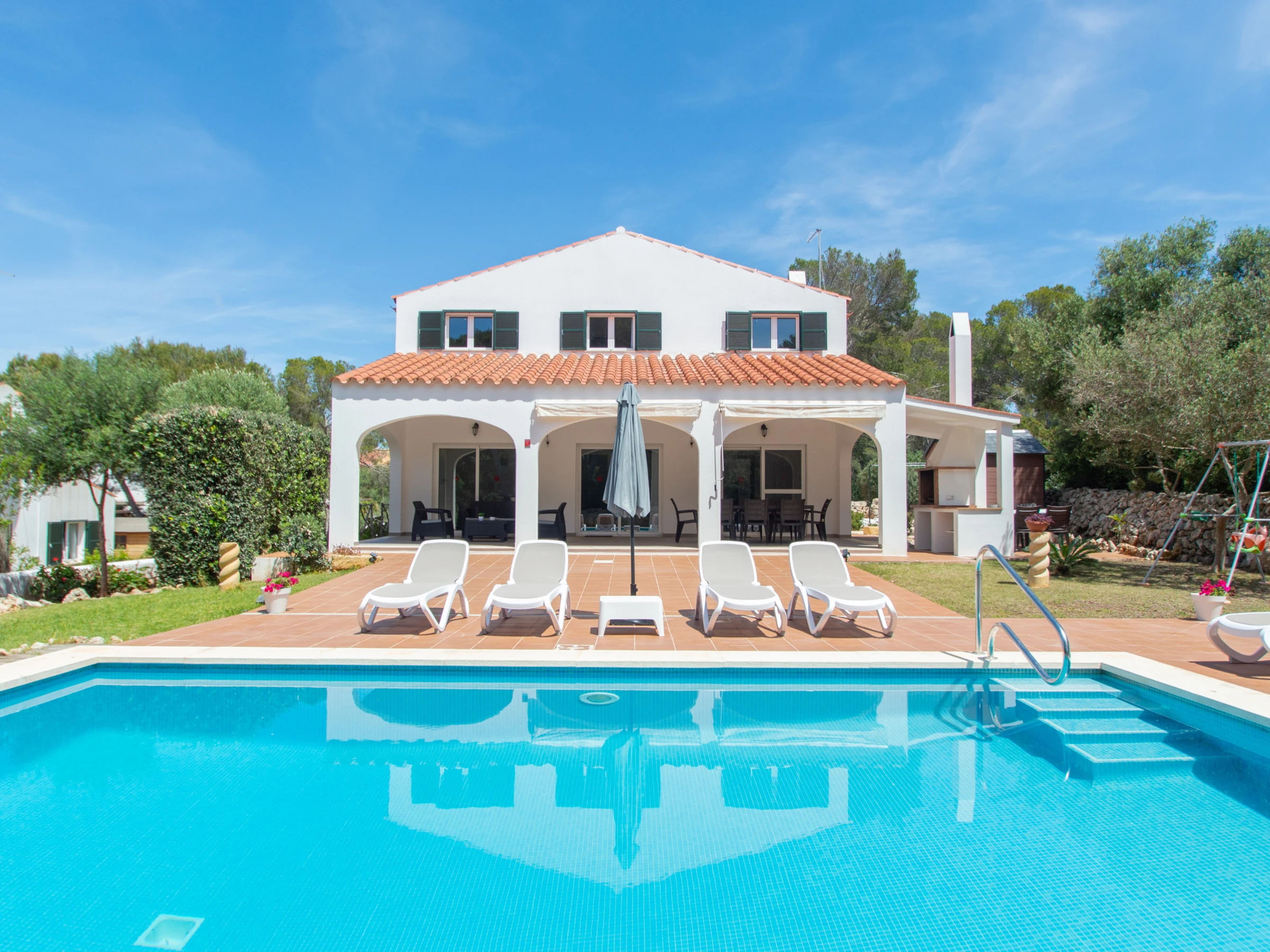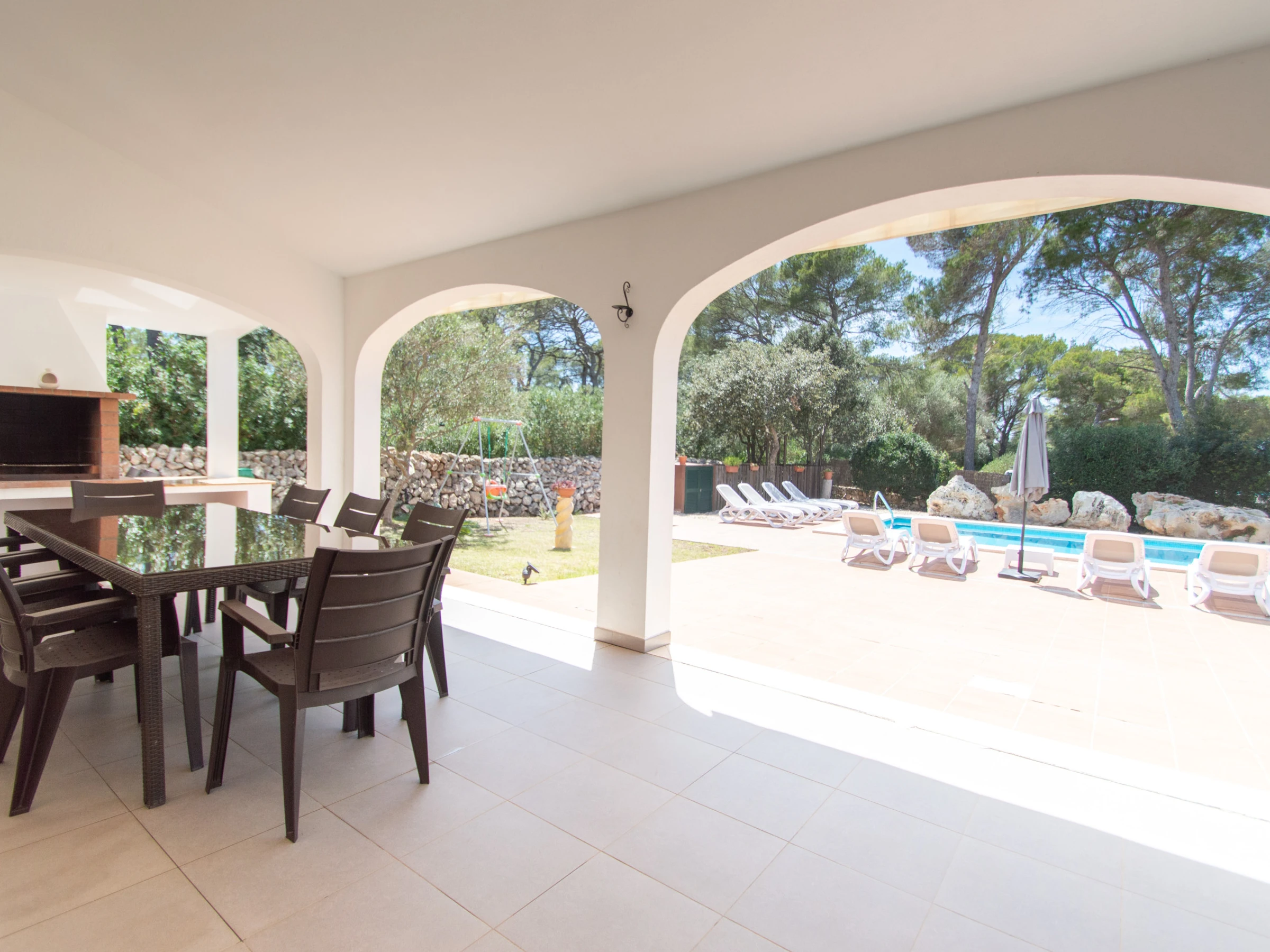 Das Äußere der Villa zur Miete auf Menorca ist der private Pool, der Grill und die Terrasse mit einem großen Gartenbereich. Es verfügt über acht Hängematten, einen Sonnenschirm und alle notwendigen Gartenmöbel, um die Sonne, den Pool sowie Mahlzeiten und Abende im Freien zu genießen. Auf der hinteren Terrasse gibt es auch Platz zum Aufhängen von Kleidung.