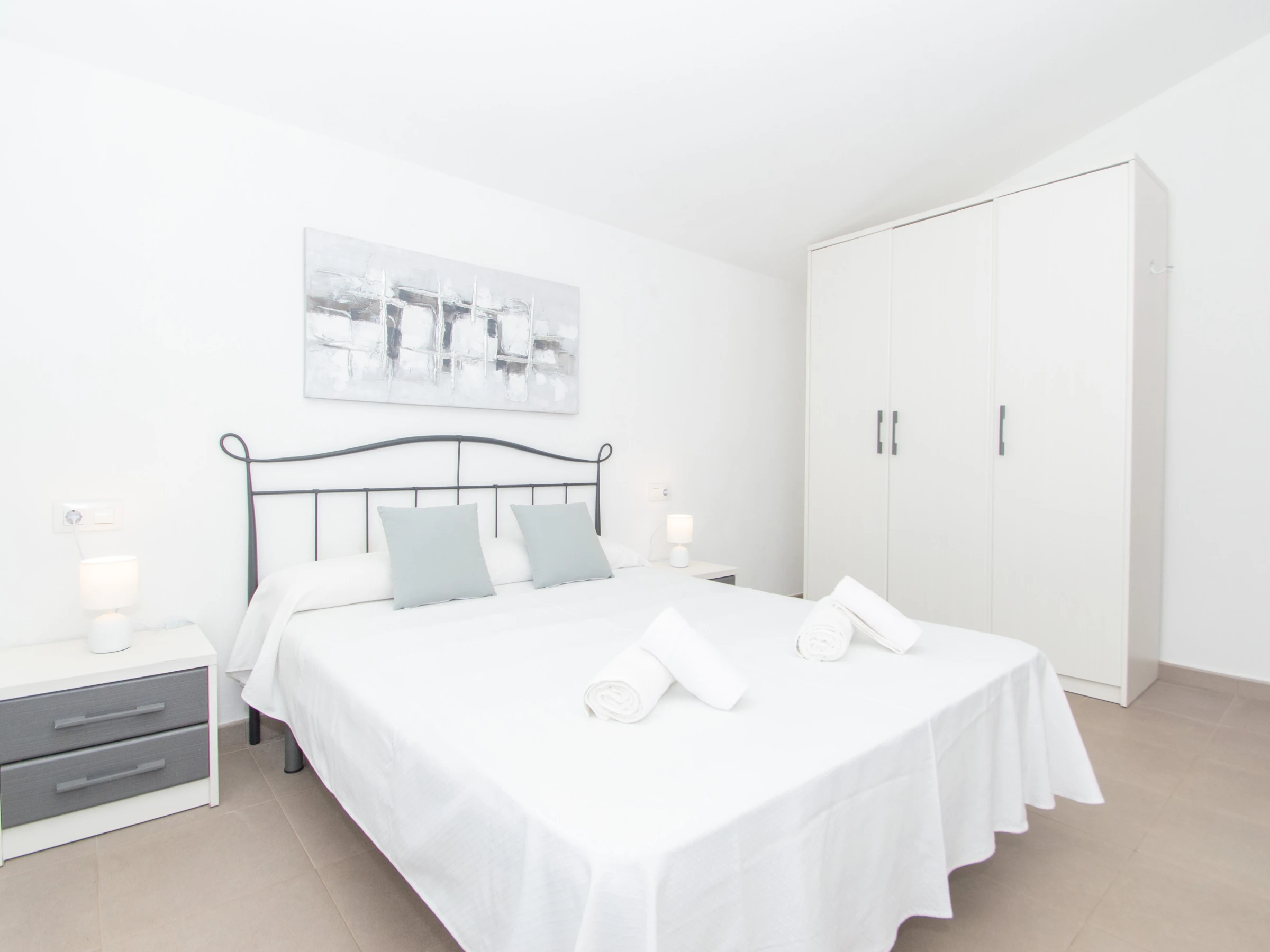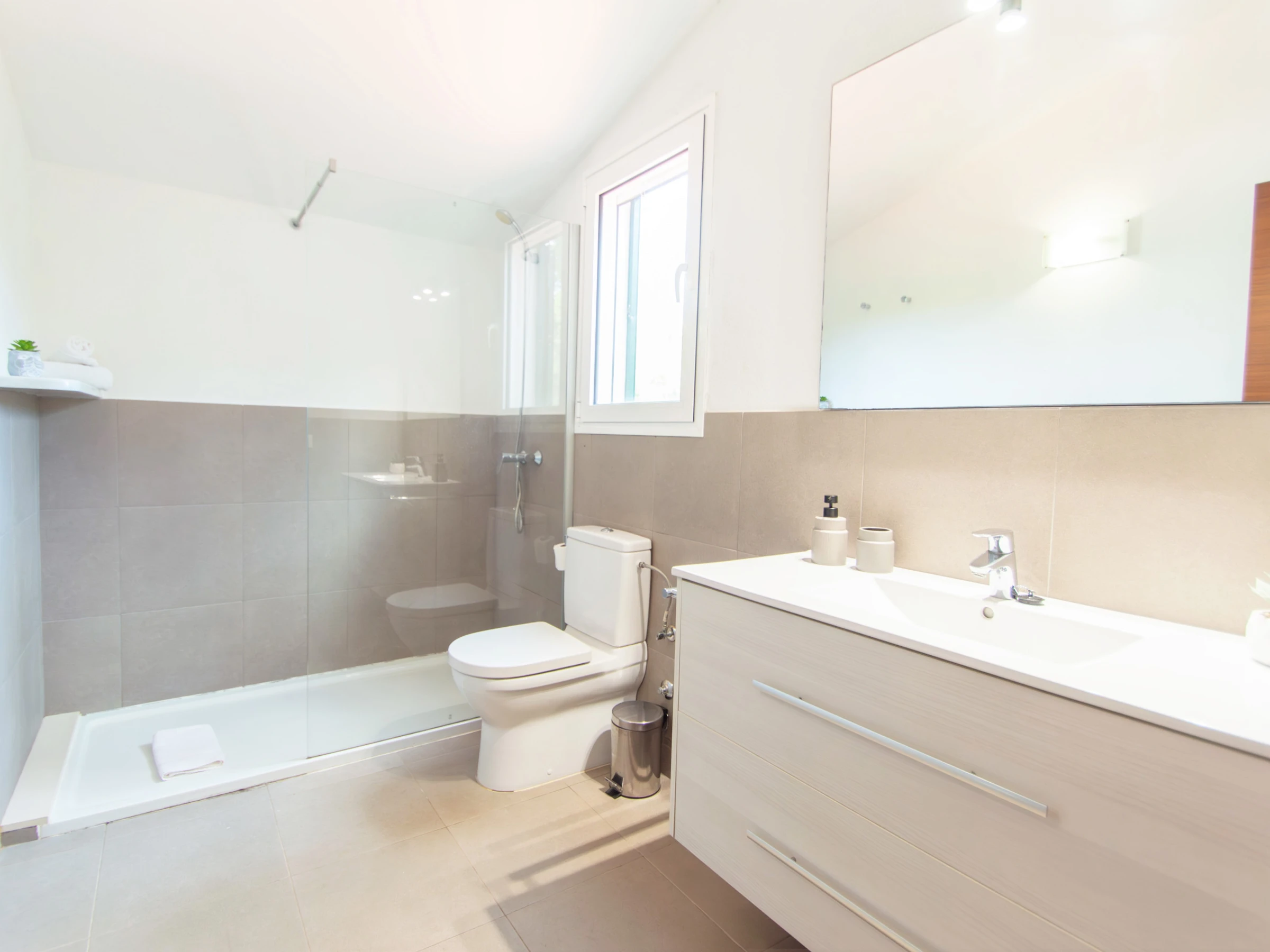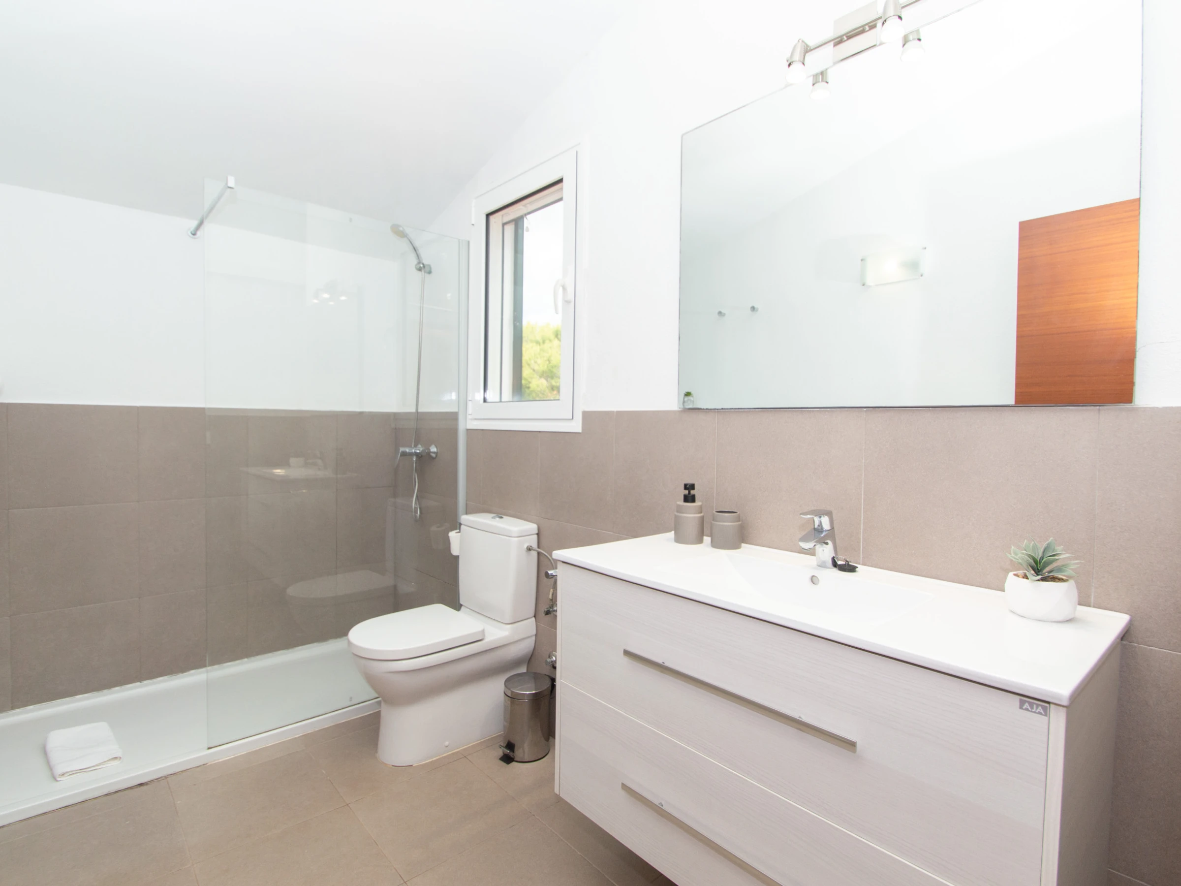 Im Obergeschoss befinden sich die weiteren drei Doppelzimmer. Das Hauptschlafzimmer ist mit einem Doppelbett, einem guten Kleiderschrank zur Aufbewahrung aller Kleidungsstücke und einer Klimaanlage ausgestattet. Das Badezimmer verfügt über eine große Duschwanne und einen Haartrockner. Das nächste Doppelzimmer ist mit zwei Einzelbetten, einem Kleiderschrank und einer Klimaanlage ausgestattet. Schließlich verfügt das dritte Schlafzimmer auch über zwei Einzelbetten, einen Schrank mit ausreichend Platz zum Aufbewahren von Kleidung und eine Klimaanlage. Das andere Badezimmer ist ebenfalls komplett mit einer Duschwanne ausgestattet.