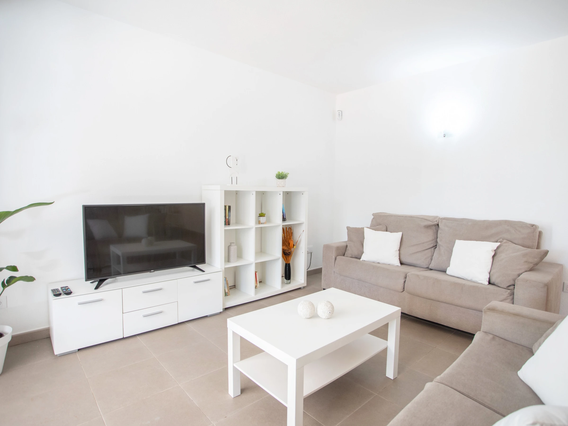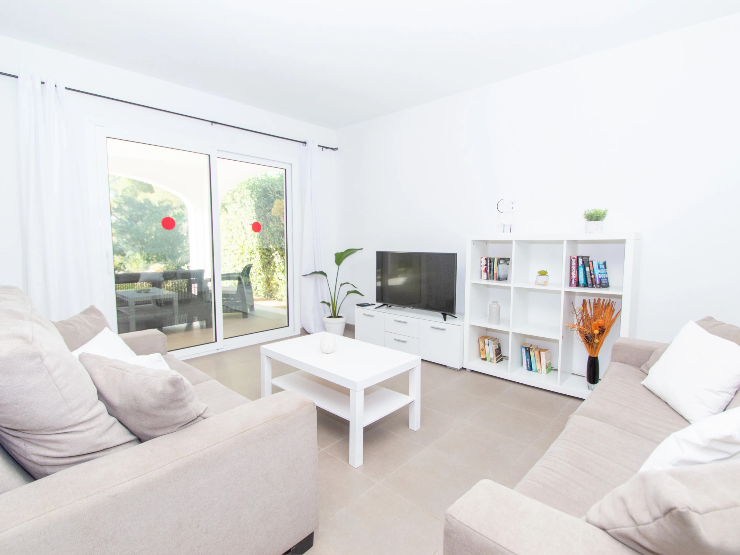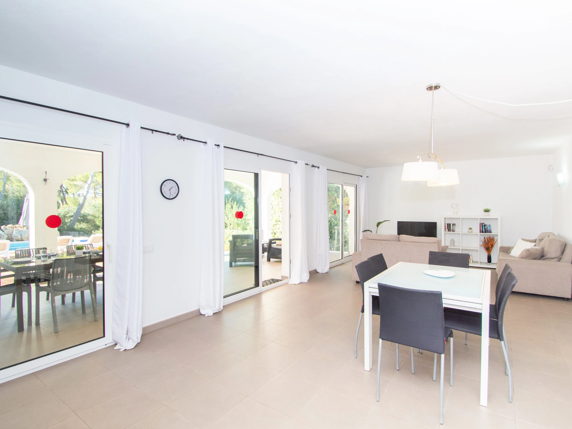 Als nächstes befindet sich auf derselben Etage das geräumige Wohnzimmer. Dieses ist mit zwei Sofas und einem Fernseher ausgestattet. Darüber hinaus ist das Wohnzimmer mit einer Klimaanlage ausgestattet und hat auch direkten Zugang zur Terrasse und zum Außenbereich der Villa, wo sich der Pool befindet. Die überdachte Terrasse ist mit einem großen Gartentisch und Stühlen ausgestattet, damit alle Gäste wunderbare Mahlzeiten im Freien genießen können. Darüber hinaus gibt es auch einen Ruhebereich, in dem Sie bei Sonnenuntergang einen Drink genießen können.