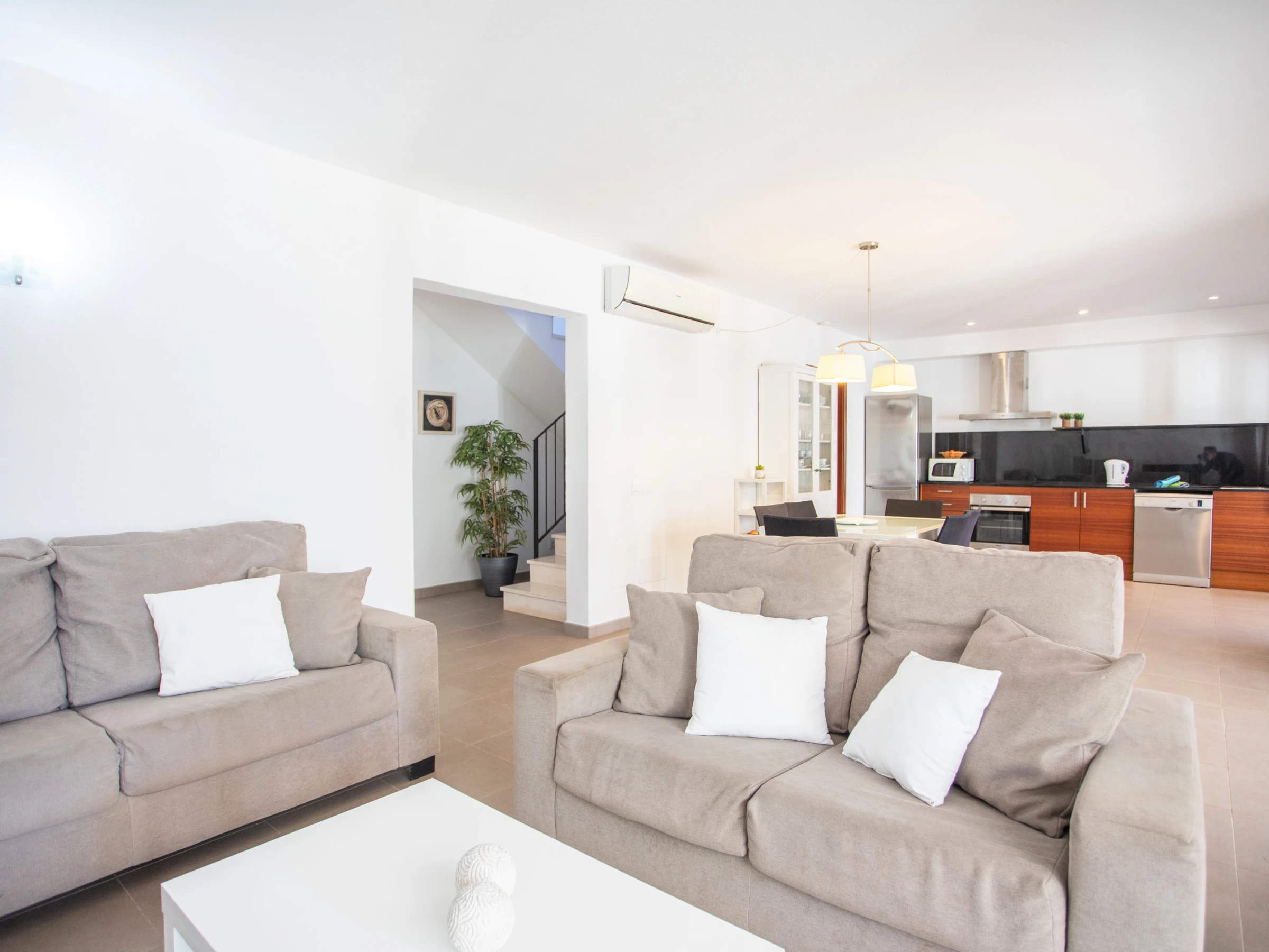 Auf derselben Etage befindet sich die Küche, modern und offen gestaltet. Die Küche ist komplett ausgestattet mit allem, was Sie brauchen, um alle kulinarischen Bedürfnisse zu befriedigen. Es verfügt über einen Tisch und Stühle für alle Gäste, einen Wasserkocher, einen Backofen, einen Geschirrspüler, einen Kühlschrank, eine Mikrowelle, eine Kaffeemaschine, einen Toaster, einen Wasserkocher und alle notwendigen Küchenutensilien.