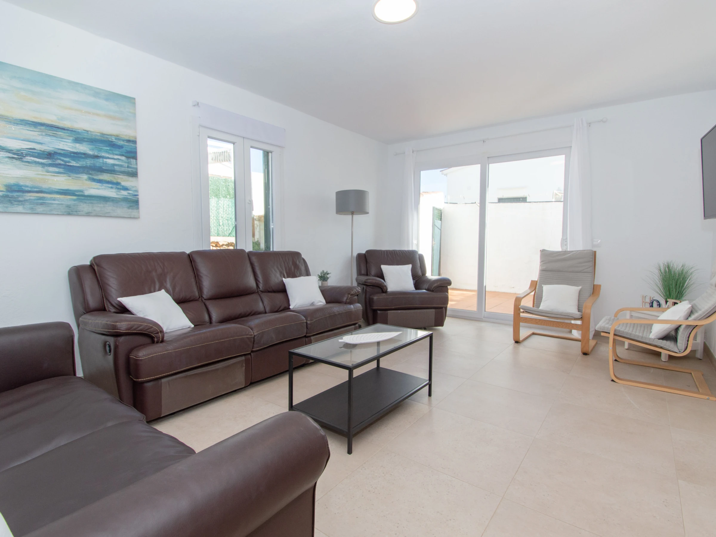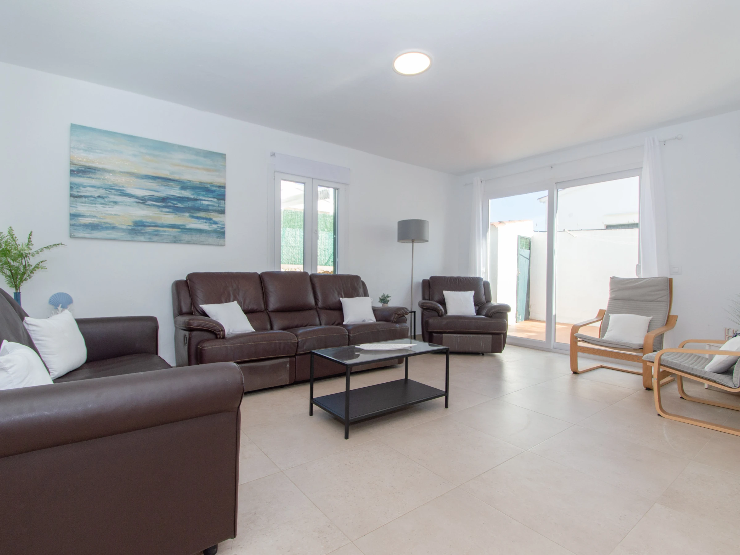 Beim Betreten befindet sich auf der rechten Seite das Wohnzimmer, kürzlich renoviert und ausgestattet mit zwei bequemen Sofas, Fernseher und direktem Zugang zum hinteren Patio. Ein heller, großzügiger Raum, ideal zum Entspannen nach einem Strandtag.Daneben befindet sich ein Badezimmer mit Dusche und Haartrockner.