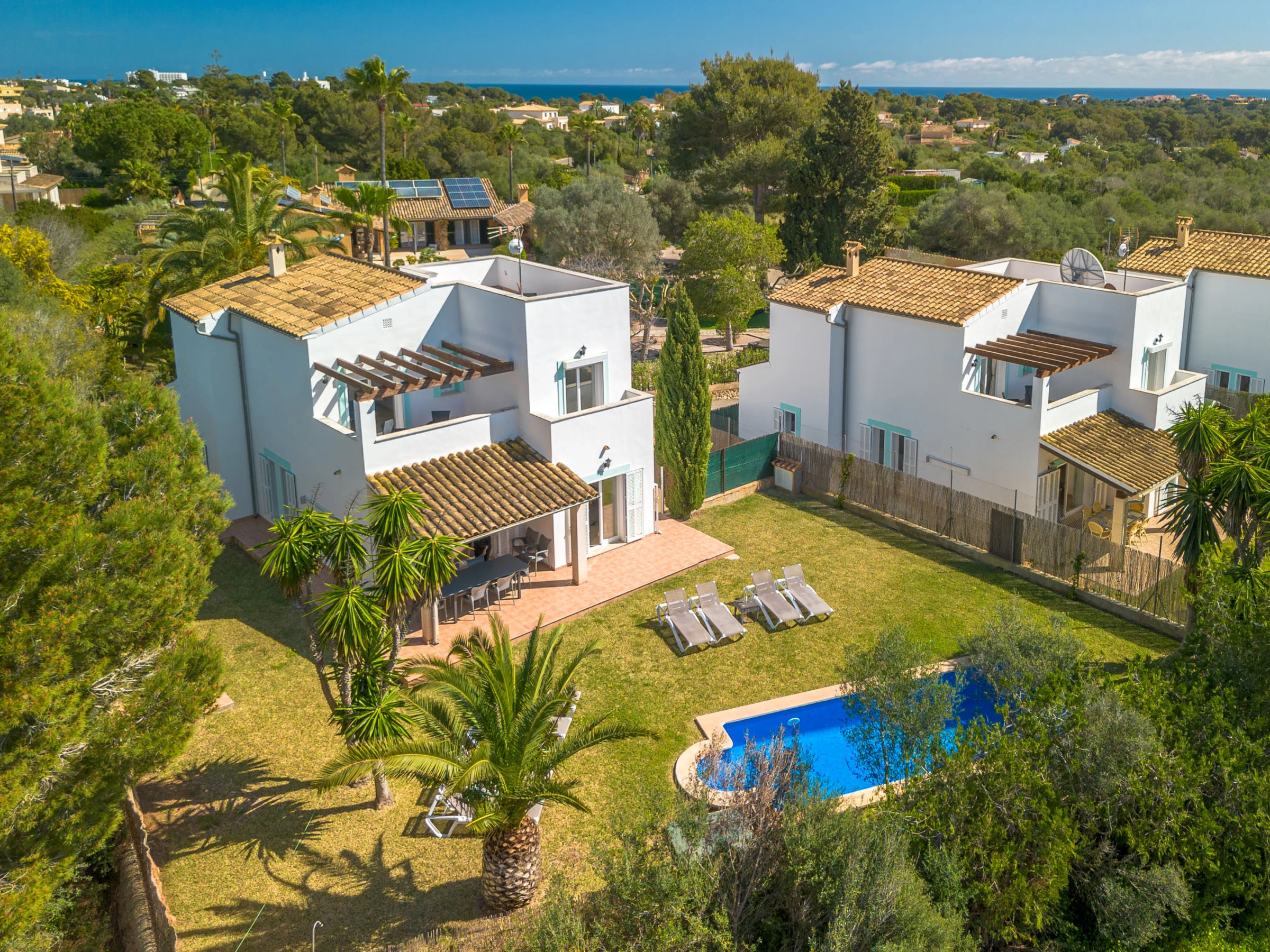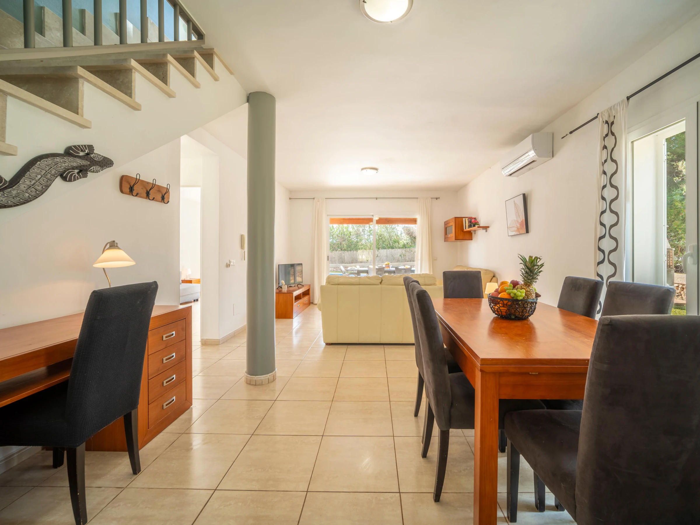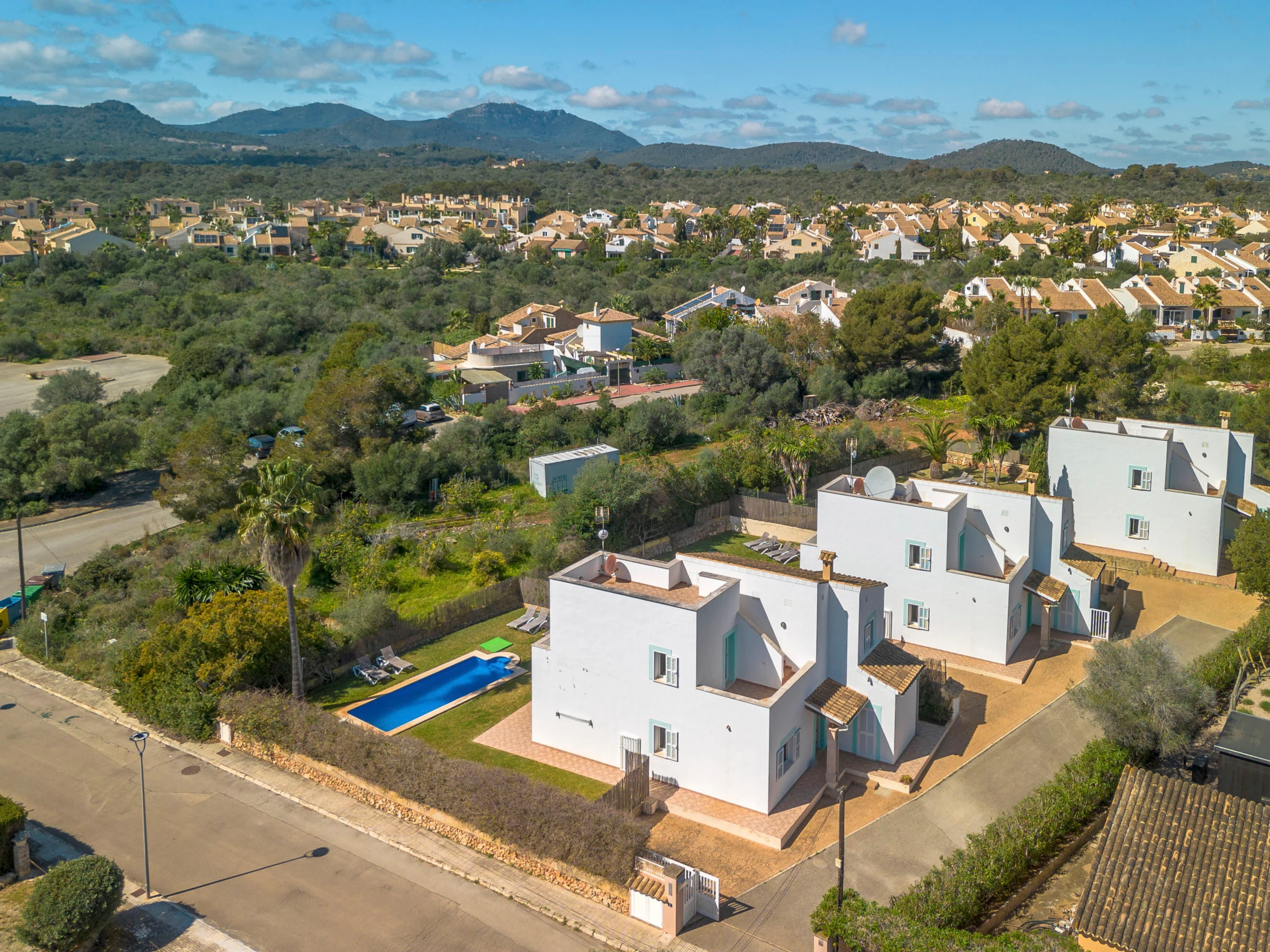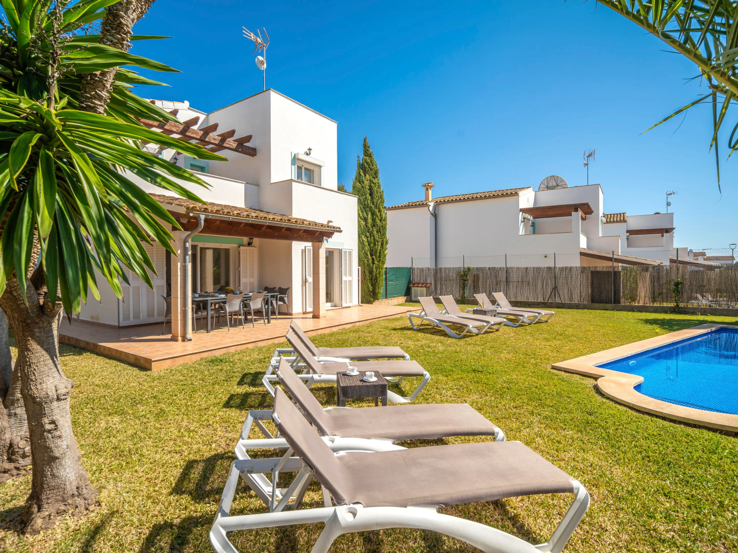 "Son Ganxo III", 4-Zimmer-Reihenhaus 166 m2. Objekt geeignet für 6 Erwachsene. Zweckmässig und gemütlich eingerichtet: Wohn-/Esszimmer mit Klimaanlage und Warmluftheizung. Ausgang zum Gartensitzplatz, zum Schwimmbad. 1 Zimmer mit 2 Betten (90 cm, Länge 190 cm), Klimaanlage und Warmluftheizung. Ausgang zum Gartensitzplatz. 1 Zimmer mit 1 Doppeldiwanbett (1 x 150 cm, Länge 190 cm). Offene Küche (Backofen, Geschirrspüler, 4 Glaskeramikplatten, Toaster, Wasserkocher, Mikrowelle, elektrische Kaffeemaschine). Dusche/WC. Obergeschoss: 1 Doppelzimmer mit 1 franz. Bett (1 x 180 cm, Länge 190 cm), Klimaanlage und Warmluftheizung. Ausgang zum Balkon. 1 Doppelzimmer mit 2 Betten (90 cm, Länge 190 cm), Klimaanlage und Warmluftheizung. Ausgang zum Balkon. 2 Bäder/WC. Klimaanlage, Warmluftheizung. Heizung nicht in allen Räumen. Natursteinboden. Gartensitzplatz, Garten, Rasen, Laube. Terrassenmöbel, Gartengrill, Liegestühle, Loggia. Sicht auf die Landschaft. Zur Verfügung: Waschmaschine, Bügeleisen, Kinderhochstuhl, Babybett bis 2 Jahre, Haartrockner. Internet (WLAN, gratis). Parkplatz beim Haus. Bitte beachten: geeignet für Familien. Nichtraucher-Haus. Der ausgeschriebene Pool ist zur alleinigen Nutzung. [hidden] // Reg. Nr.: ESFCTU00000702300130367600000000000000000000[hidden]9