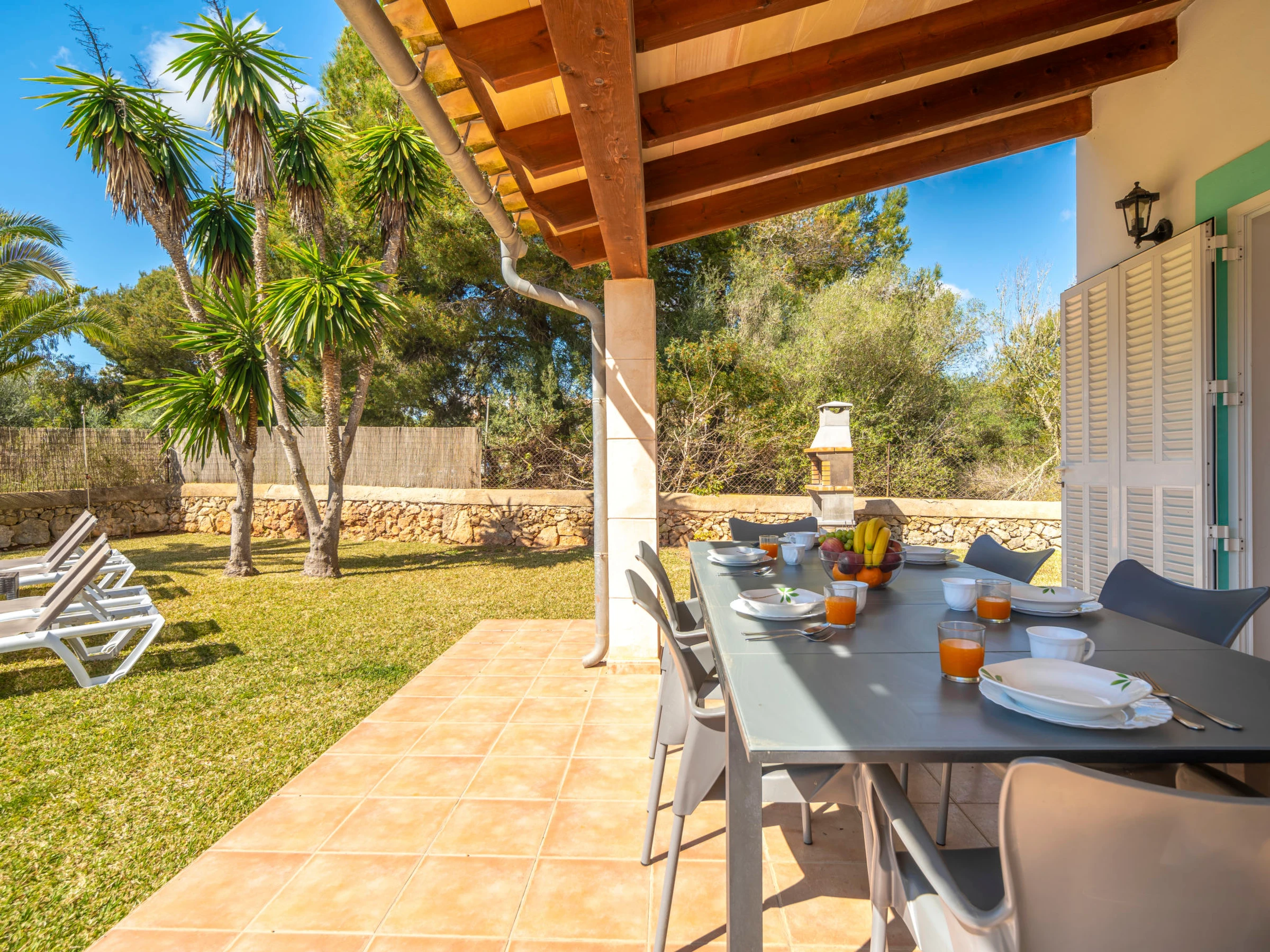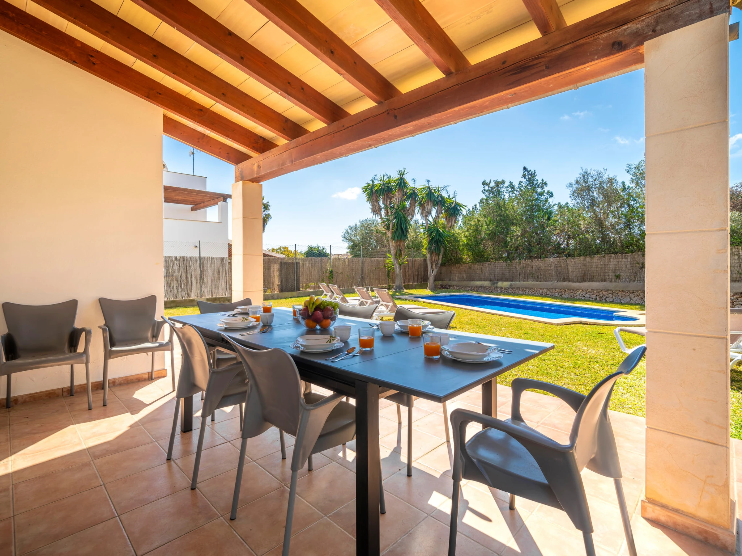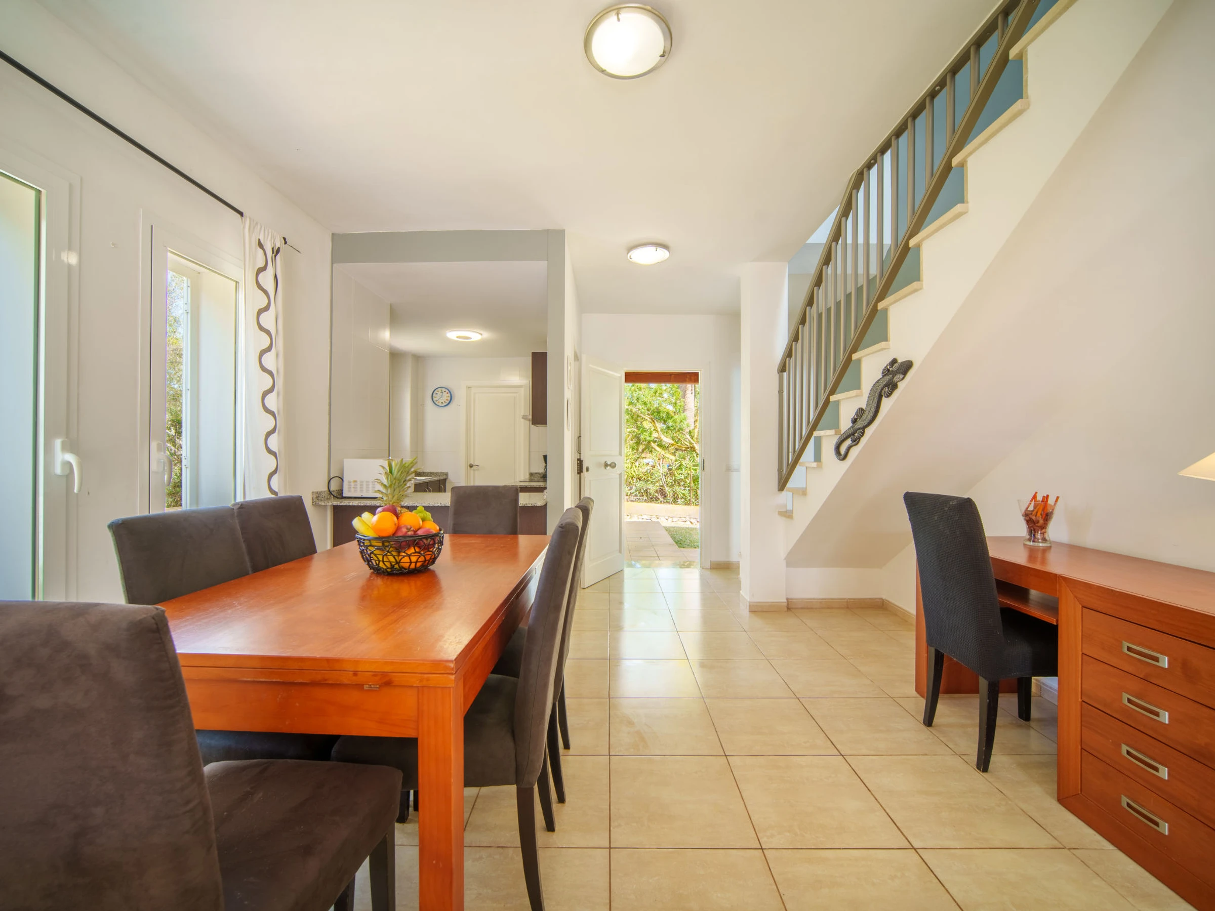 "Son Ganxo III", 4-Zimmer-Reihenhaus 166 m2. Objekt geeignet für 6 Erwachsene. Zweckmässig und gemütlich eingerichtet: Wohn-/Esszimmer mit Klimaanlage und Warmluftheizung. Ausgang zum Gartensitzplatz, zum Schwimmbad. 1 Zimmer mit 2 Betten (90 cm, Länge 190 cm), Klimaanlage und Warmluftheizung. Ausgang zum Gartensitzplatz. 1 Zimmer mit 1 Doppeldiwanbett (1 x 150 cm, Länge 190 cm). Offene Küche (Backofen, Geschirrspüler, 4 Glaskeramikplatten, Toaster, Wasserkocher, Mikrowelle, elektrische Kaffeemaschine). Dusche/WC. Obergeschoss: 1 Doppelzimmer mit 1 franz. Bett (1 x 180 cm, Länge 190 cm), Klimaanlage und Warmluftheizung. Ausgang zum Balkon. 1 Doppelzimmer mit 2 Betten (90 cm, Länge 190 cm), Klimaanlage und Warmluftheizung. Ausgang zum Balkon. 2 Bäder/WC. Klimaanlage, Warmluftheizung. Heizung nicht in allen Räumen. Natursteinboden. Gartensitzplatz, Garten, Rasen, Laube. Terrassenmöbel, Gartengrill, Liegestühle, Loggia. Sicht auf die Landschaft. Zur Verfügung: Waschmaschine, Bügeleisen, Kinderhochstuhl, Babybett bis 2 Jahre, Haartrockner. Internet (WLAN, gratis). Parkplatz beim Haus. Bitte beachten: geeignet für Familien. Nichtraucher-Haus. Der ausgeschriebene Pool ist zur alleinigen Nutzung. [hidden] // Reg. Nr.: ESFCTU00000702300130367600000000000000000000[hidden]9