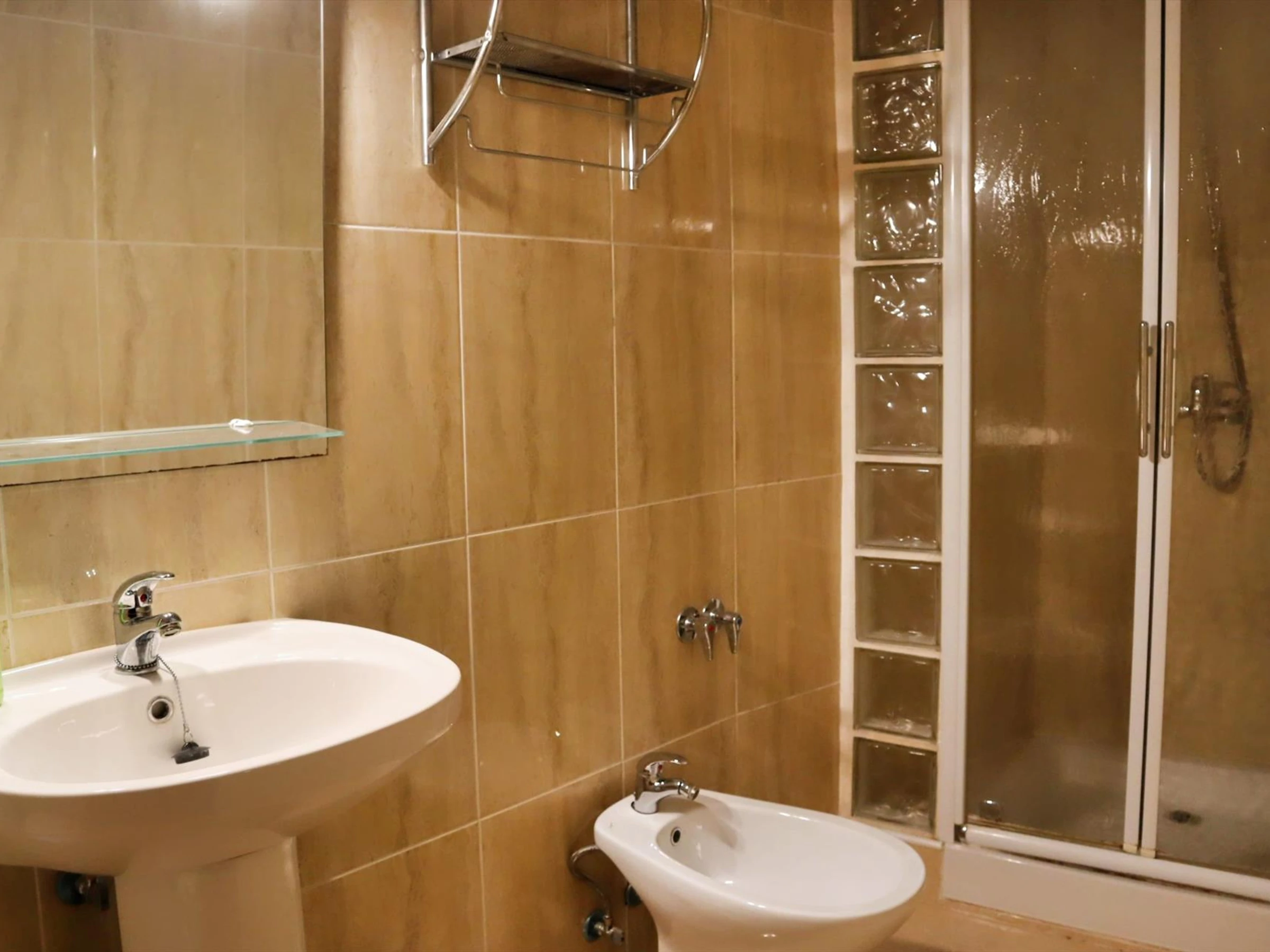 * Badezimmer mit Einzelwaschbecken, Dusche, Bidet und Toilette Aussen