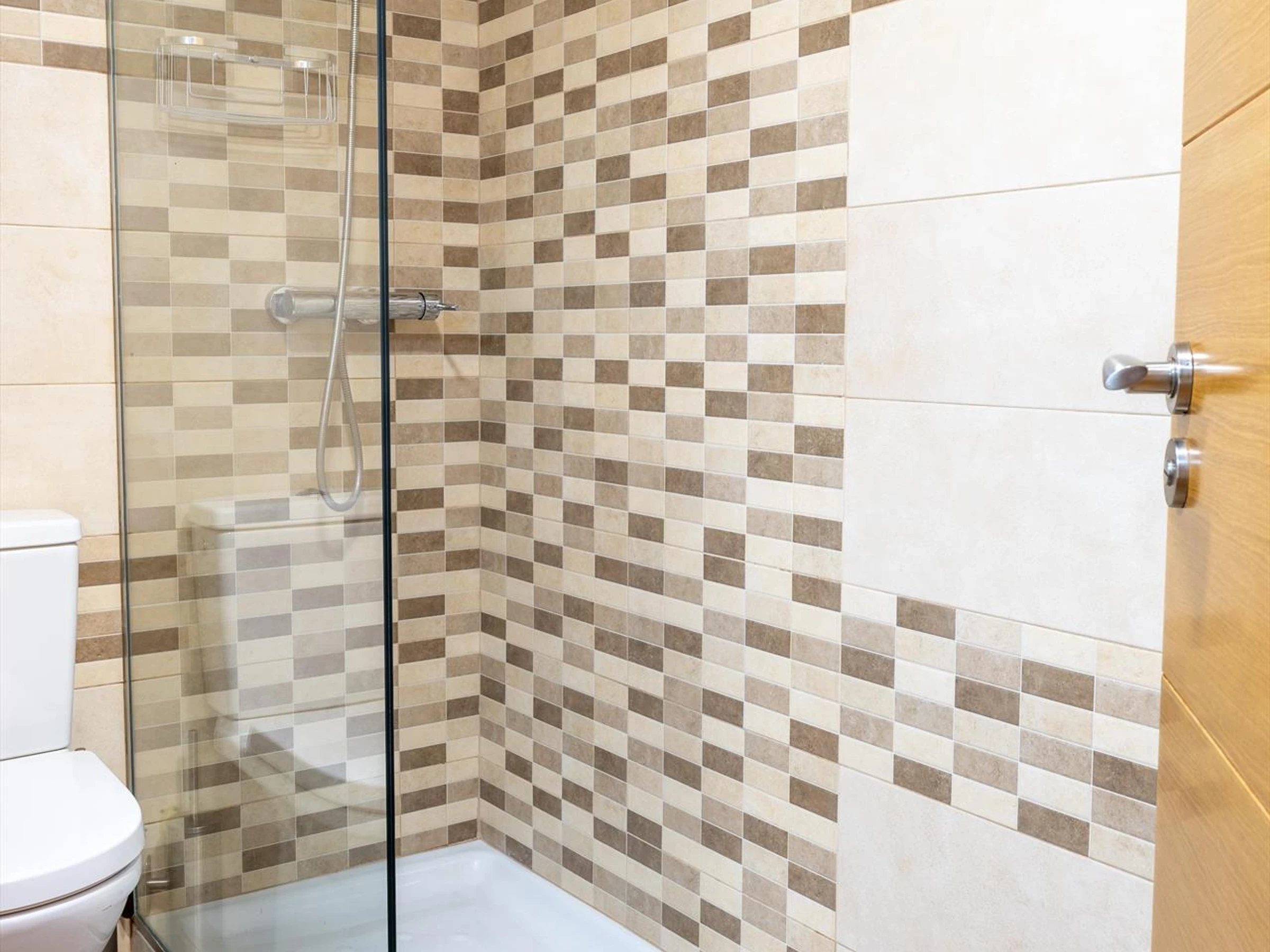 * Badezimmer mit Einzelwaschbecken, Dusche, Toilette und FöhnAussen