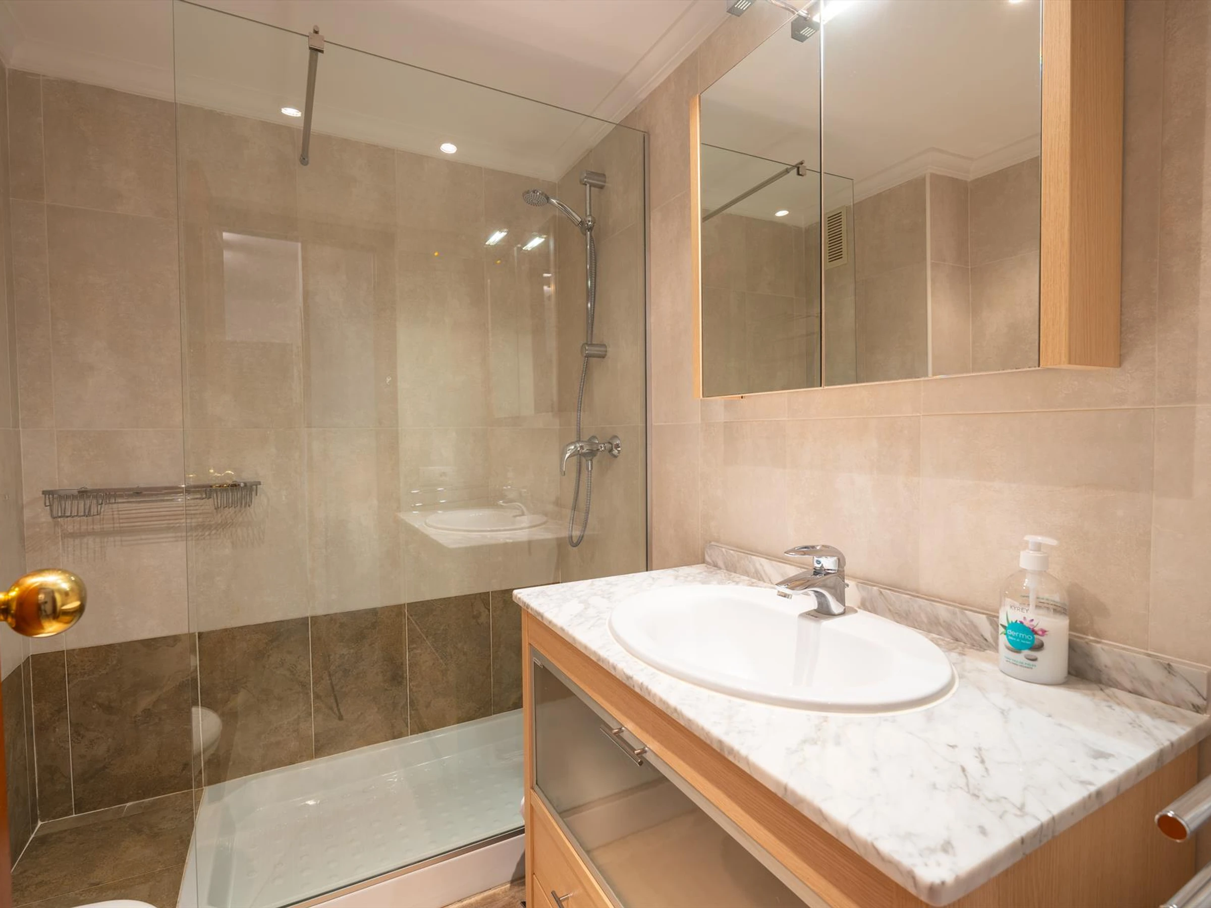 * Badezimmer mit Einzelwaschbecken, Dusche, Bidet, Toilette und FöhnAussen