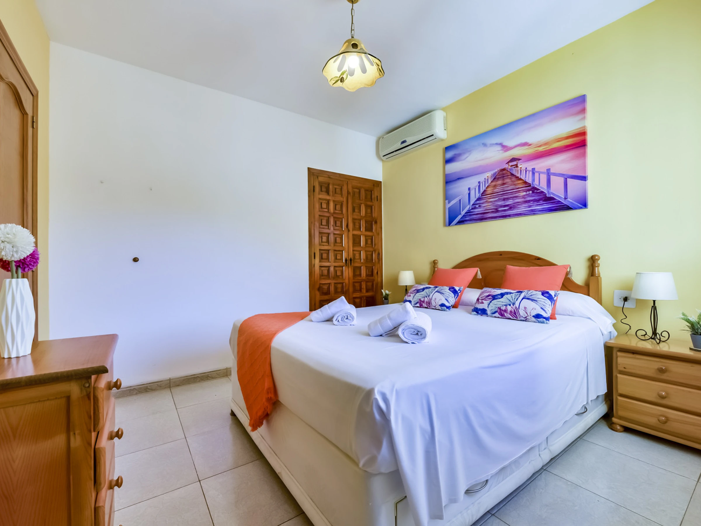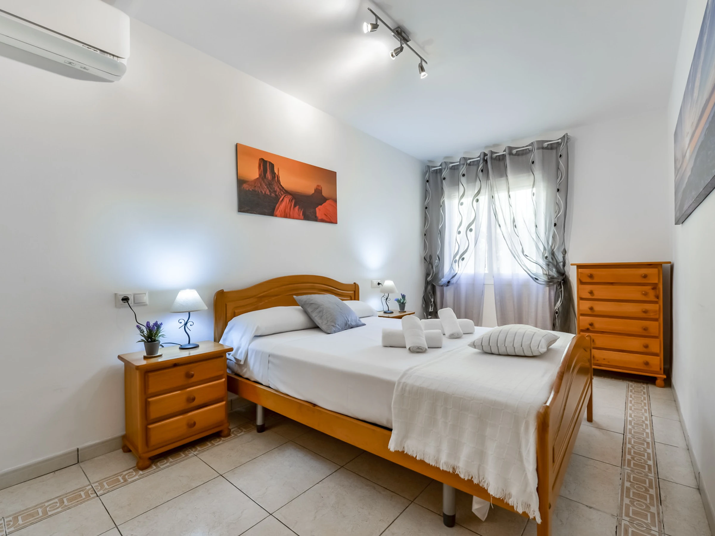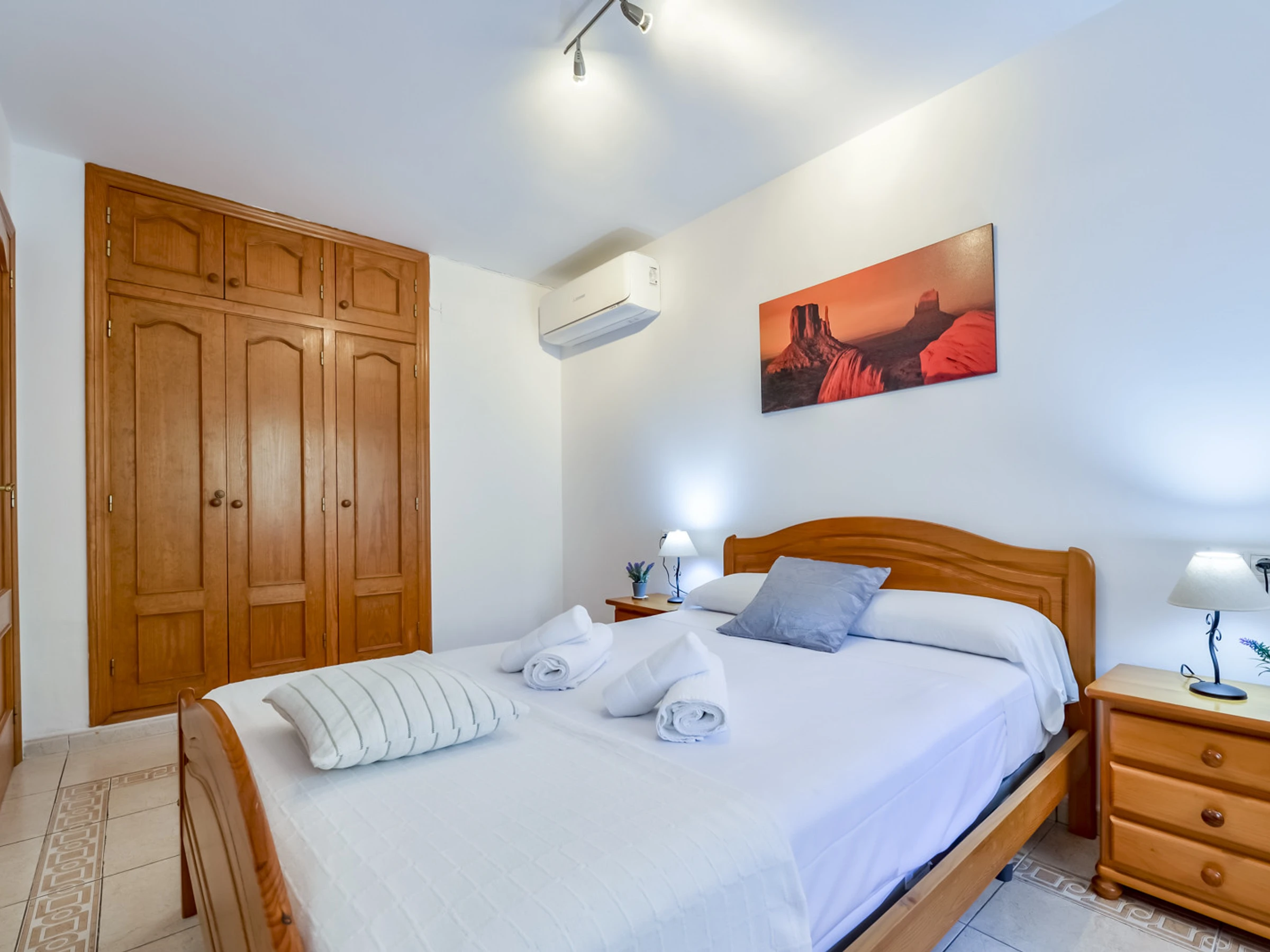 Das erste Schlafzimmer hat ein Doppelbett, Klimaanlage und eine Toilette en suite mit WC und Waschbecken (ohne Dusche). Ein zweites Schlafzimmer mit Doppelbett und Klimaanlage und ein drittes Schlafzimmer mit zwei Einzelbetten und Ventilator. Die Wohnung verfügt über ein vollständiges Badezimmer mit Badewanne, ein Wohn-Esszimmer, Terrasse und eine separate elektrische Küche, ausgestattet mit Kühlschrank, Mikrowelle, Ofen, Gefrierschrank, Waschmaschine, Geschirrspüler, Geschirr/Besteck, Küchenutensilien, Kaffeemaschine, Toaster und Wasserkocher. Zusätzlich verfügt sie über Klimaanlage und Heizpumpe.