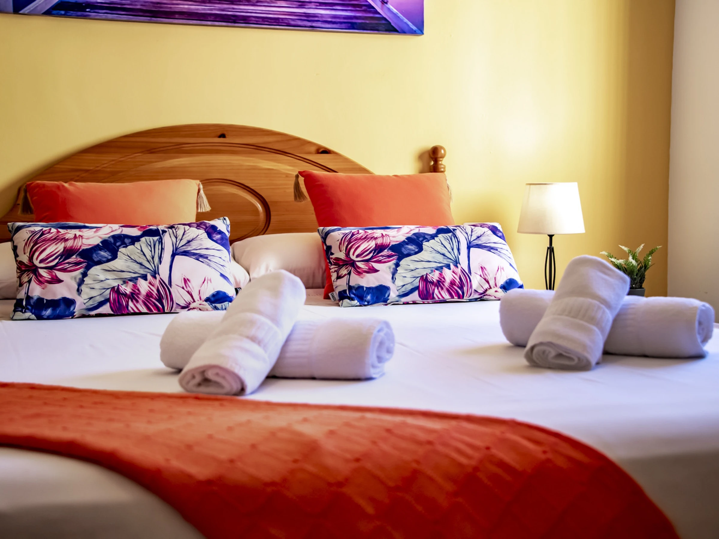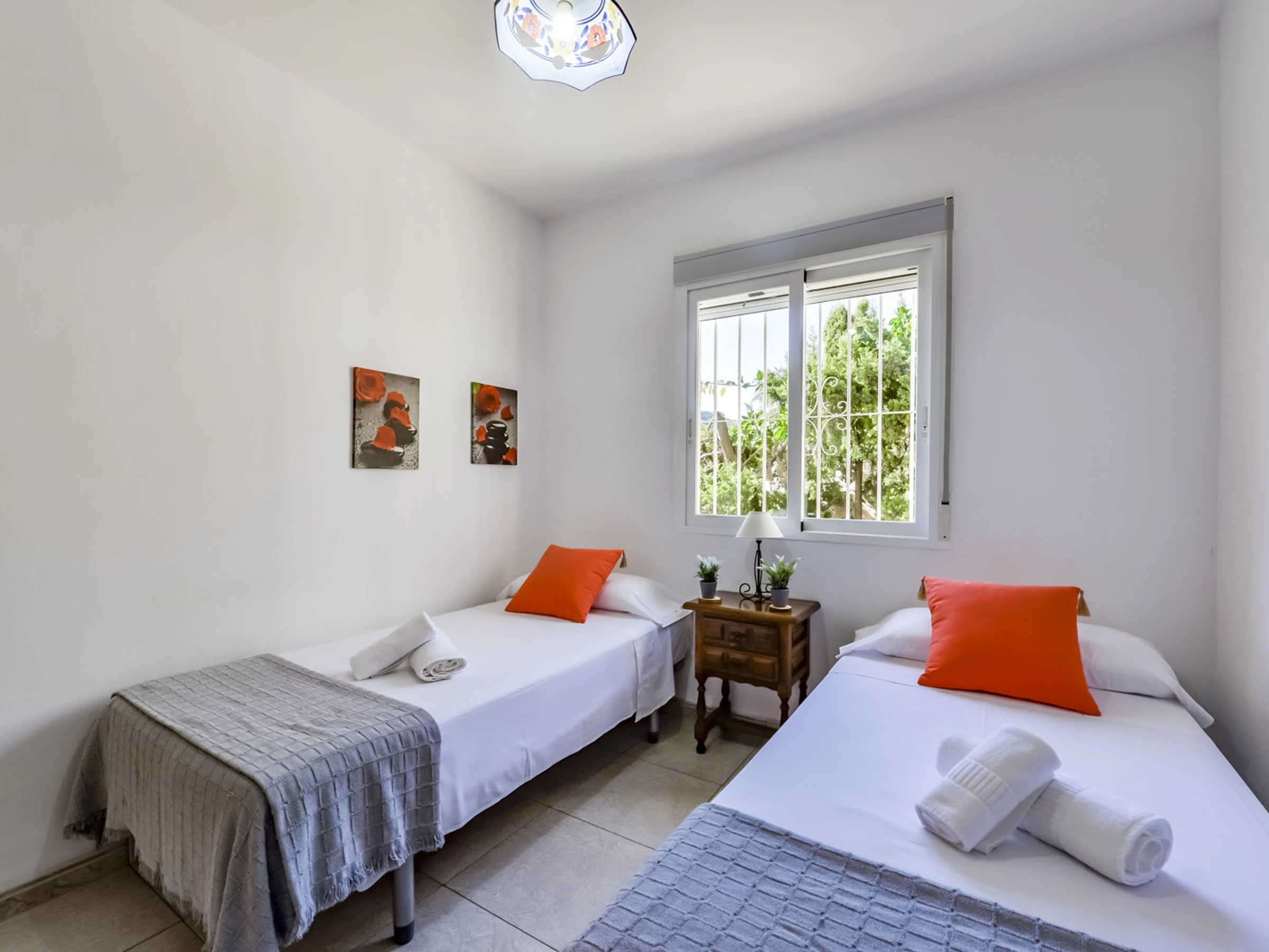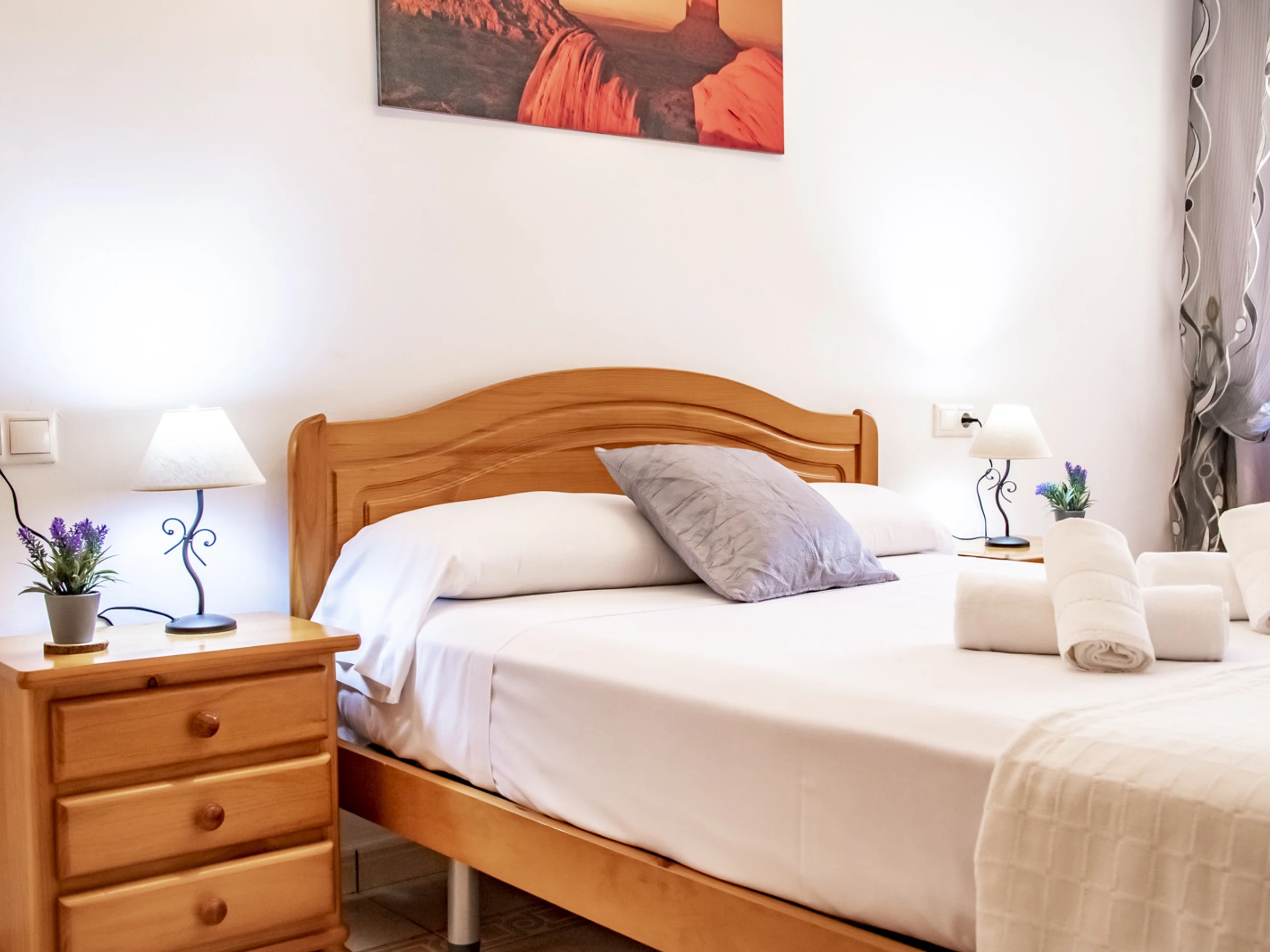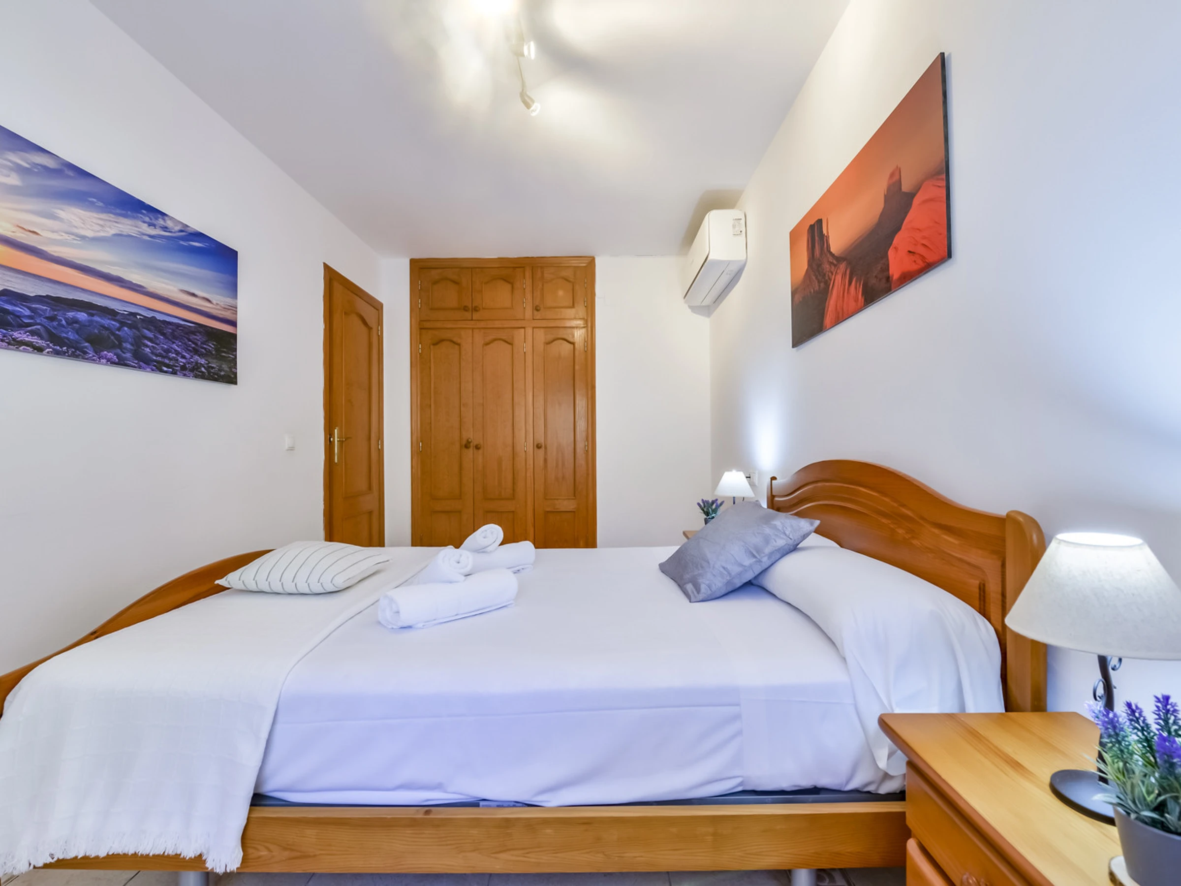 Das erste Schlafzimmer hat ein Doppelbett, Klimaanlage und eine Toilette en suite mit WC und Waschbecken (ohne Dusche). Ein zweites Schlafzimmer mit Doppelbett und Klimaanlage und ein drittes Schlafzimmer mit zwei Einzelbetten und Ventilator. Die Wohnung verfügt über ein vollständiges Badezimmer mit Badewanne, ein Wohn-Esszimmer, Terrasse und eine separate elektrische Küche, ausgestattet mit Kühlschrank, Mikrowelle, Ofen, Gefrierschrank, Waschmaschine, Geschirrspüler, Geschirr/Besteck, Küchenutensilien, Kaffeemaschine, Toaster und Wasserkocher. Zusätzlich verfügt sie über Klimaanlage und Heizpumpe.