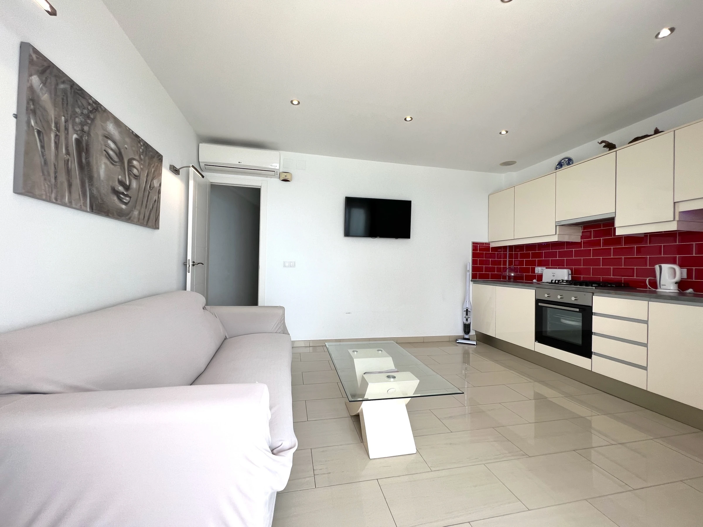 Dieses offene küche, mit ceranfeld, ist ausgestattet in kühlschrank, mikrowelle, backofen, gefrierschrank, geschirr/besteck, kochutensilien, kaffeemaschine, toaster, wasserkocher und saftpresse.