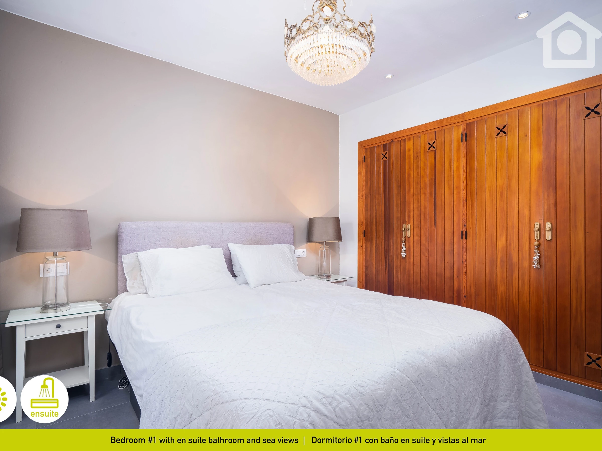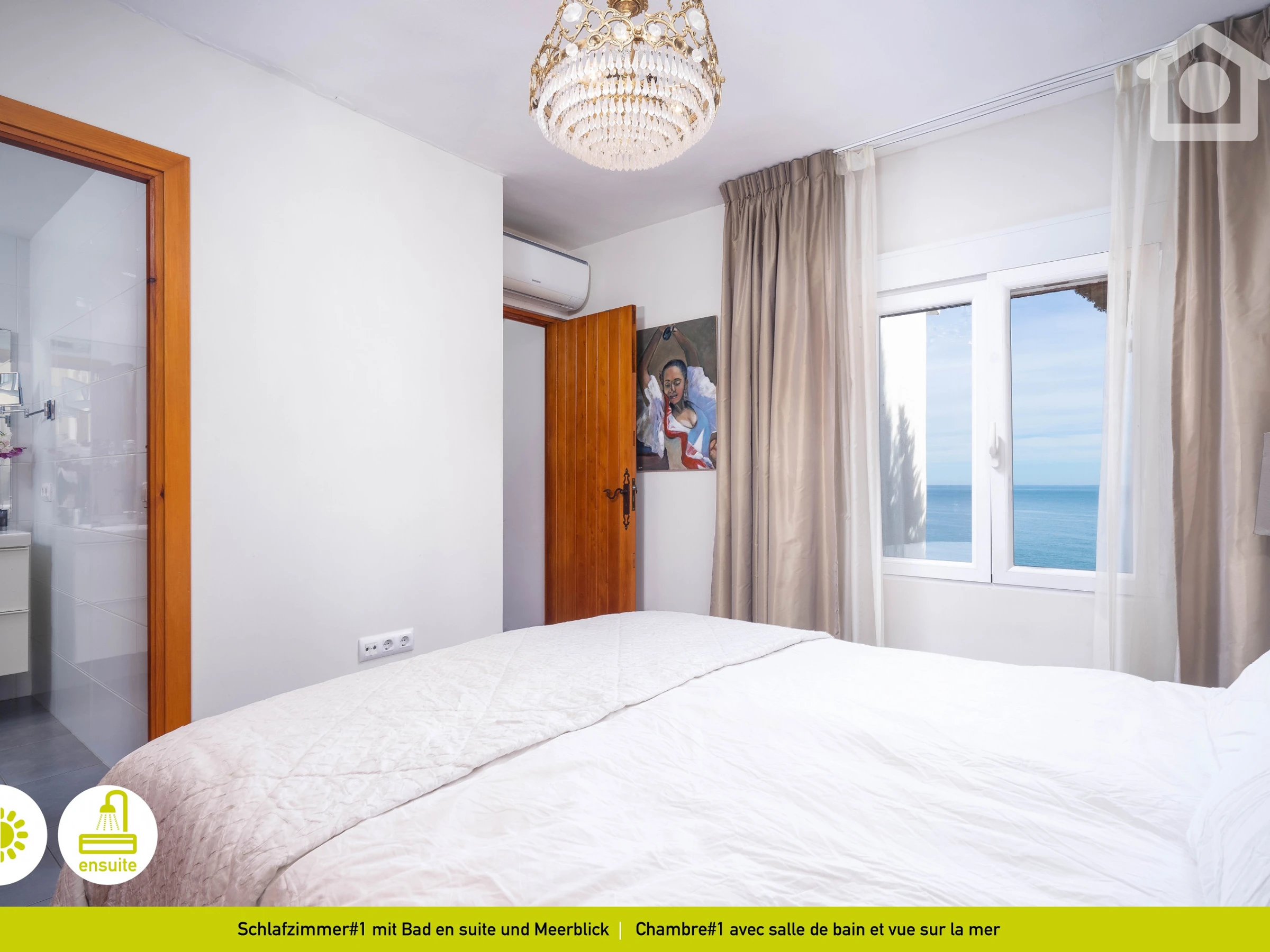 Das Haus ist in zwei verschiedene Etagen unterteilt. Der erste Stock bietet Platz für 1 Schlafzimmer mit Bad en-suite, der zweite Stock verfügt über 2 Schlafzimmer, eines mit zwei Einzelbetten und eines mit einem Doppelbett und Bad en-suite, alle mit Klimaanlage ausgestattet. Die drei Zimmer bieten einen fantastischen Meerblick und das Schlafzimmer mit Doppelbett im ersten Stock hat direkten Zugang zum Garten.