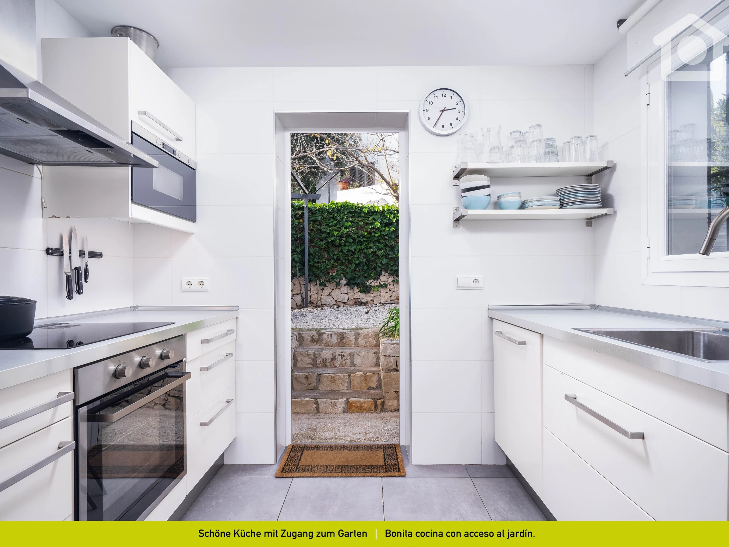 Die Küche ist modern und hat direkten Zugang zum Garten. Es öffnet sich auf der einen Seite des Wohnzimmers und auf der anderen Seite zur schattigen Lounge im Freien.
