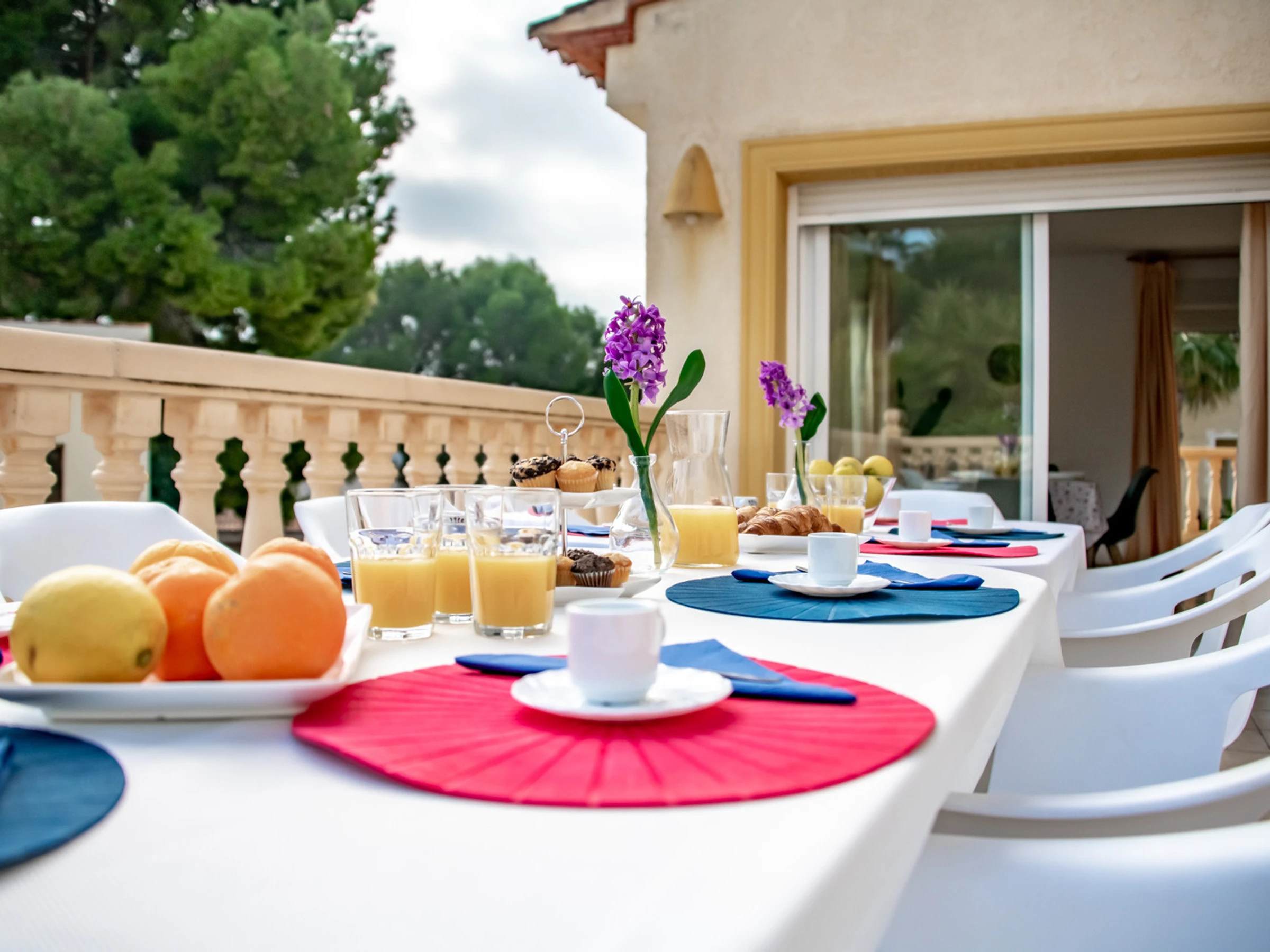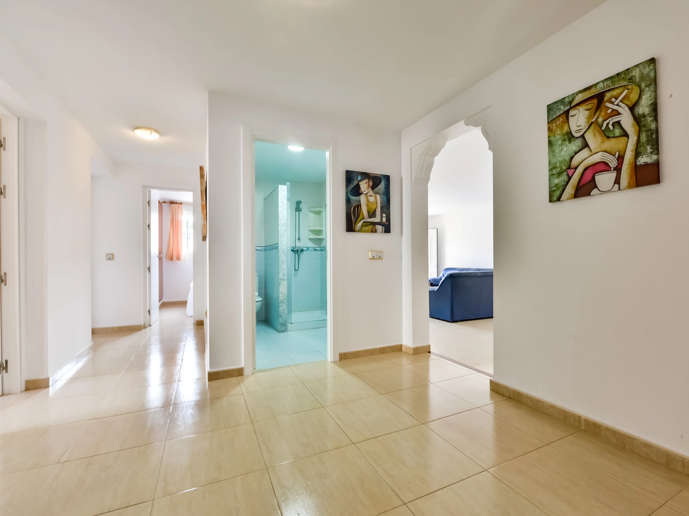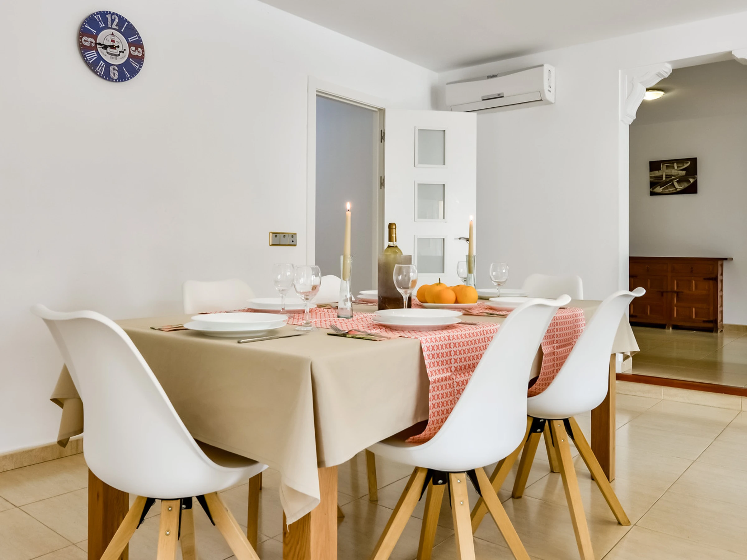 Mit 382 m². und nach Süden ausgerichtet ist die Besonderheit dieser Villa, dass ihre 16 Gäste zusammen in demselben dreistöckigen Haus wohnen können, das durch eine Innentreppe verbunden ist. Im Erdgeschoss, das sich auf Straßenniveau befindet, befinden sich ein klimatisiertes Esszimmer und eine offene Küche, ein Badezimmer mit Dusche, ein Schlafzimmer mit einem Doppelbett und ein eigenes Badezimmer mit Dusche. Das zweite Schlafzimmer verfügt über zwei Einzelbetten. Das dritte Schlafzimmer hat zwei Einzelbetten und das vierte Schlafzimmer hat ein Doppelbett. Über eine Innentreppe gelangen wir in den zweiten Stock, wo wir eine voll ausgestattete Küche mit Zugang zu einer Terrasse mit Esstisch im Freien und einem klimatisierten Wohnzimmer mit Zugang zu zwei Terrassen finden. Ein Badezimmer mit Dusche, ein fünftes Zimmer mit zwei Einzelbetten und ein sechstes Zimmer mit Doppelbett und Klimaanlage.