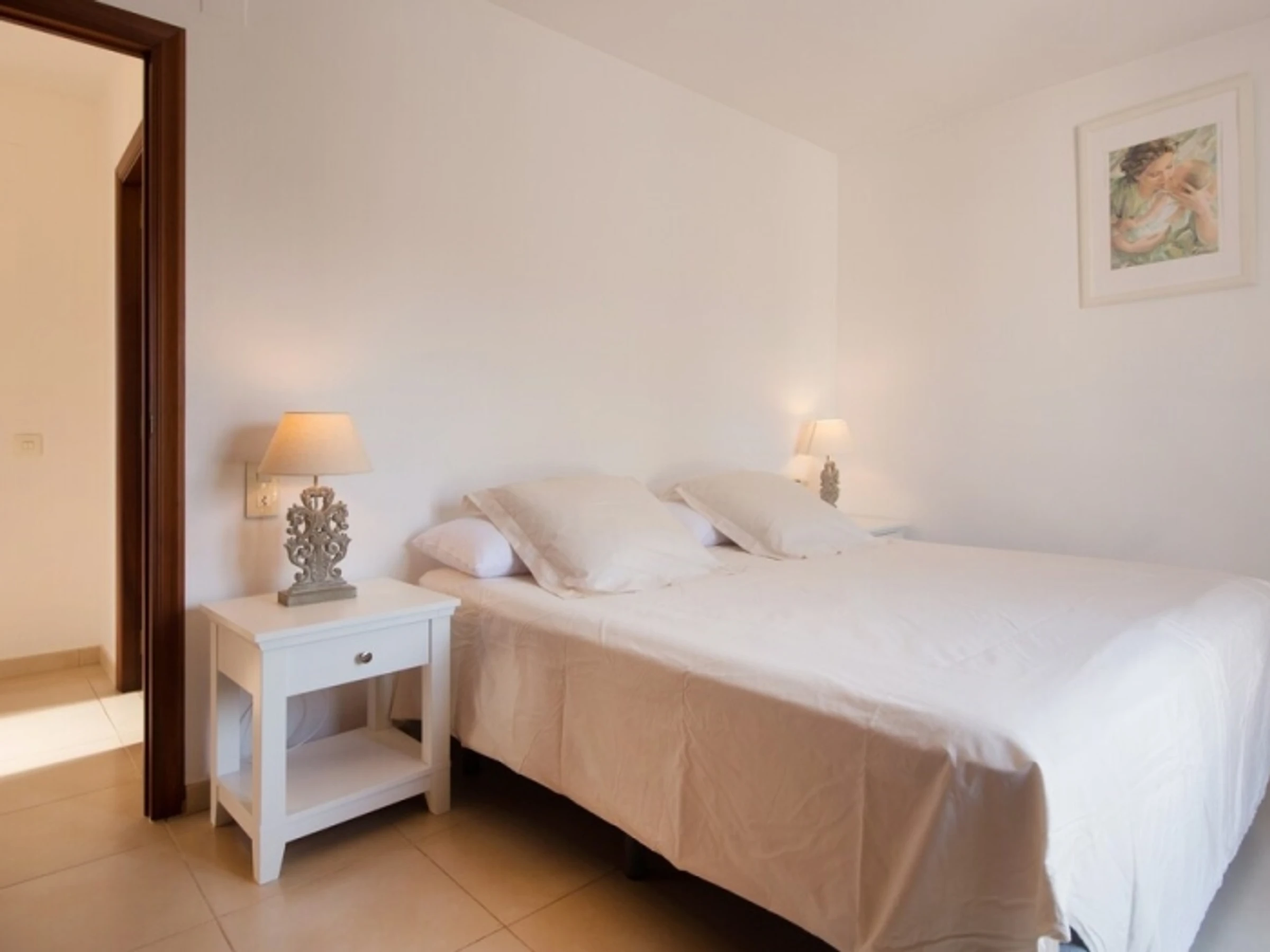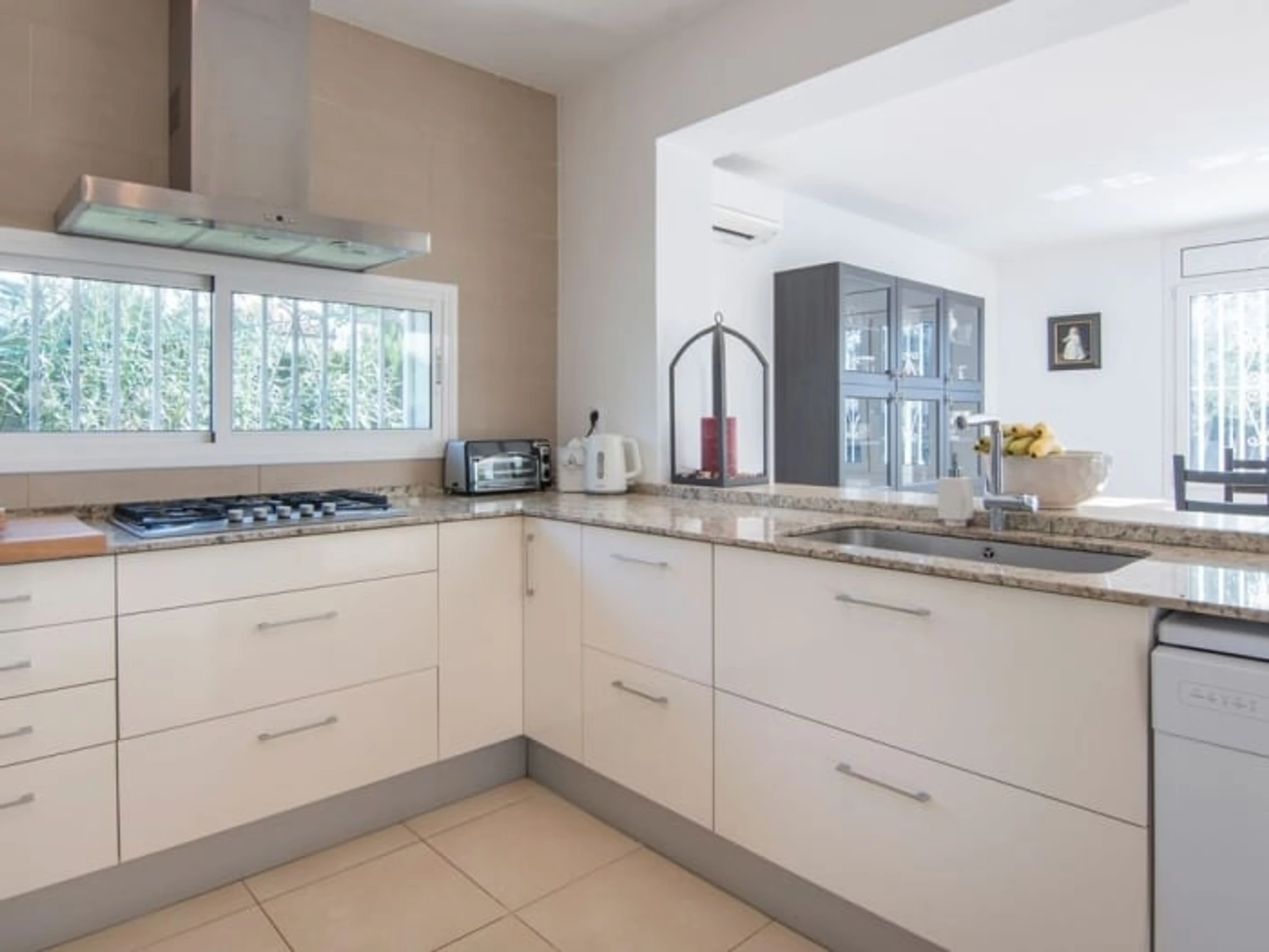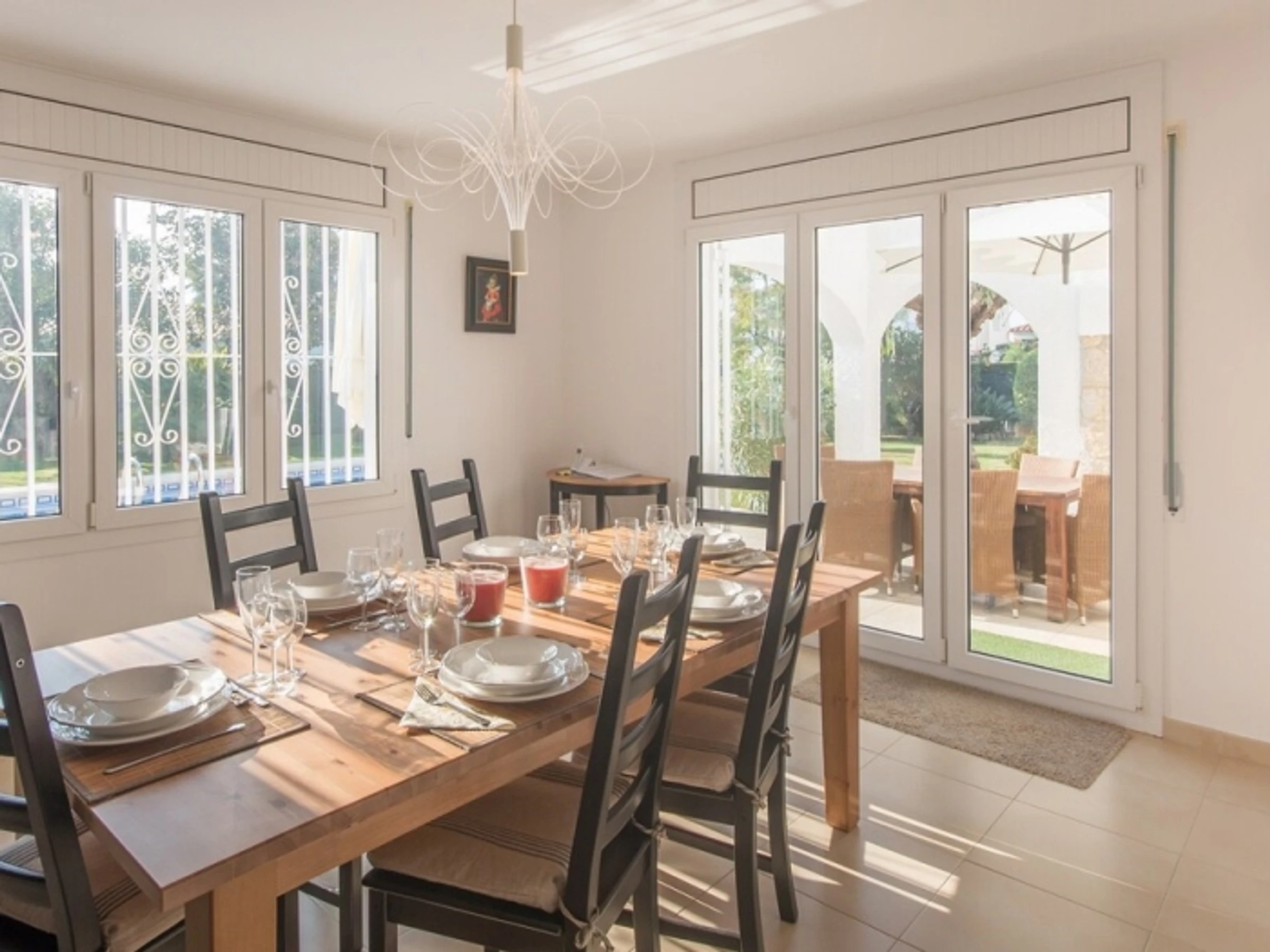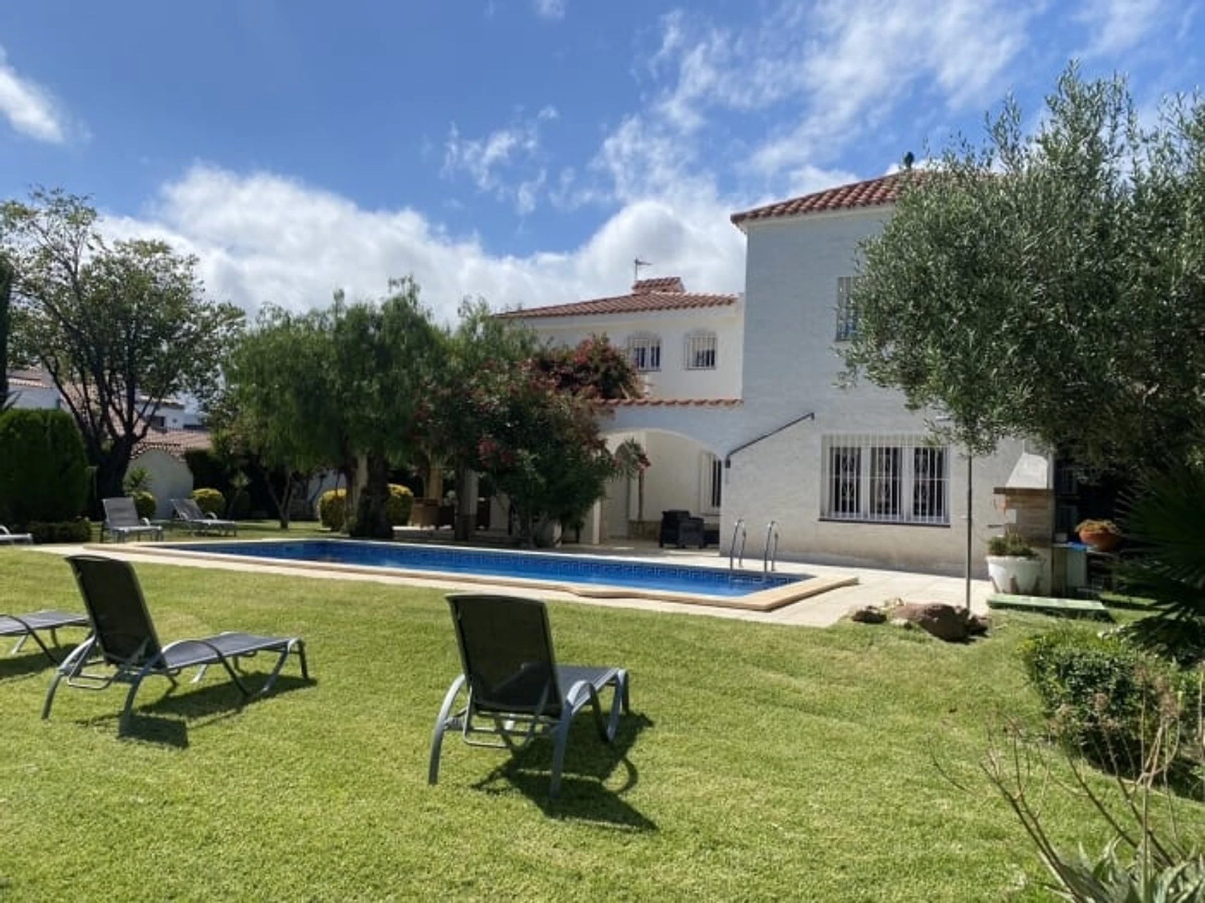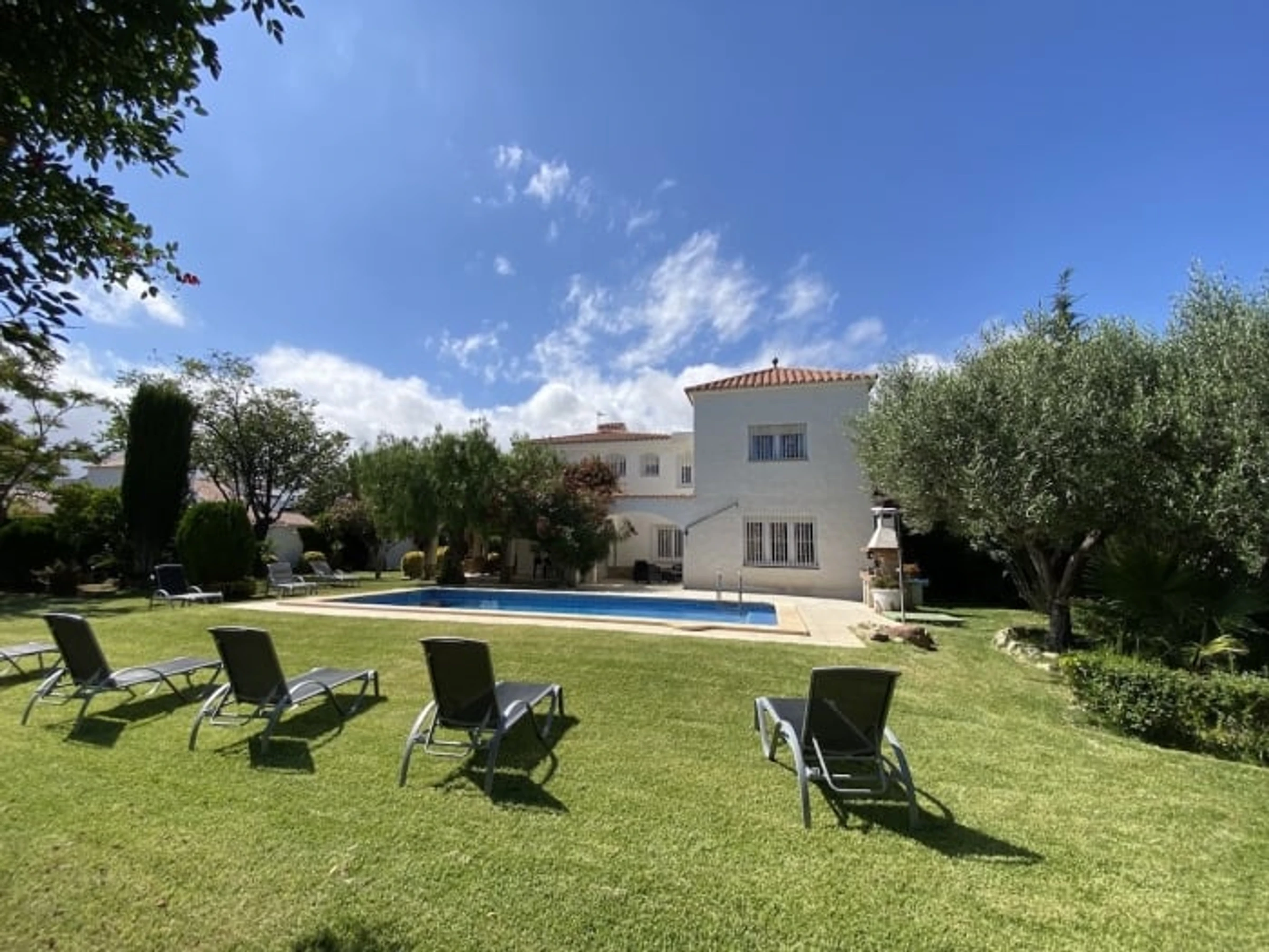Im Obergeschoss befinden sich vier geräumige, klimatisierte Schlafzimmer und drei Badezimmer. Es bietet bequem Platz für zehn Personen. Mehrere Bereiche im Erdgeschoss führen direkt in den Garten mit einem privaten Swimmingpool, umgeben von Naturrasen. Vor dem Haus lädt eine geschmackvoll eingerichtete, überdachte Terrasse zum Genießen der Aussicht und des schönen Wetters ein.