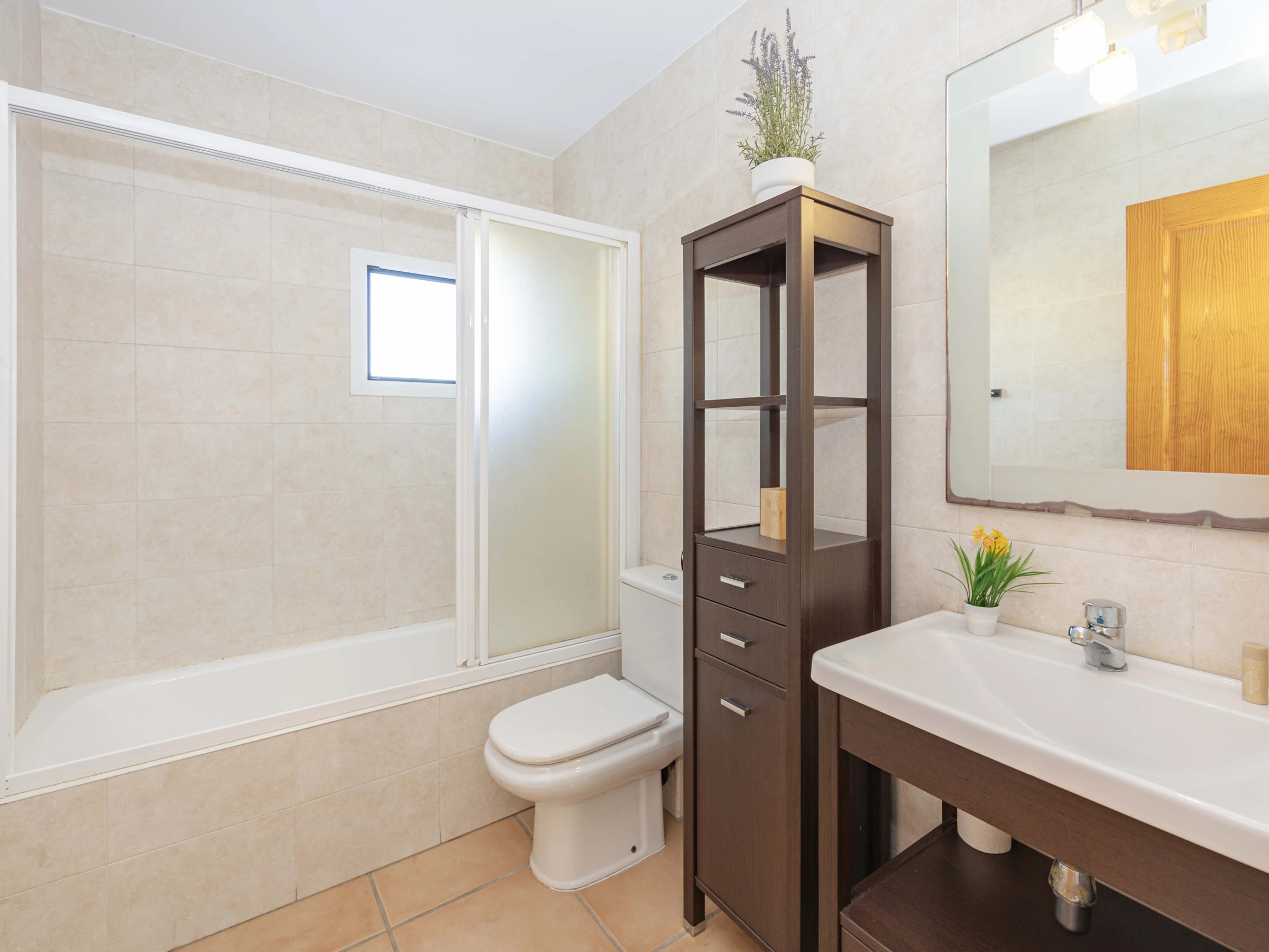 Im Inneren befinden sich drei komfortable Doppelschlafzimmer, die alle mit einer Klimaanlage ausgestattet sind. Zwei komplette Badezimmer und eine Toilette im Erdgeschoss vervollständigen diese Villa.
