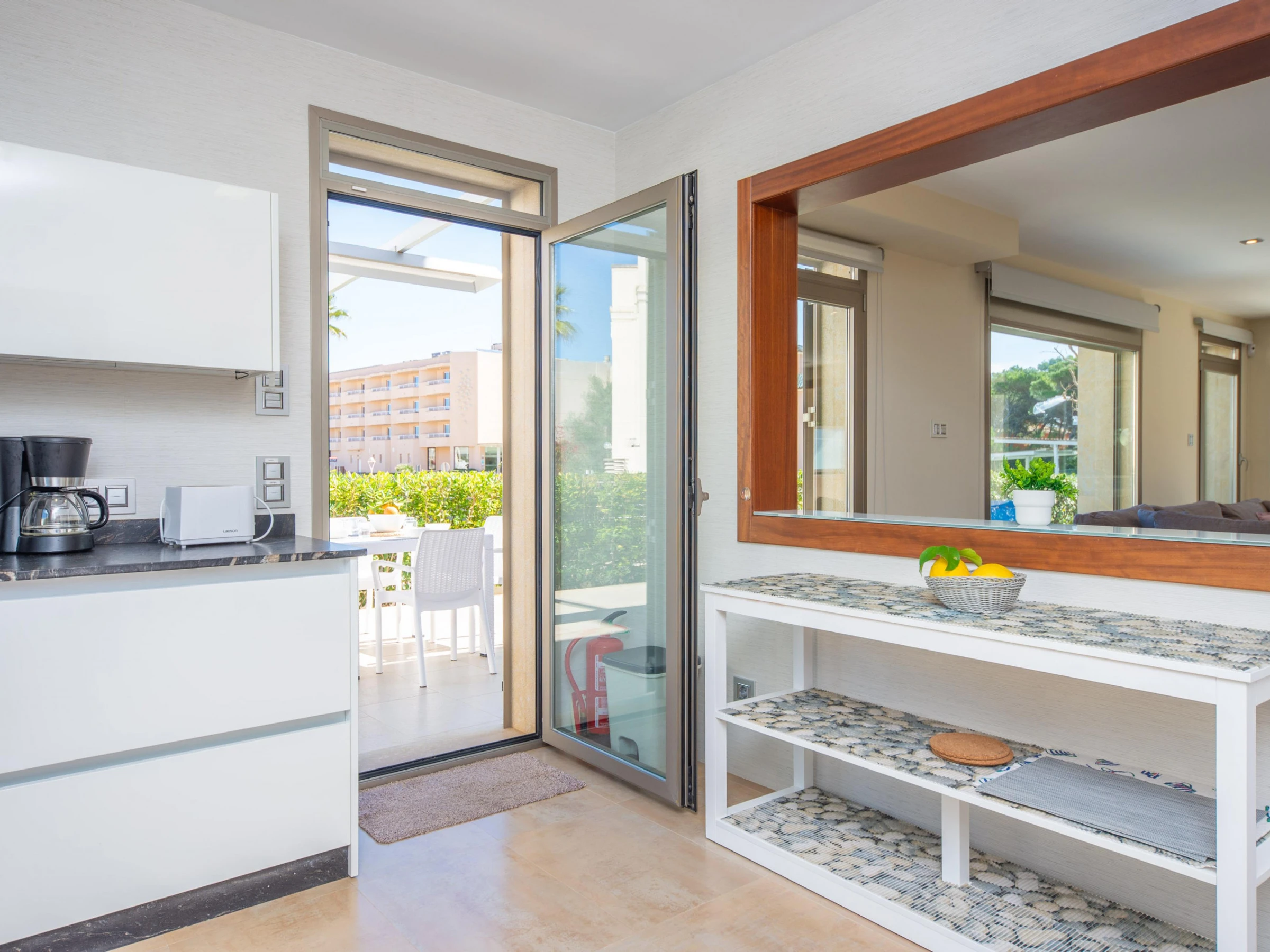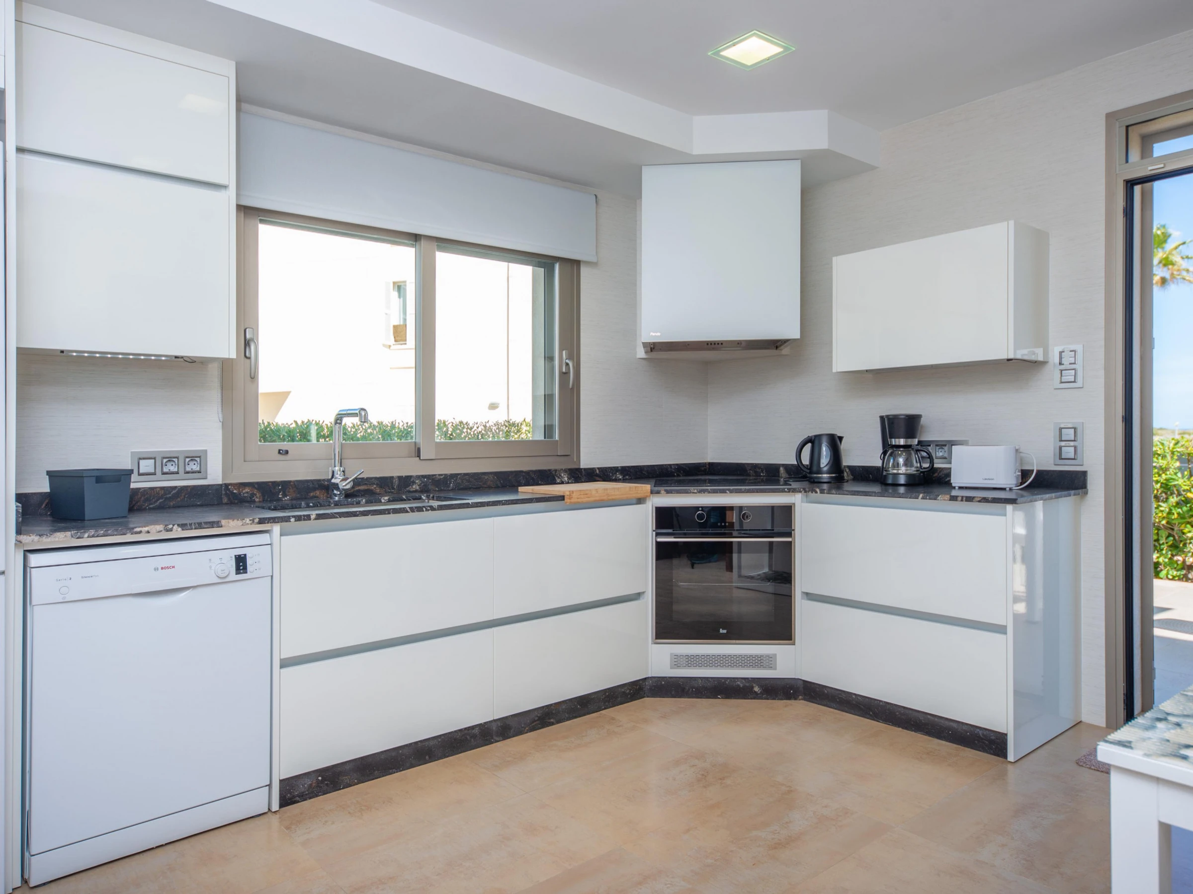Dieses küche, ist ausgestattet in kühlschrank, mikrowelle, backofen, gefrierschrank, spülmaschine, kaffeemaschine und toaster.
