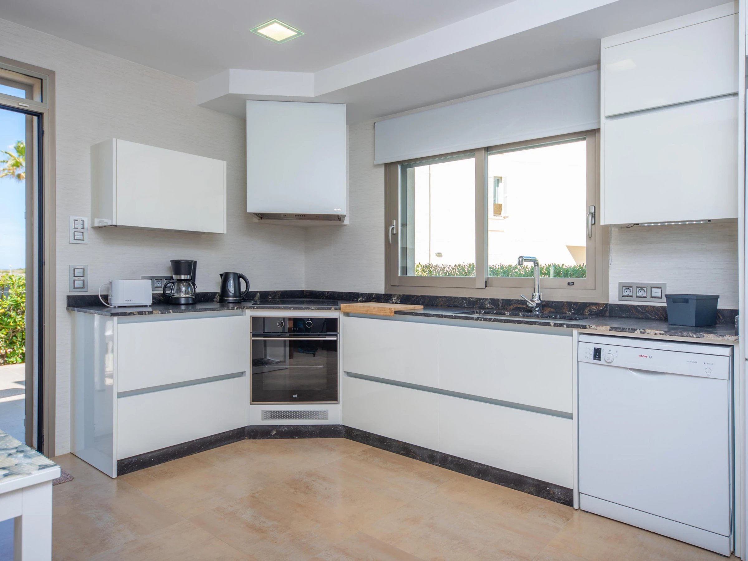 Dieses küche, ist ausgestattet in kühlschrank, mikrowelle, backofen, gefrierschrank, spülmaschine, kaffeemaschine und toaster.