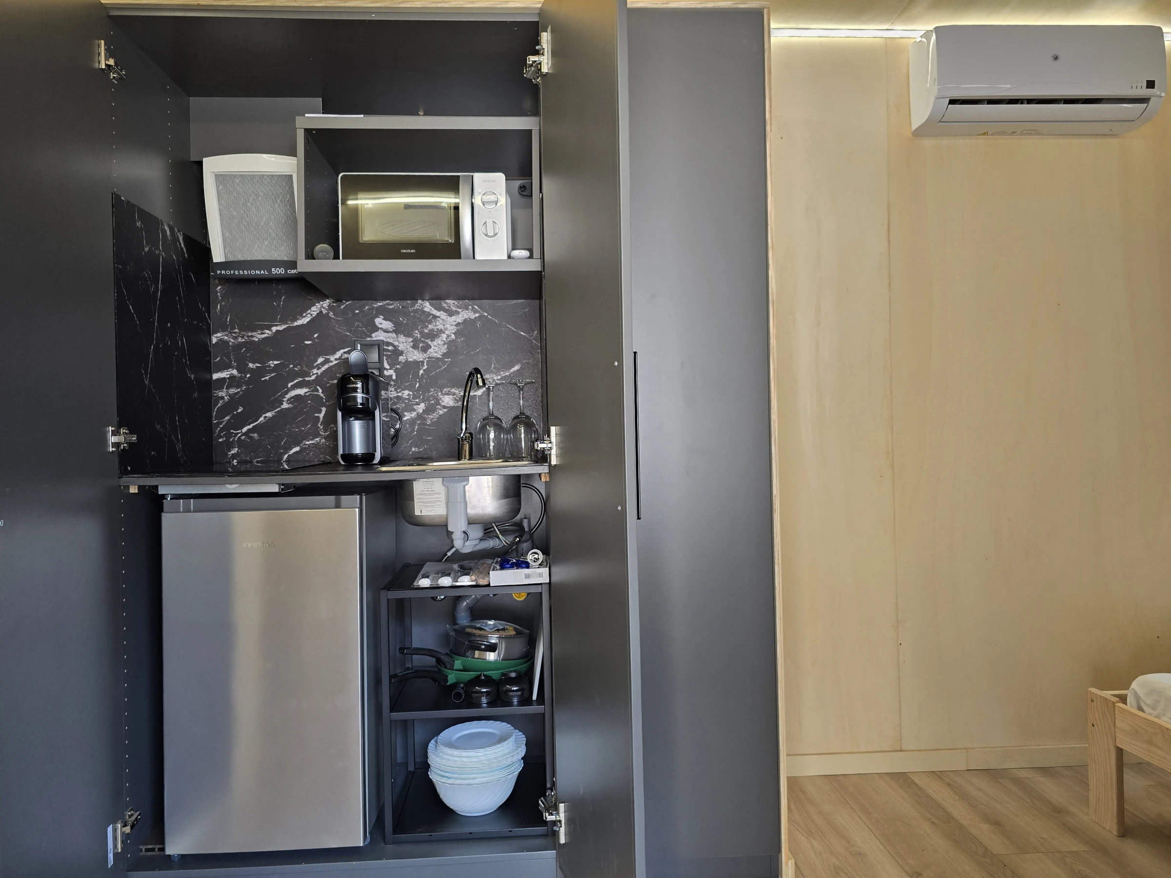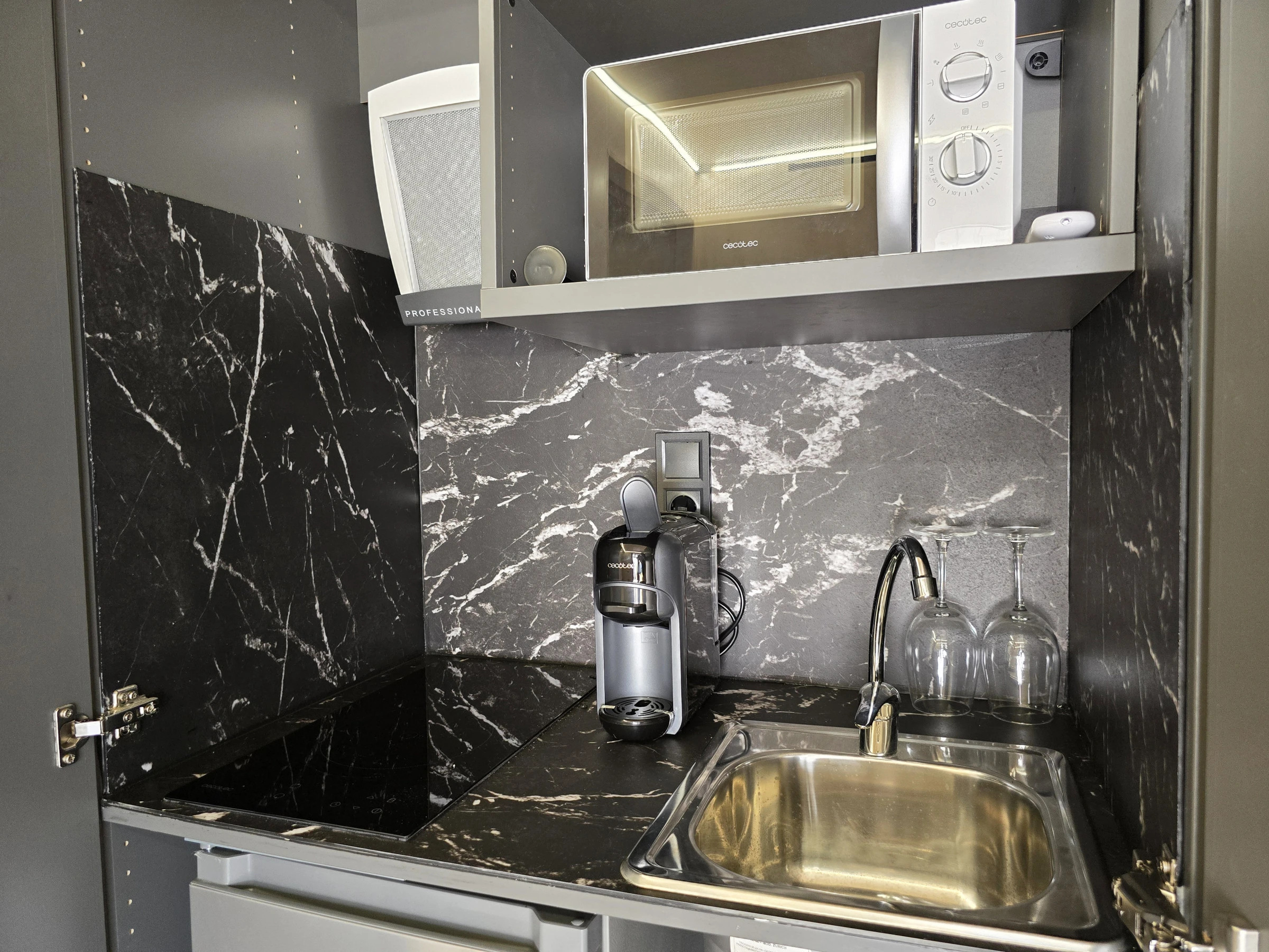 Dieses küche, ist ausgestattet in kühlschrank, mikrowelle, kochutensilien und kaffeemaschine.