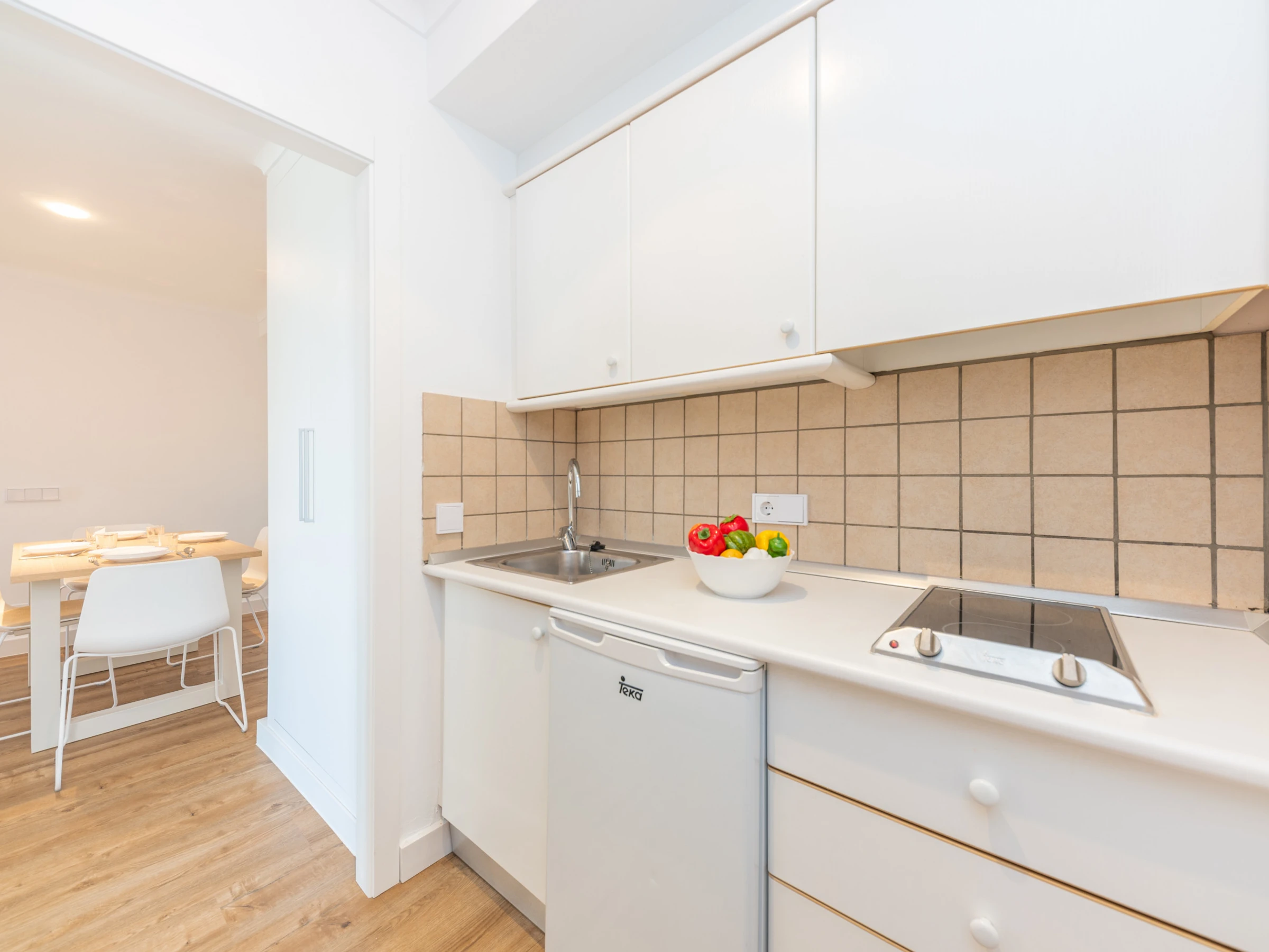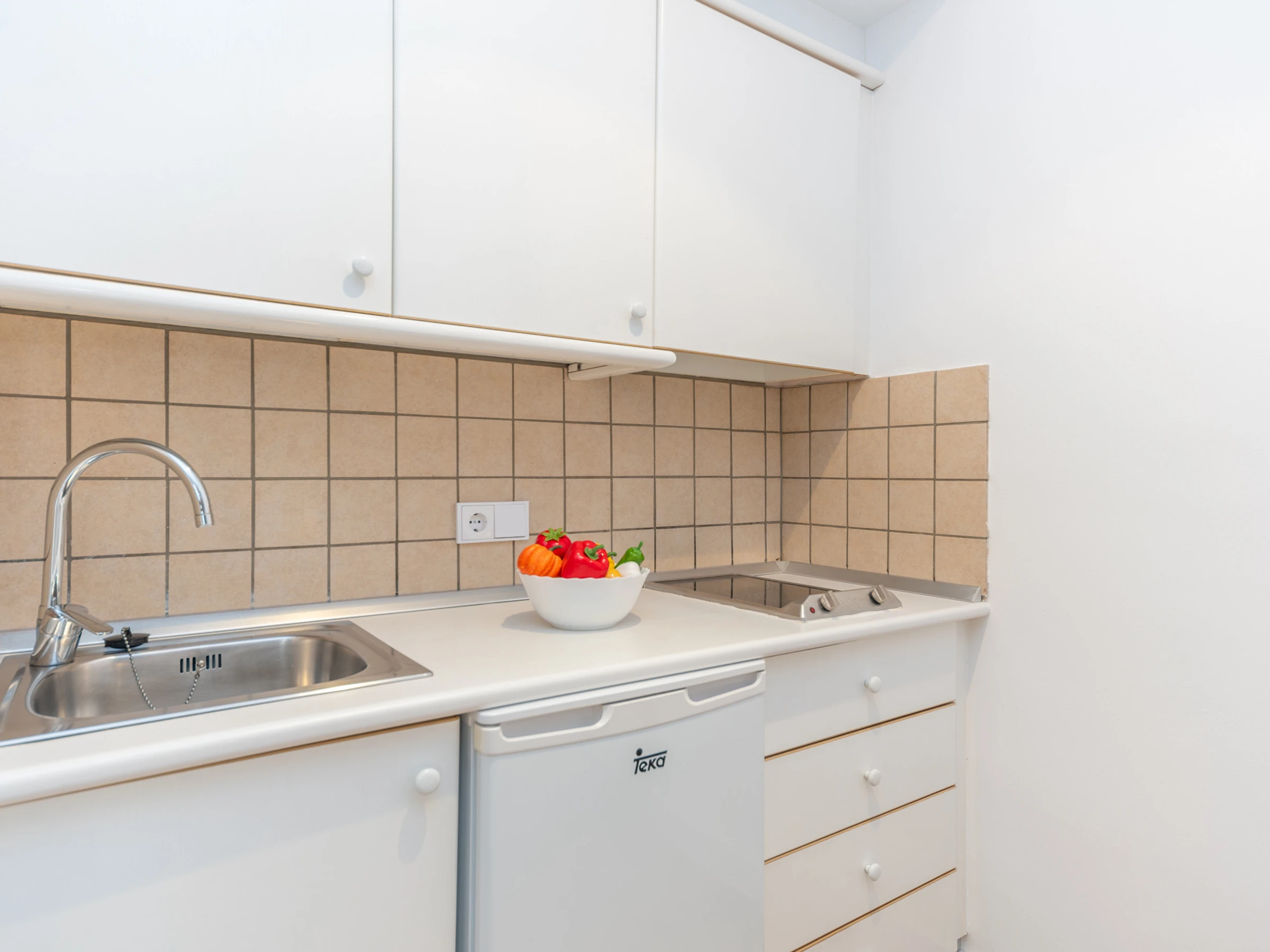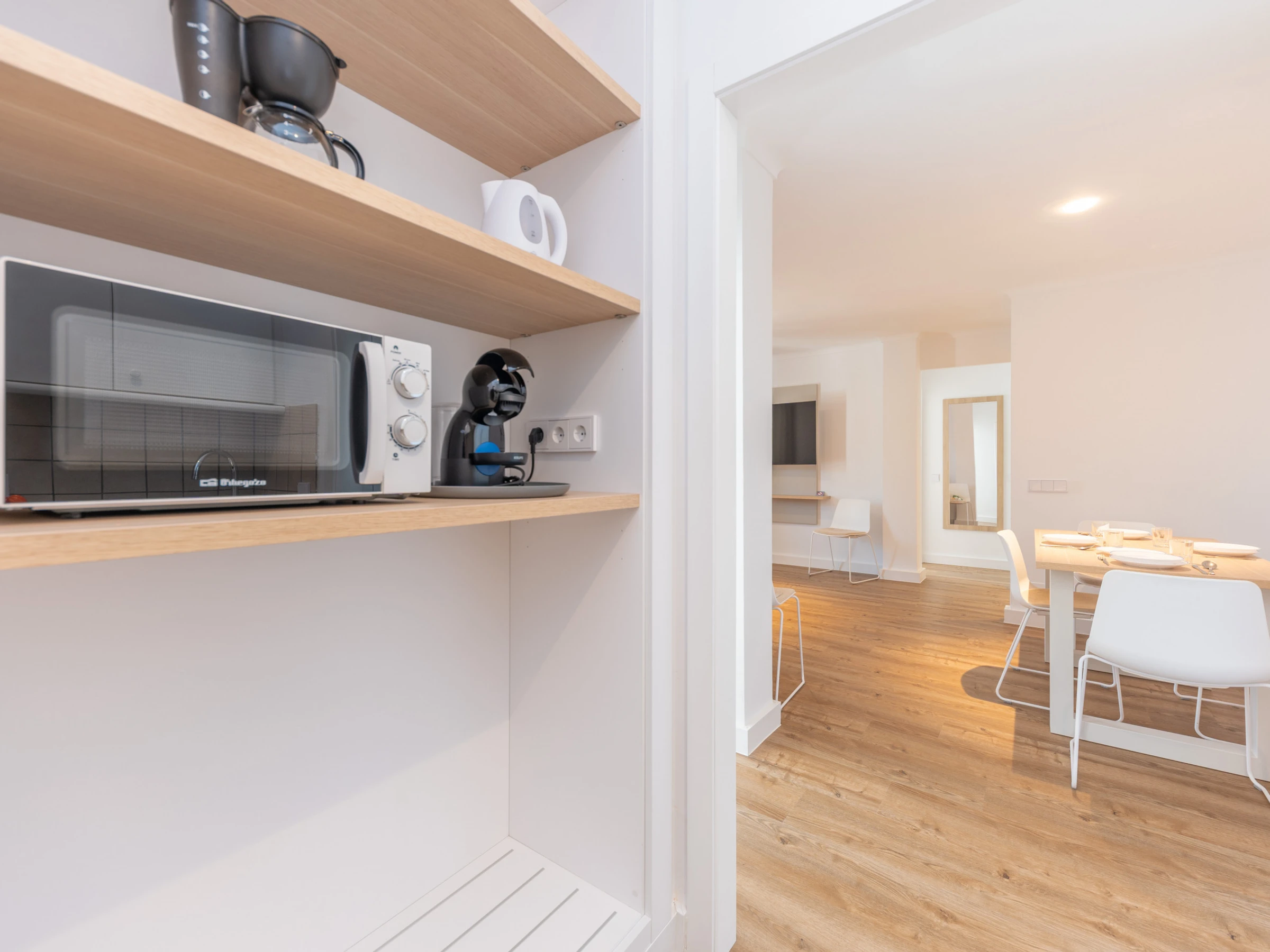 Dieses küche, ist ausgestattet in mikrowelle, gefrierschrank und kaffeemaschine.
