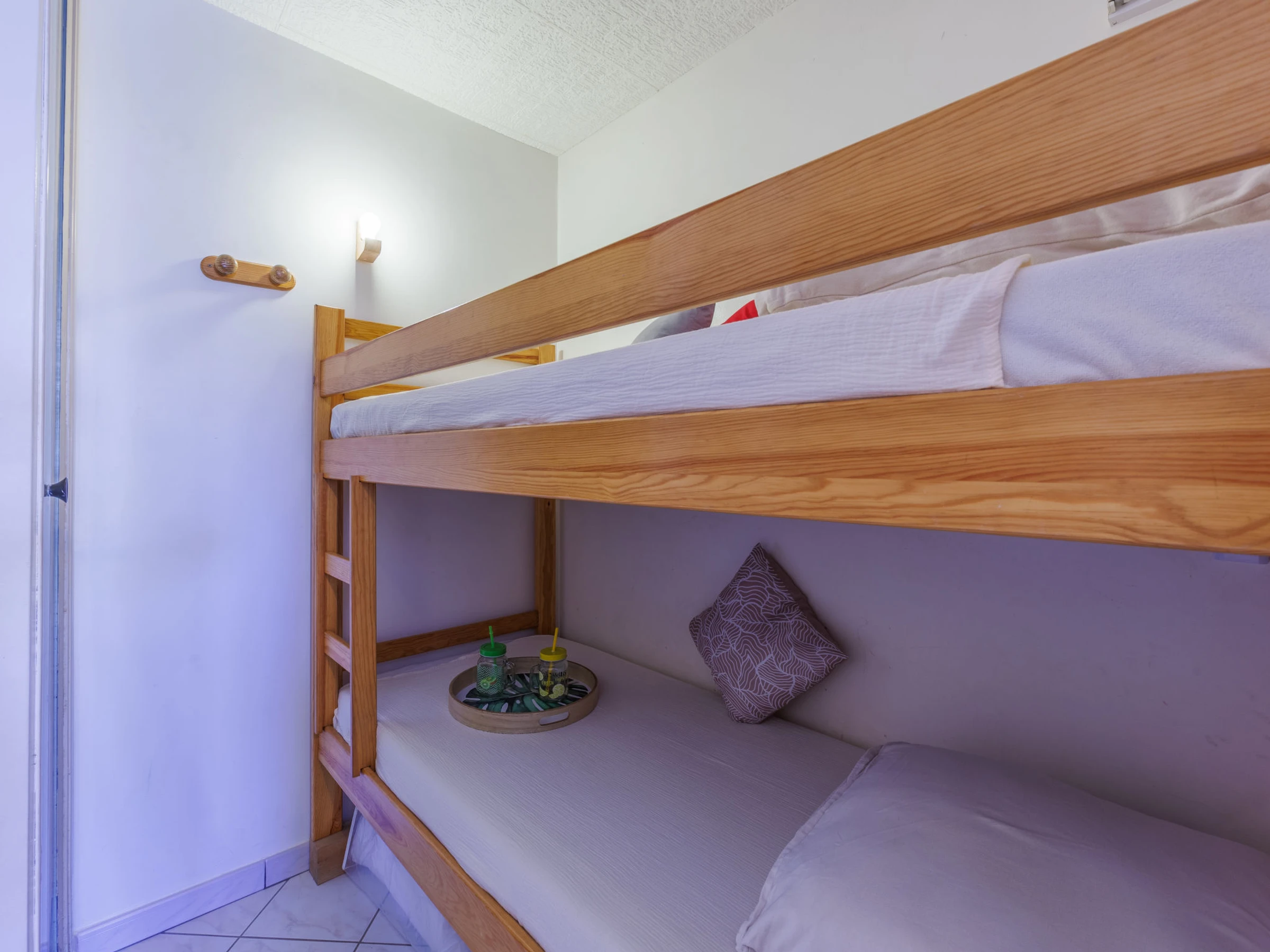 1-Zimmer-Studio 20 m2, im Erdgeschoss. Wohn-/Schlafzimmer mit 1 Wandschrankbett (140 cm, Länge 190 cm), TV (Flachbildschirm), Klimaanlage. Ausgang zur Terrasse. Offene Kabine mit 1 x 2 Etagenbetten (140 cm, Länge 190 cm). Kochnische (Backofen, Geschirrspüler, 2 Glaskeramikplatten, Toaster, Wasserkocher, Mikrowelle, elektrische Kaffeemaschine, Kapseln für die Kaffeemaschine (Nespresso)). Dusche/WC. E-Heizung. Grosse Terrasse 10 m2. Terrassenmöbel. Zur Verfügung: Waschmaschine. Internet (WLAN, extra). Parkplatz Nr. 35. Bitte beachten: Rauchmelder. Anstelle eines abgeschlossenen Schlafzimmers befinden sich manche Schlafplätze in einem offenen Bereich (Galerie, Nische etc.). Inserat einer Privatperson nach Artikel 155, IV, CGI.