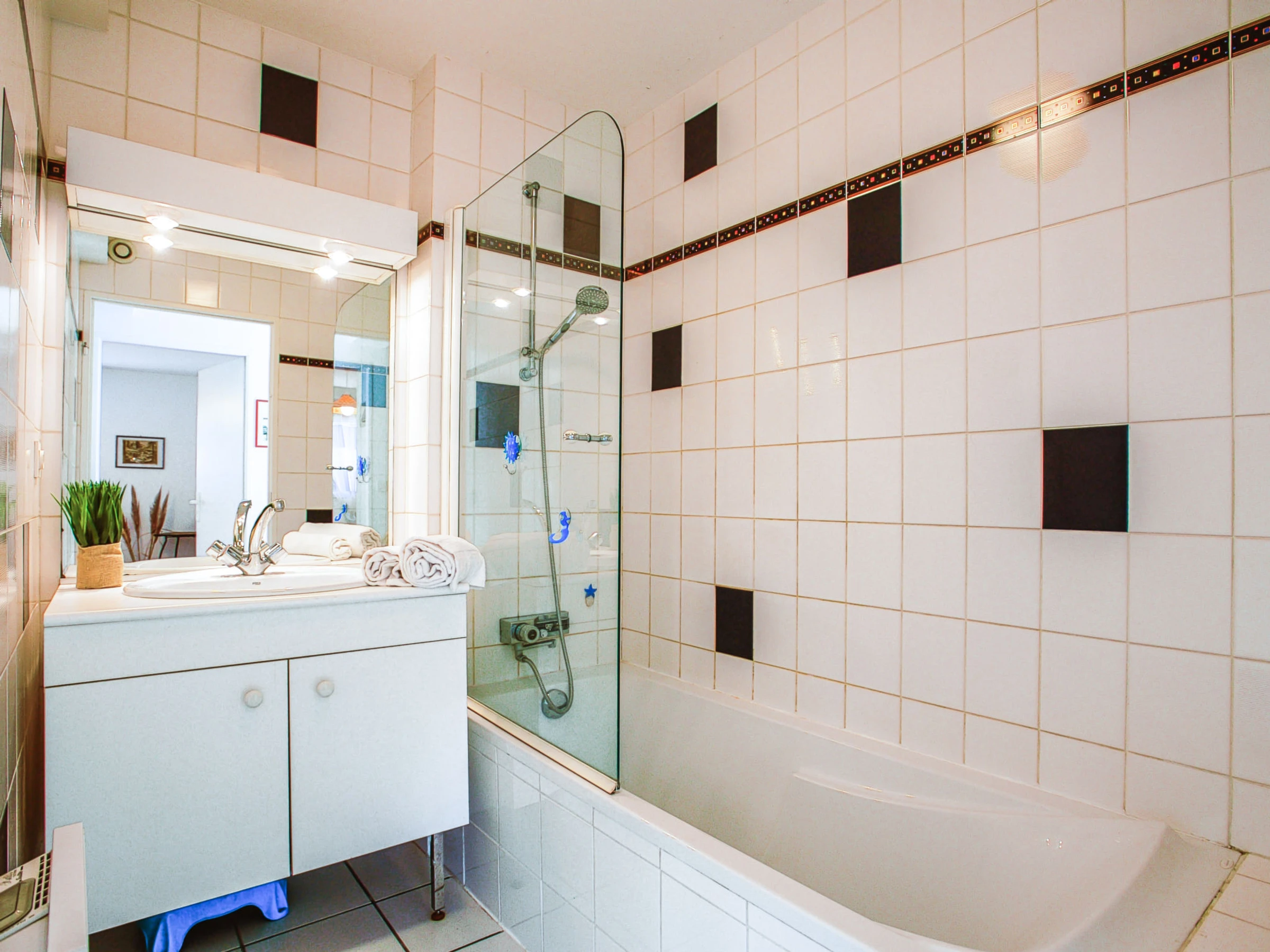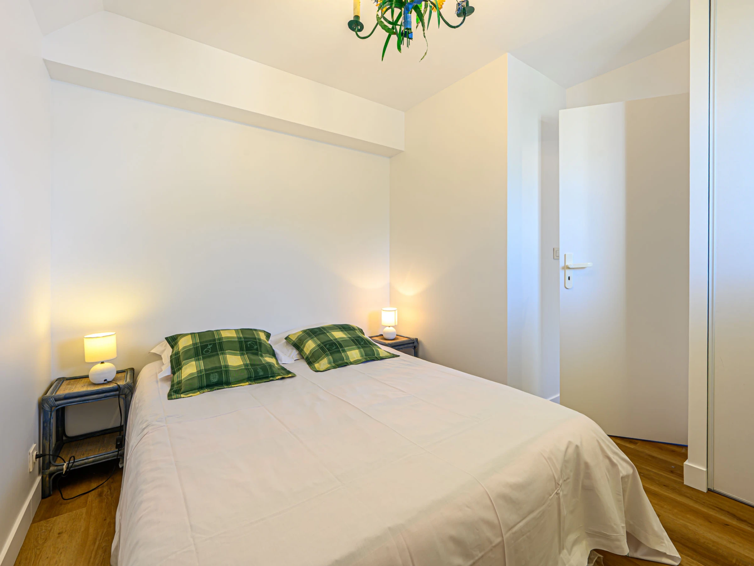 4-Zimmer-Wohnung 60 m2 auf 2 Stockwerken, im Erdgeschoss, Südlage. Komfortabel eingerichtet: Wohn-/Esszimmer mit TV (Flachbildschirm). Ausgang zur Terrasse. 1 Zimmer mit 2 Betten (80 cm, Länge 190 cm). Kochnische (Backofen, Geschirrspüler, 4 Glaskeramikplatten, Mikrowelle, elektrische Kaffeemaschine). Bad, sep. WC. Obergeschoss: 1 Zimmer mit 1 franz. Bett (140 cm, Länge 190 cm). 1 Zimmer mit 1 Bett (90 cm, Länge 190 cm). Dusche, sep. WC. E-Heizung. Terrasse 10 m2. Terrassenmöbel, Liegestühle (2). Zur Verfügung: Waschmaschine, Babybett. Internet (WLAN, gratis). Parkplatz Nr. 5. Bitte beachten: TV nur FR. Rauchmelder. [hidden]