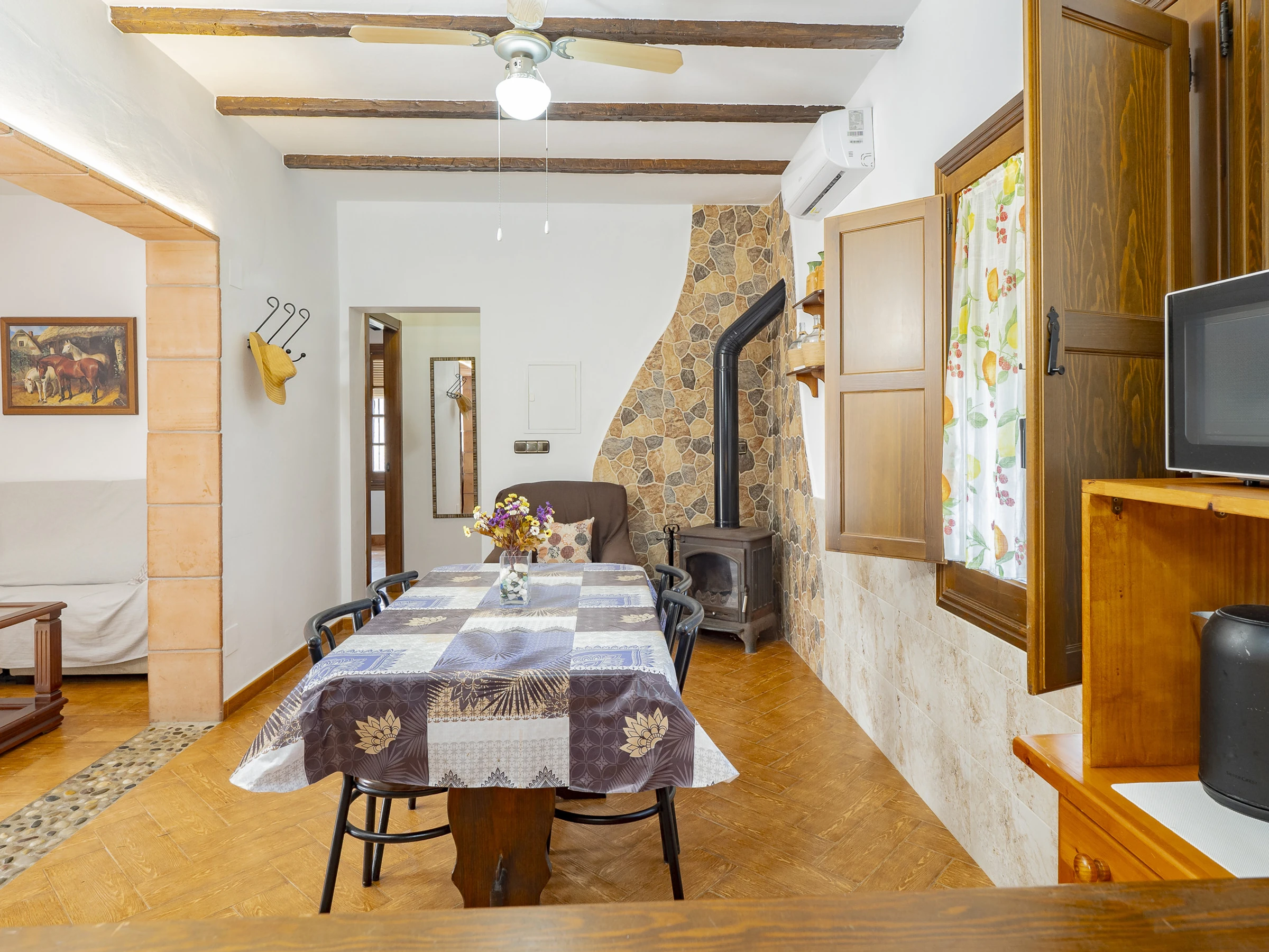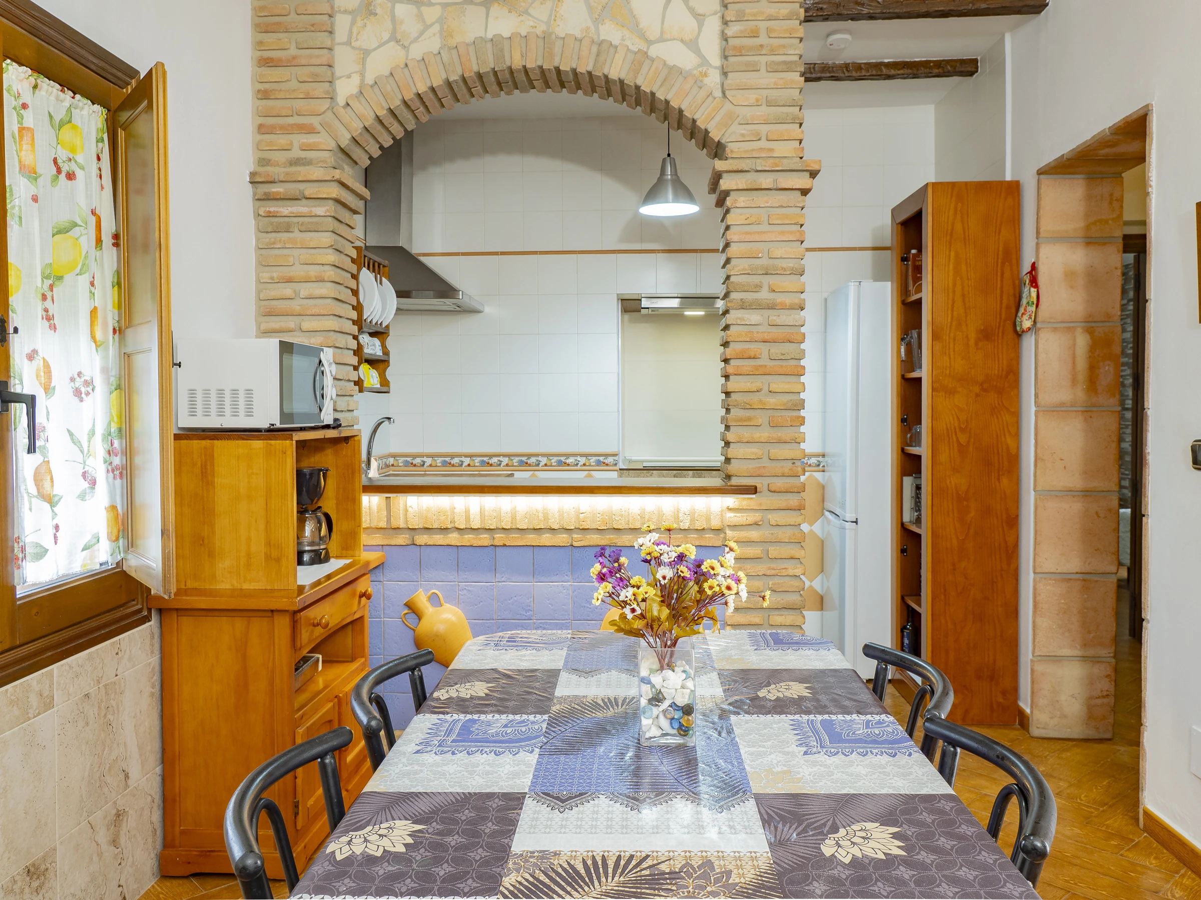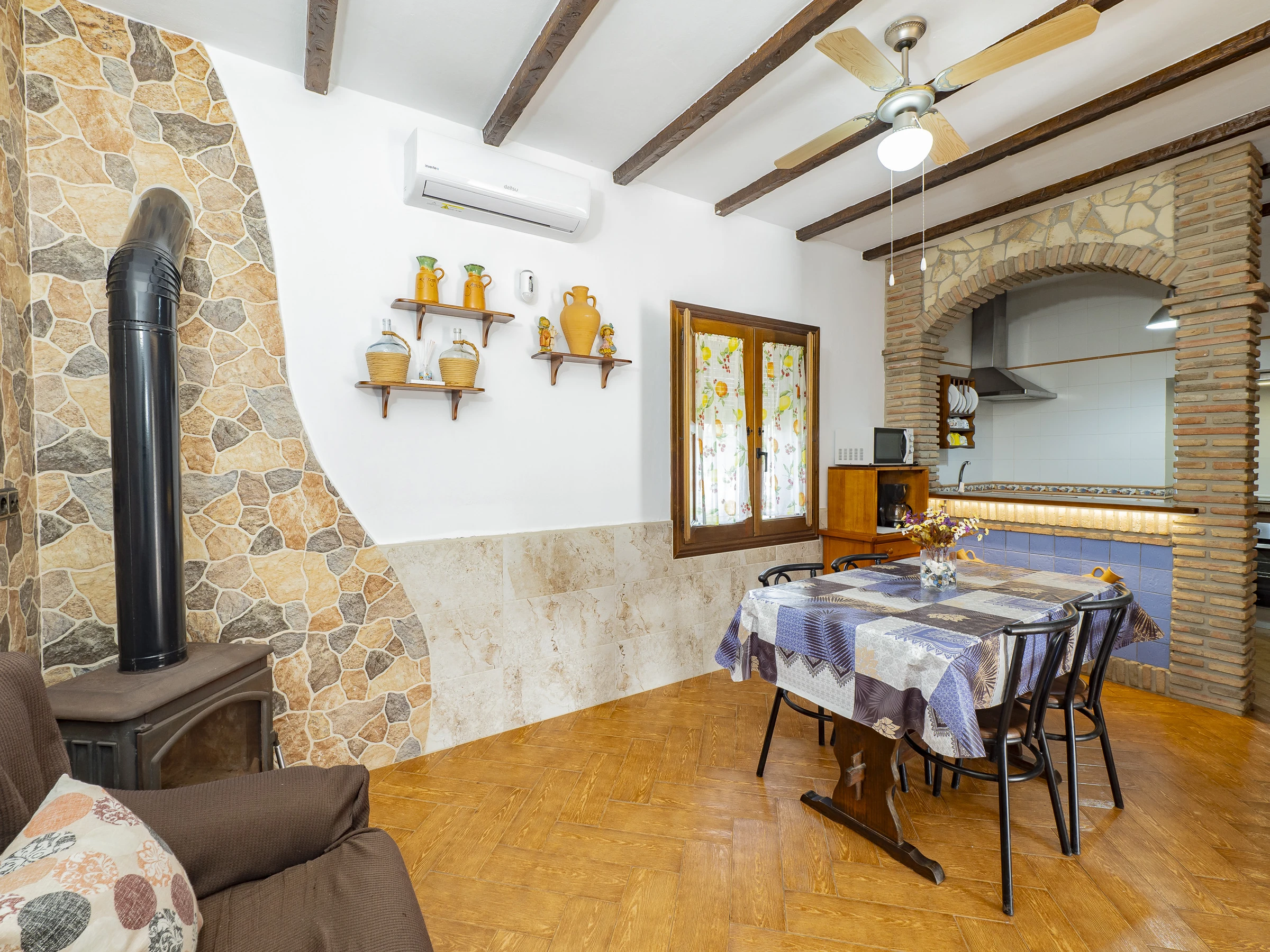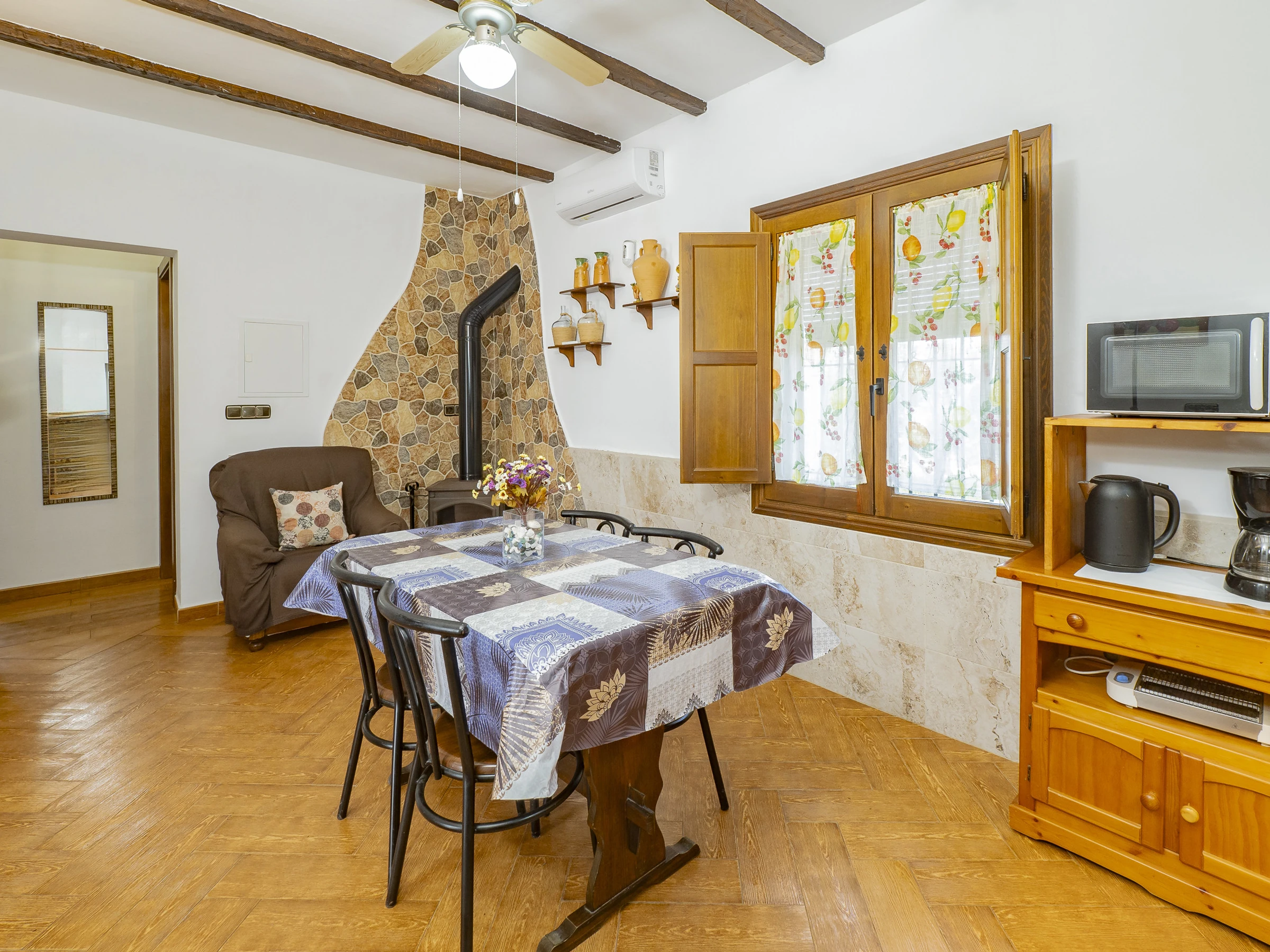 Das Innere des Hauses ist gemütlich und funktional, mit einem Wohnzimmer, das mit Fernseher und bequemem Mobiliar zum Ausruhen ausgestattet ist. Die offene Küche, durch eine Theke getrennt, ist vollständig ausgestattet mit Glaskeramikkochfeld, Kühlschrank, Mikrowelle, Ofen, Gefrierschrank, Kaffeemaschine, Toaster, Wasserkocher, Entsafter und allem Notwendigen, um deine Mahlzeiten bequem zuzubereiten. Der integrierte Essbereich ist perfekt, um Frühstücke, Mittagessen oder Abendessen in einer warmen und familiären Atmosphäre zu teilen.