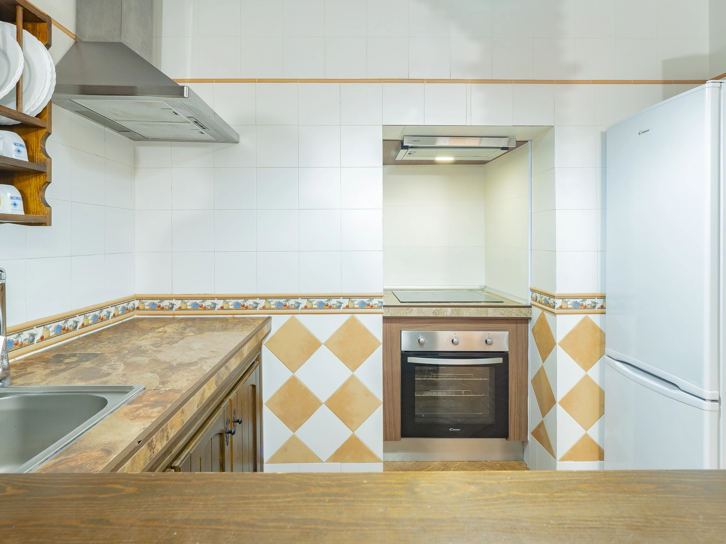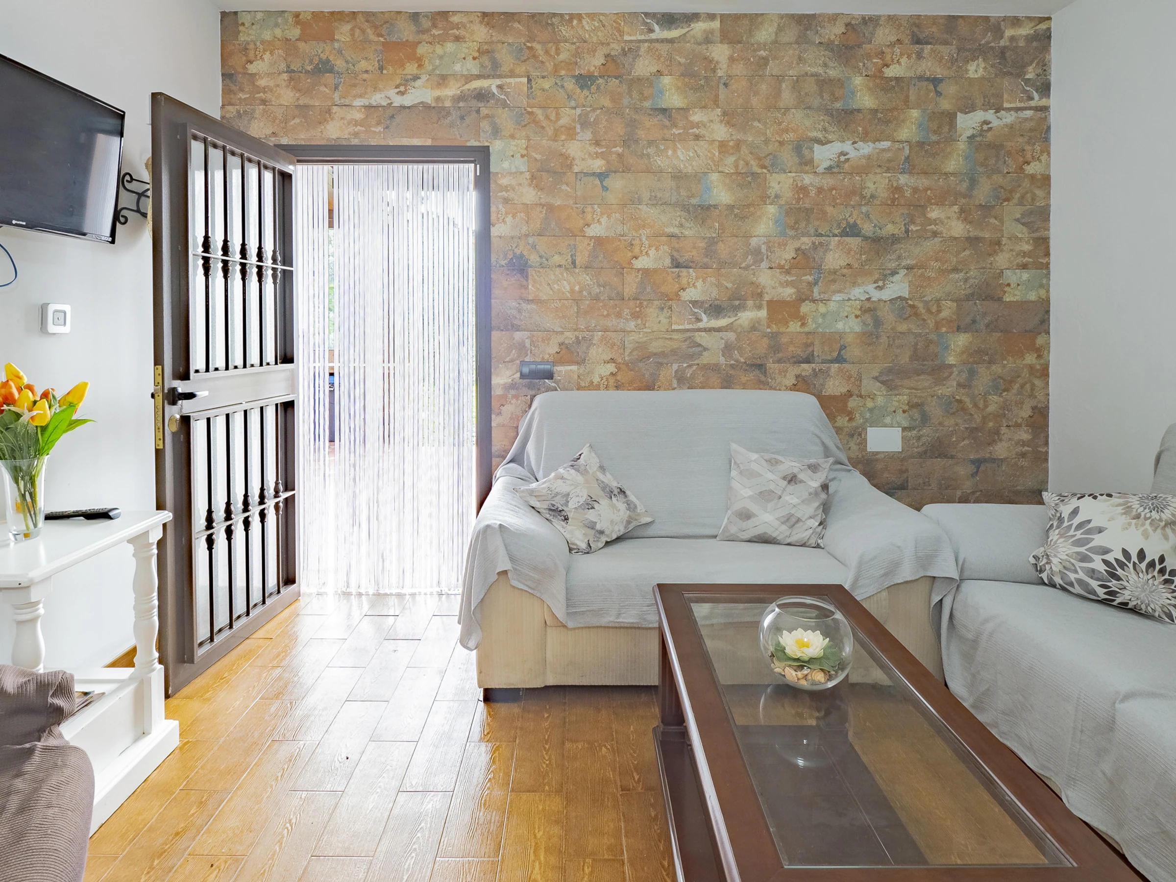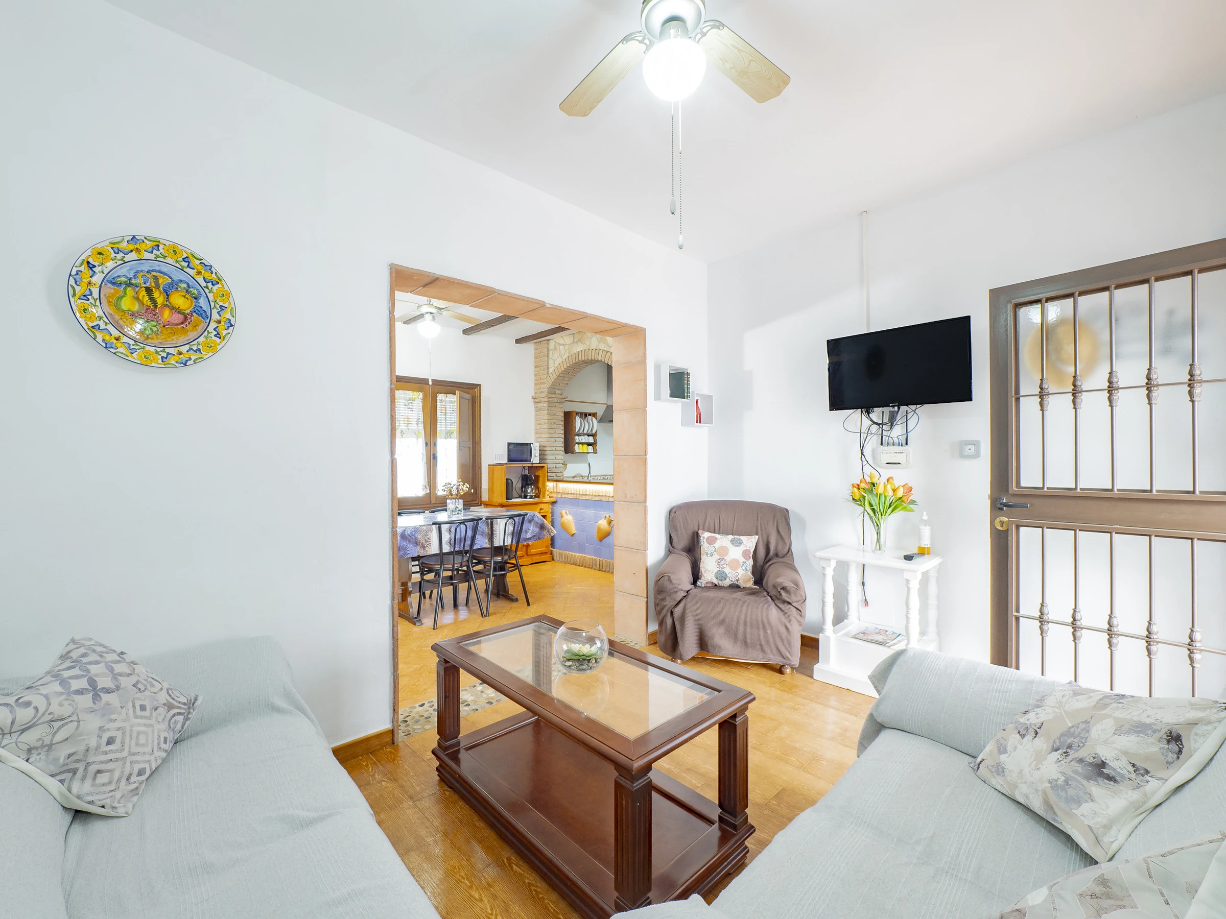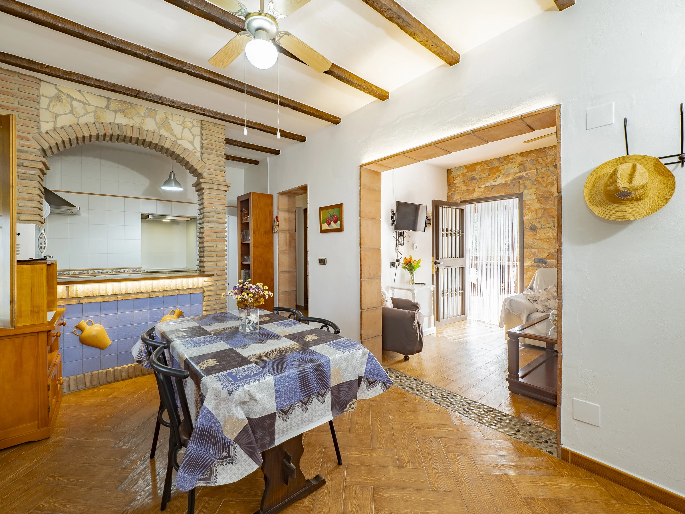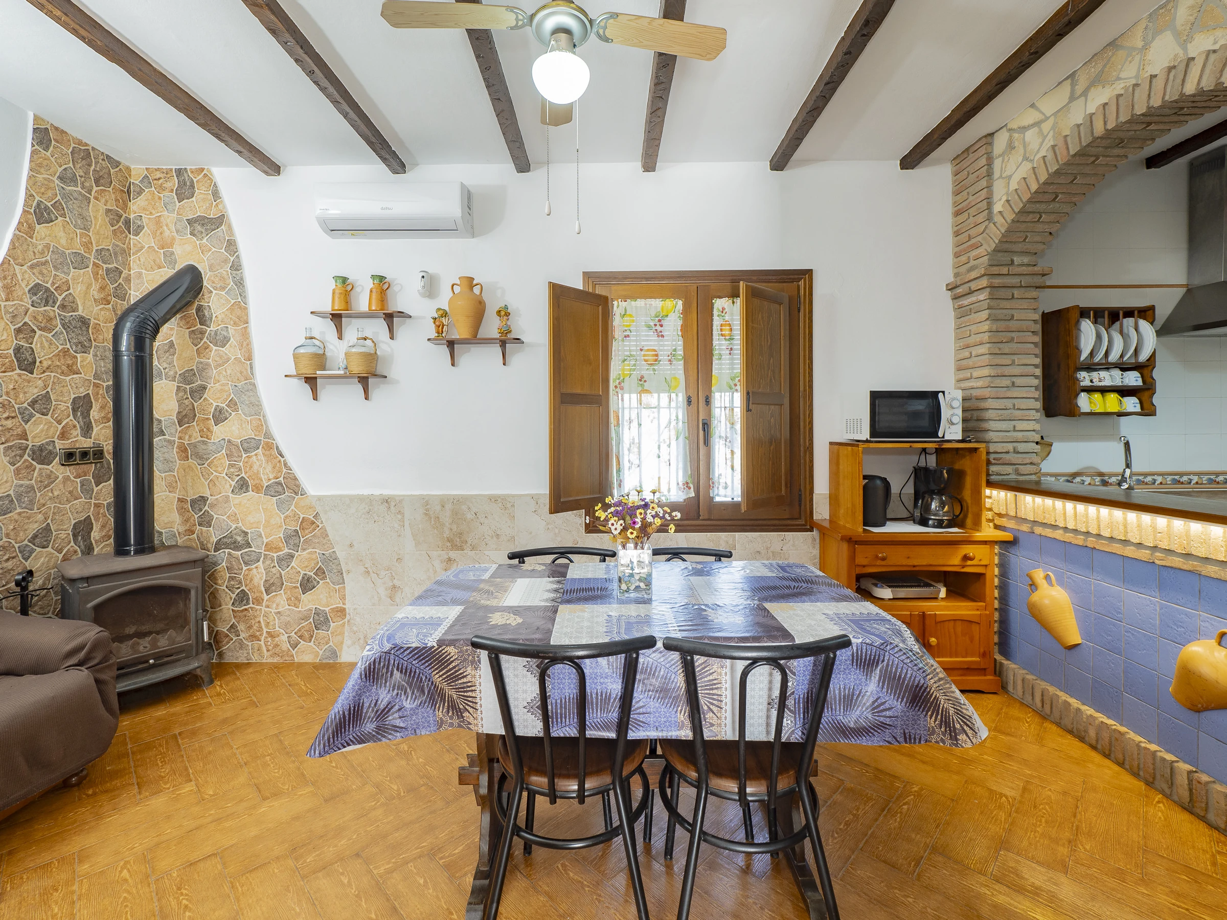 Das Innere des Hauses ist gemütlich und funktional, mit einem Wohnzimmer, das mit Fernseher und bequemem Mobiliar zum Ausruhen ausgestattet ist. Die offene Küche, durch eine Theke getrennt, ist vollständig ausgestattet mit Glaskeramikkochfeld, Kühlschrank, Mikrowelle, Ofen, Gefrierschrank, Kaffeemaschine, Toaster, Wasserkocher, Entsafter und allem Notwendigen, um deine Mahlzeiten bequem zuzubereiten. Der integrierte Essbereich ist perfekt, um Frühstücke, Mittagessen oder Abendessen in einer warmen und familiären Atmosphäre zu teilen.