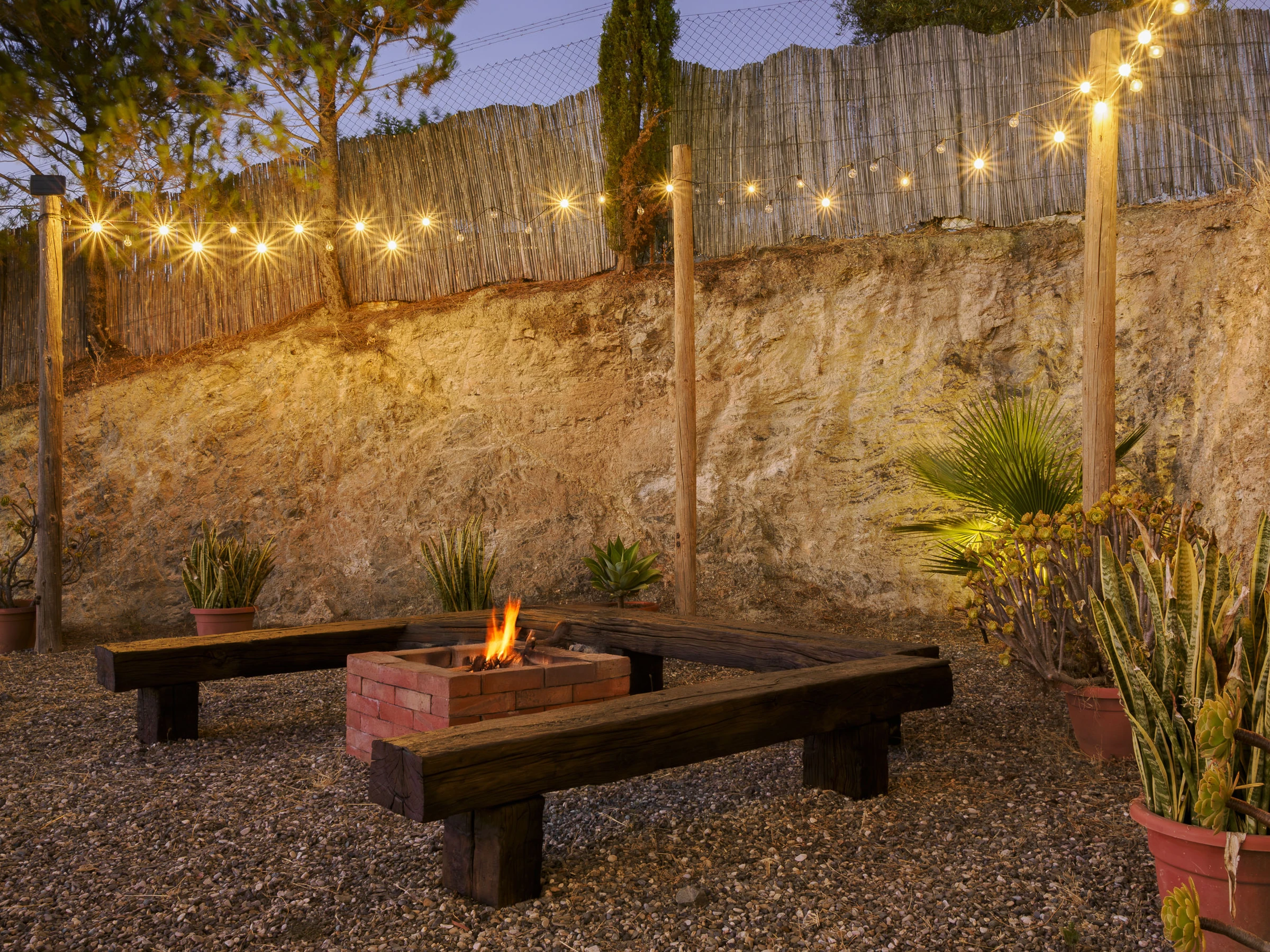 Das Ferienhaus verfügt über drei Schlafzimmer mit Platz für 8 Personen: zwei Schlafzimmer links vom Eingang und eines rechts, alle mit Außenfenster und Platz zum Aufbewahren von Gepäck. Die Betten sind verteilt auf ein Doppelbett, ein Einzelbett und ein Stockbett; das Hauptschlafzimmer bietet ein Doppelbett und ein Einzelbett. Zusätzlich verfügt es über ein Innenbadezimmer mit Dusche und ein weiteres vollständiges Badezimmer im Freien mit Dusche, was die Bequemlichkeit für große Gruppen erleichtert.