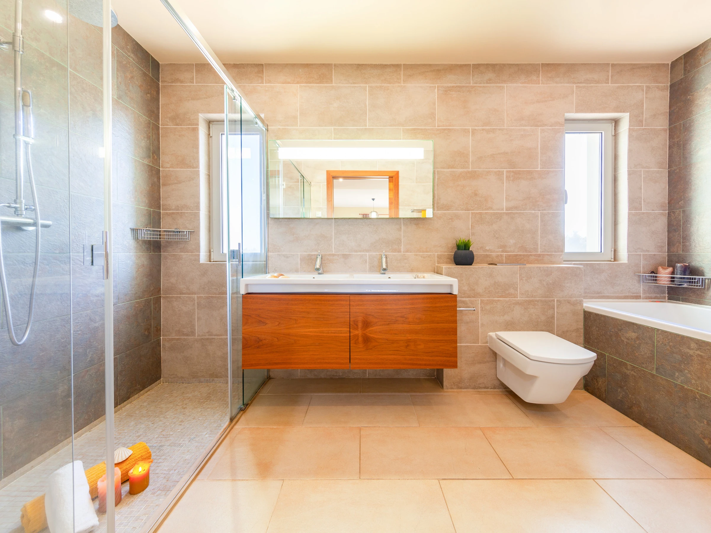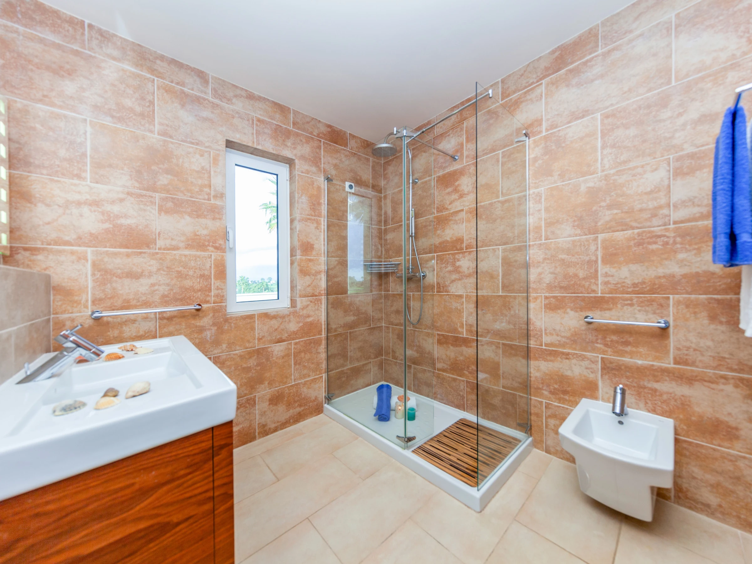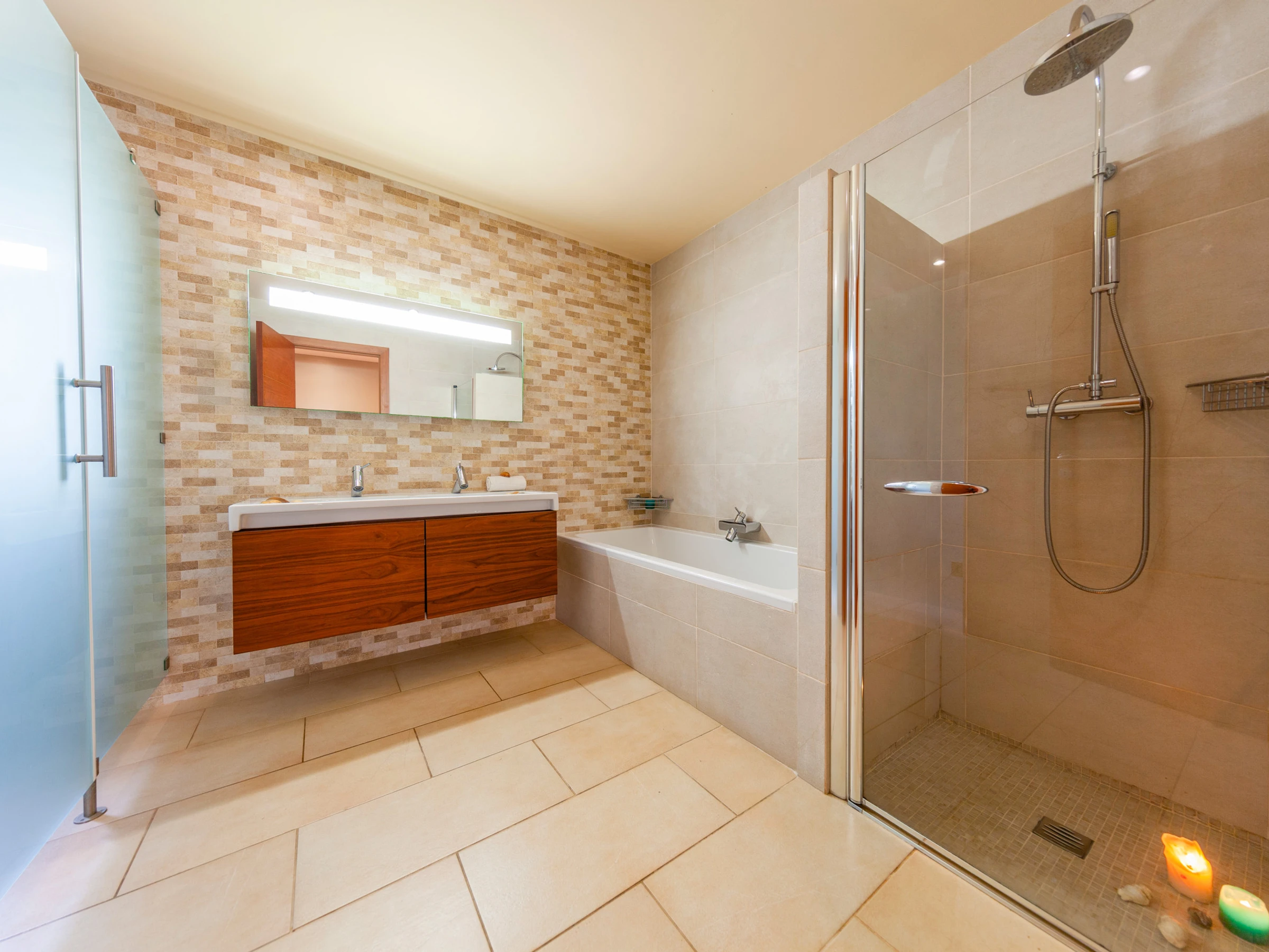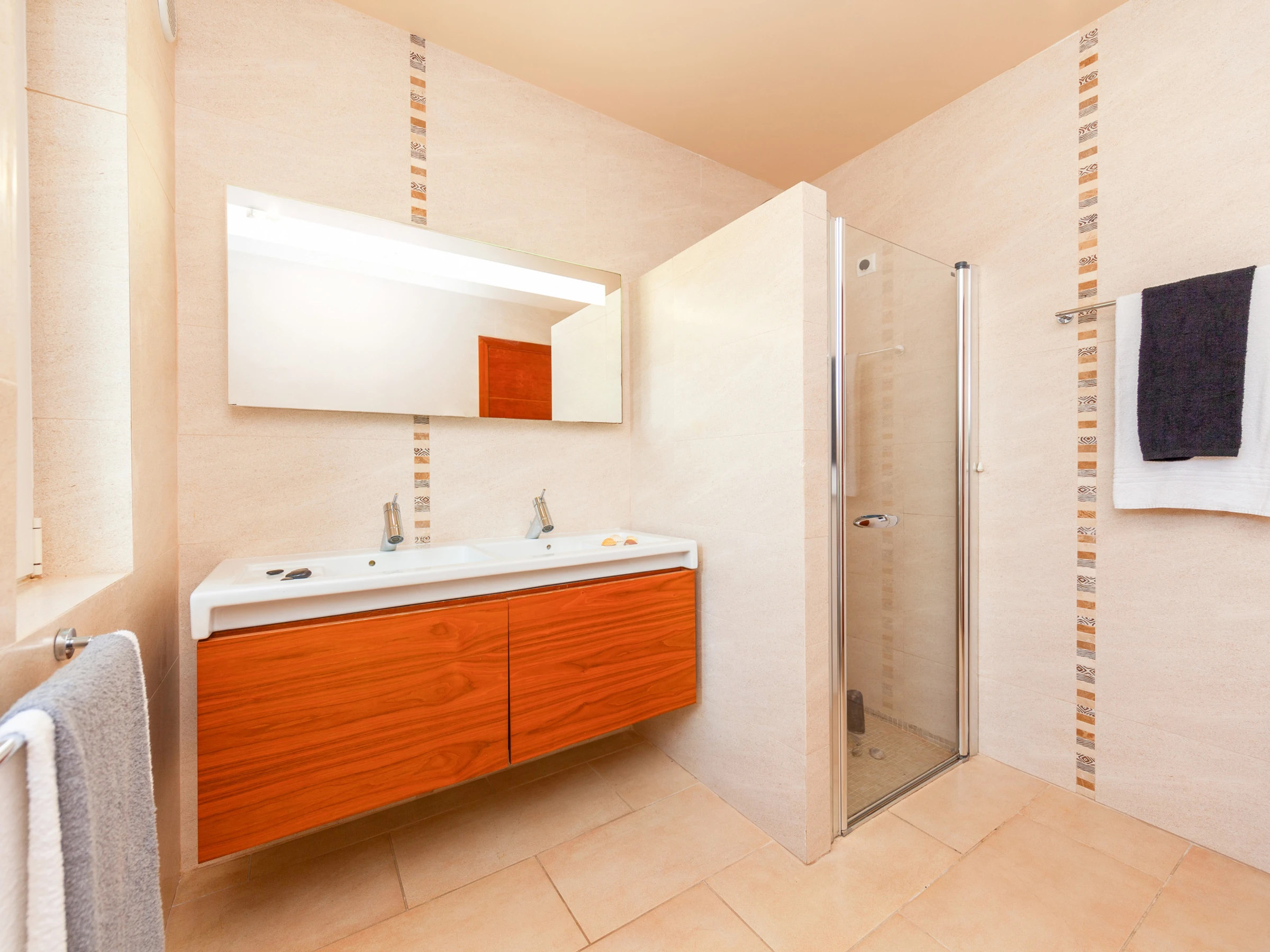 Im ersten Stock gibt es zwei Zimmer, beide mit Doppelbett und eigenem Badezimmer. Eines verfügt über Dusche und Badewanne, das andere nur über eine Dusche, was vollständigen Komfort und Privatsphäre gewährleistet.