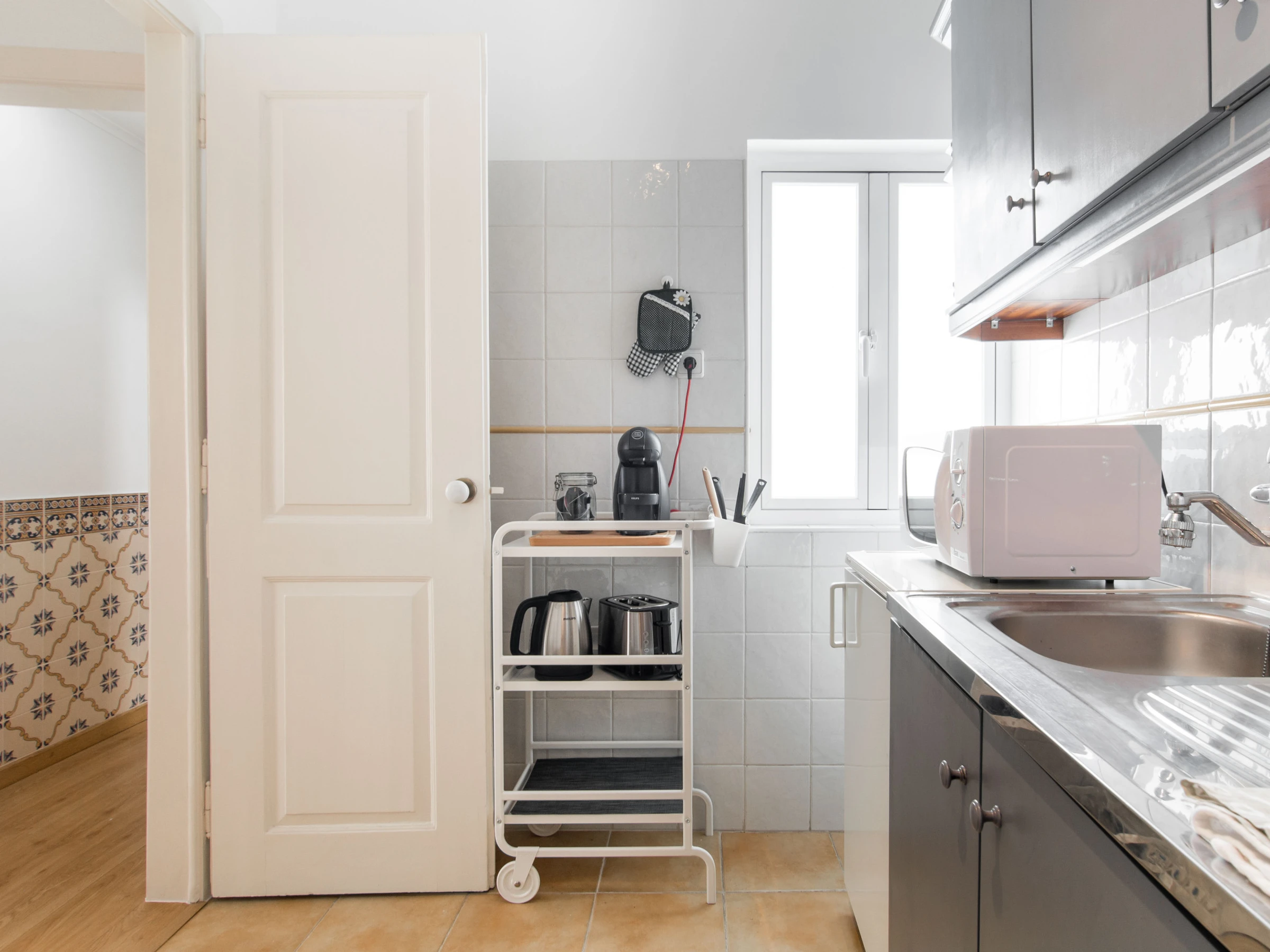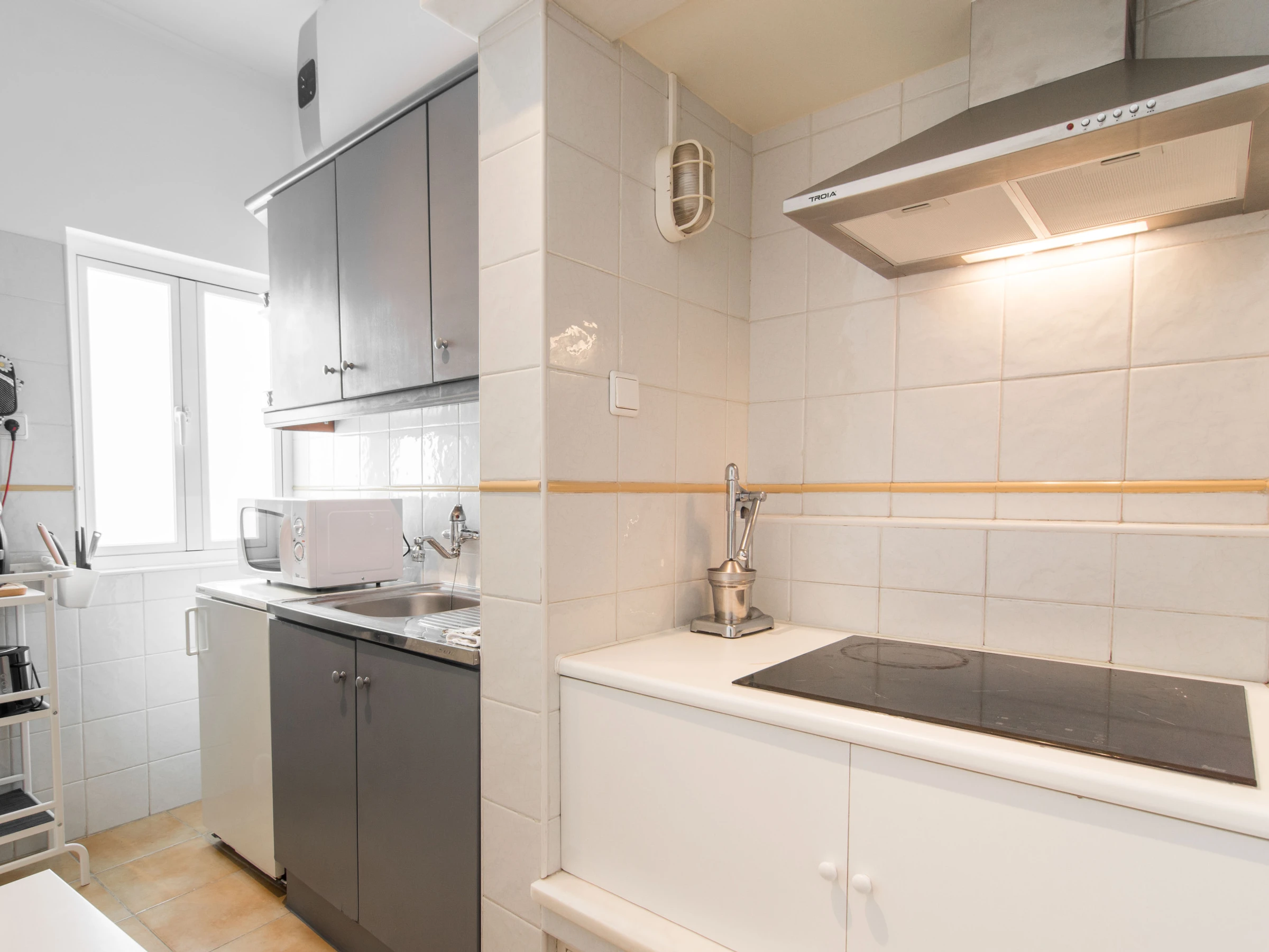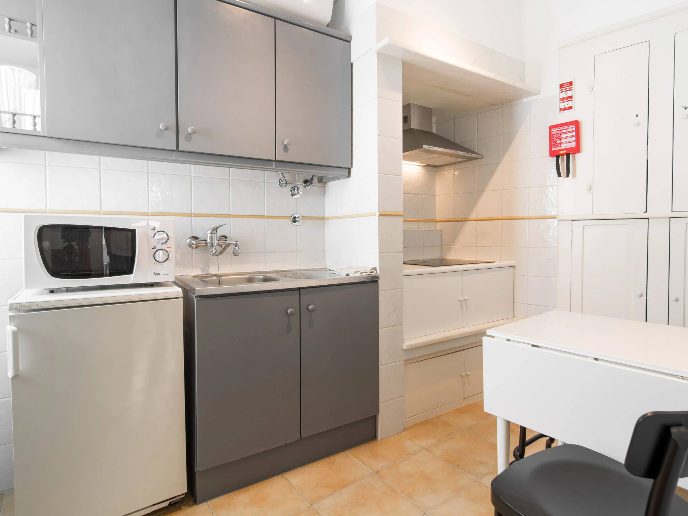 Dieses separate küche, mit ceranfeld, ist ausgestattet in kühlschrank, mikrowelle, backofen, gefrierschrank, geschirr/besteck, kochutensilien, kaffeemaschine, toaster und wasserkocher.