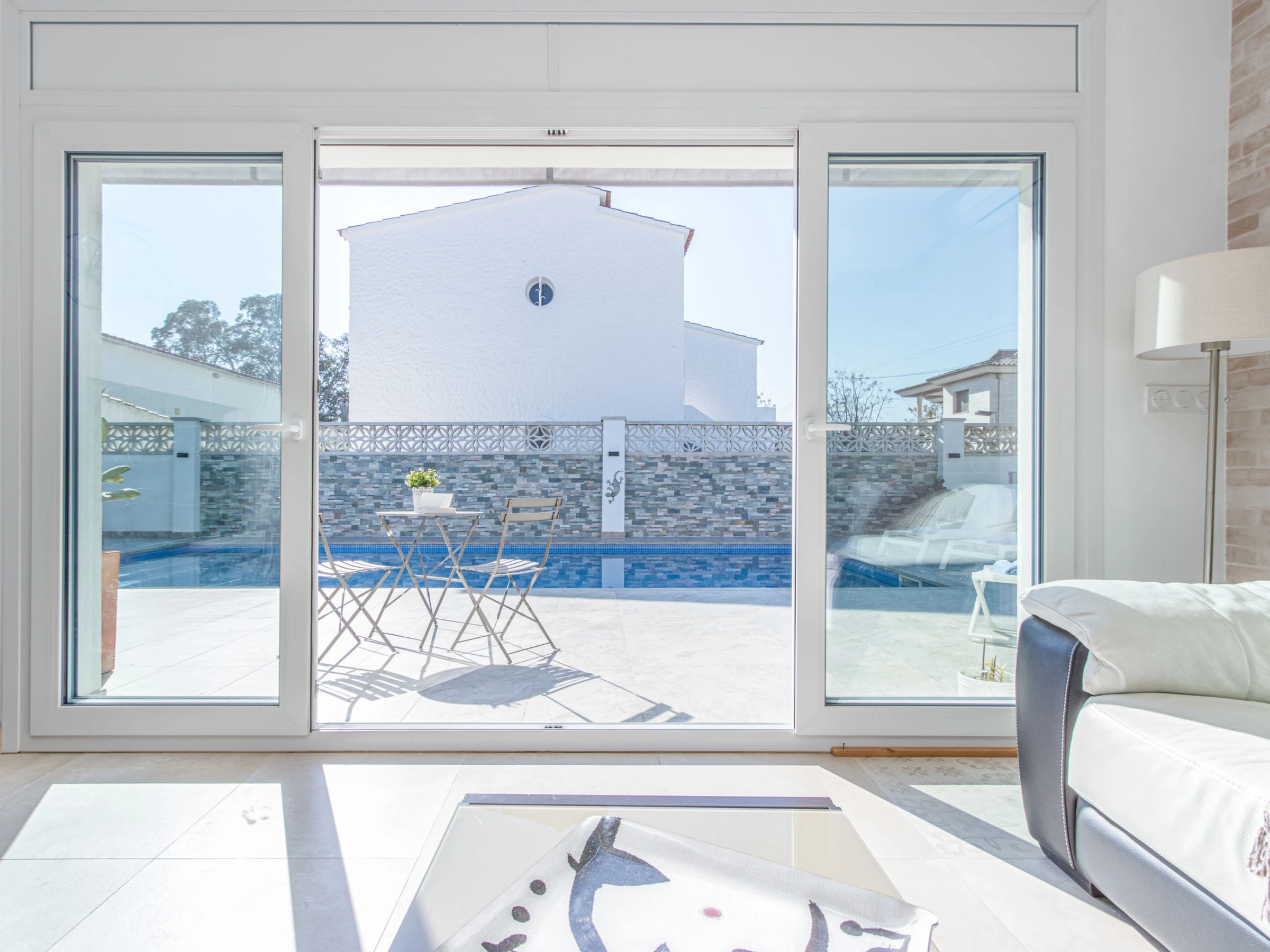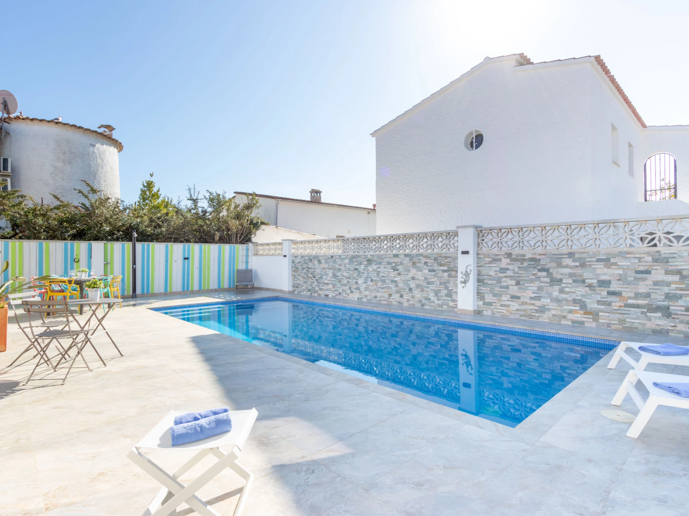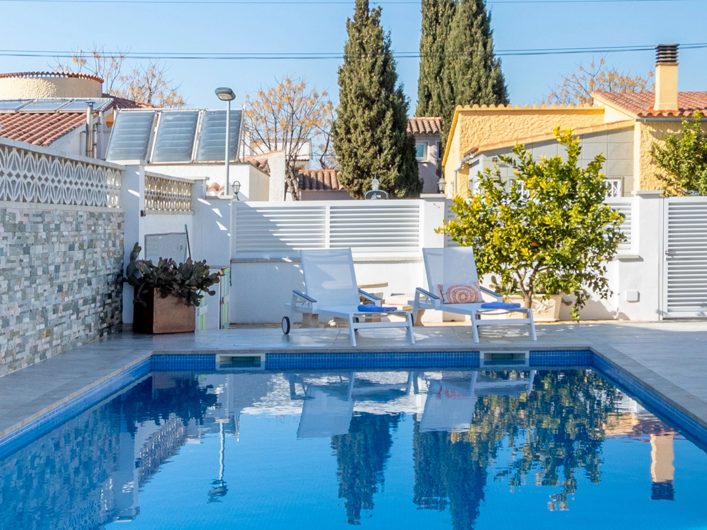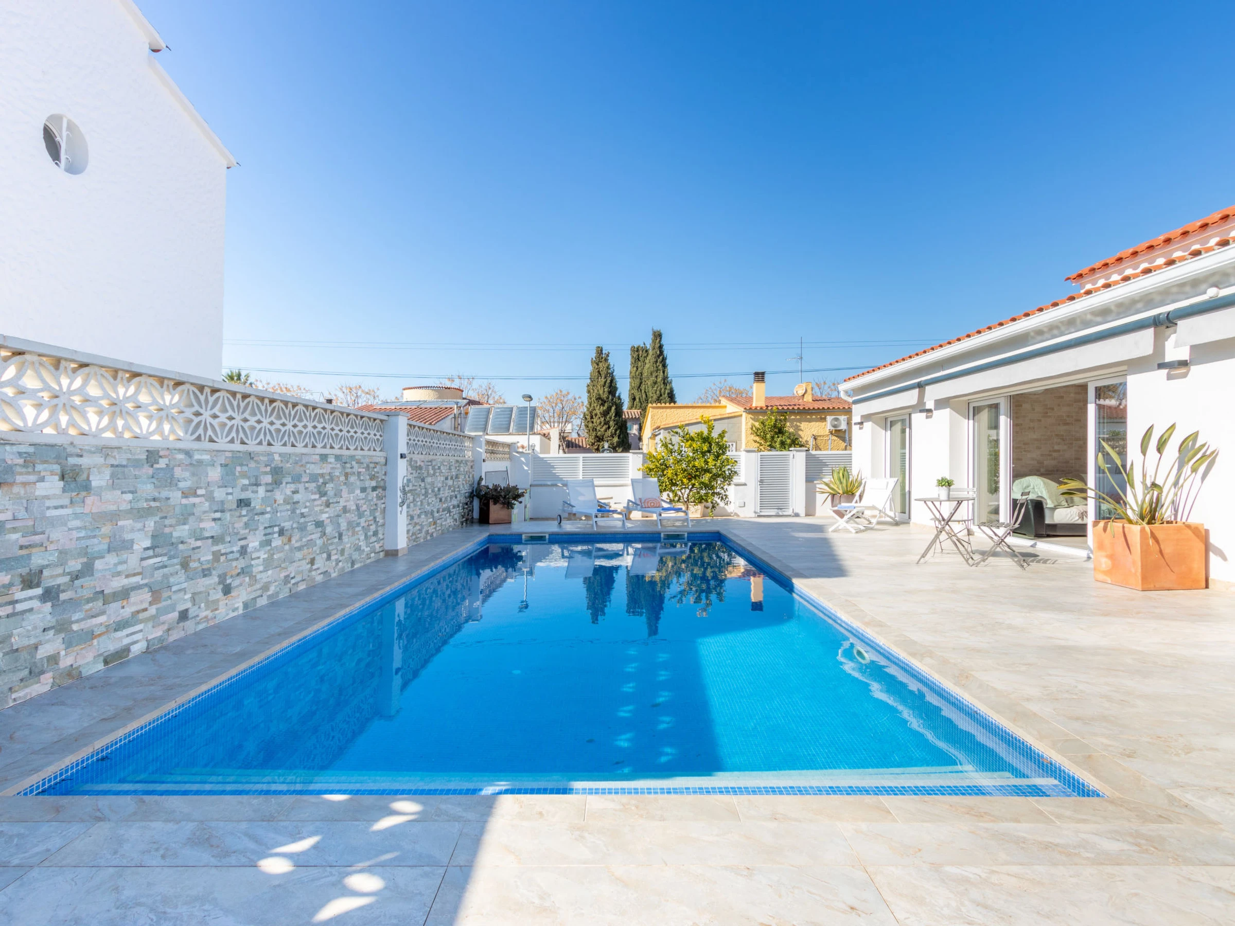 Modernes, gemütliches, komfortables Haus "Filisa", renoviert im Jahre 2021. Im Ortsteil Montgri, 800 m vom Zentrum von Empuriabrava, ruhige, sonnige Lage im Villenviertel, verkehrsberuhigte Zone, 1 km vom Meer, 1 km vom Strand, 220 m vom Fluss, in einer Sackgasse. Zur Alleinbenutzung: Grundstück (eingezäunt), schöner, gepflegter Garten mit Pflanzen, Schwimmbad eckig (4 x 10 m, 100 - 200 cm tief, saisonale Verfügbarkeit: [hidden] - [hidden] mit Innentreppe. Aussendusche, Pergola, Terrasse, Gartenmöbel. Im Hause: Waschmaschine, Wäschetrockner. Parkplatz auf dem Grundstück. Einkaufsgeschäft 300 m, Lebensmittelgeschäft, Supermarkt 1 km, Einkaufszentrum 800 m, Restaurant, Bar, Bäckerei, Café 300 m, Bushaltestelle, Sandstrand "Empuriabrava" 1.2 km. Sporthafen 3 km, Golfplatz (18 Loch) 5 km, Surfschule 1.5 km, Segelschule 1.5 km, Tennis 2 km, Minigolf 800 m, Wanderwege ab Haus 50 m, Radweg. Nahe gelegene Sehenswürdigkeiten: Túnel del viento y skydive Empuriabrava 2 km, Parque Acuático Roses 6 km, Casino y festival de Peralada 12 km, Museo Dalí Figueres 15 km, Ruïnes de Empuries 21 km, Monasterio de Sant Pere de Rodes 23 km. Wandergebiete: Cadaqués / Cap de Creus 20 km. Der Besitzer akzeptiert keine Gruppen. Die Schlüsselübergabe findet bei der Agentur in Empuriabrava statt.