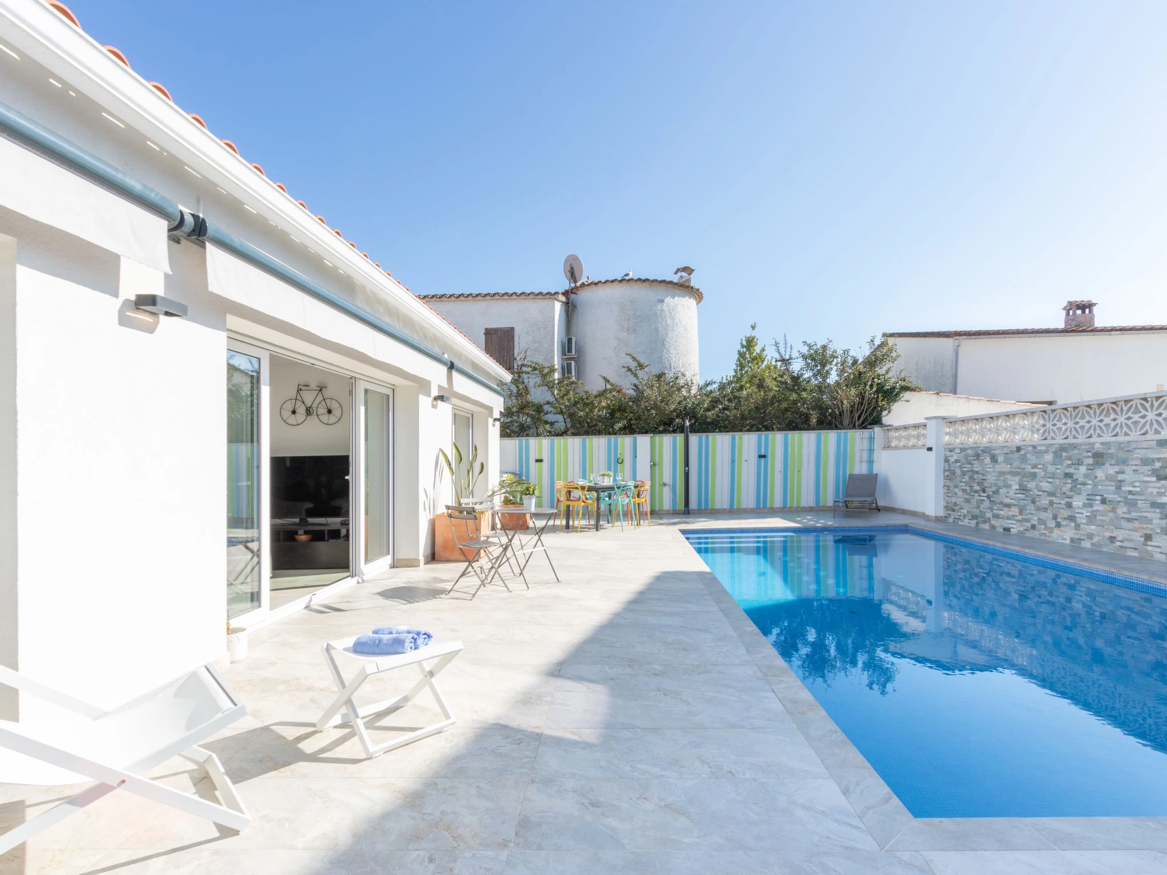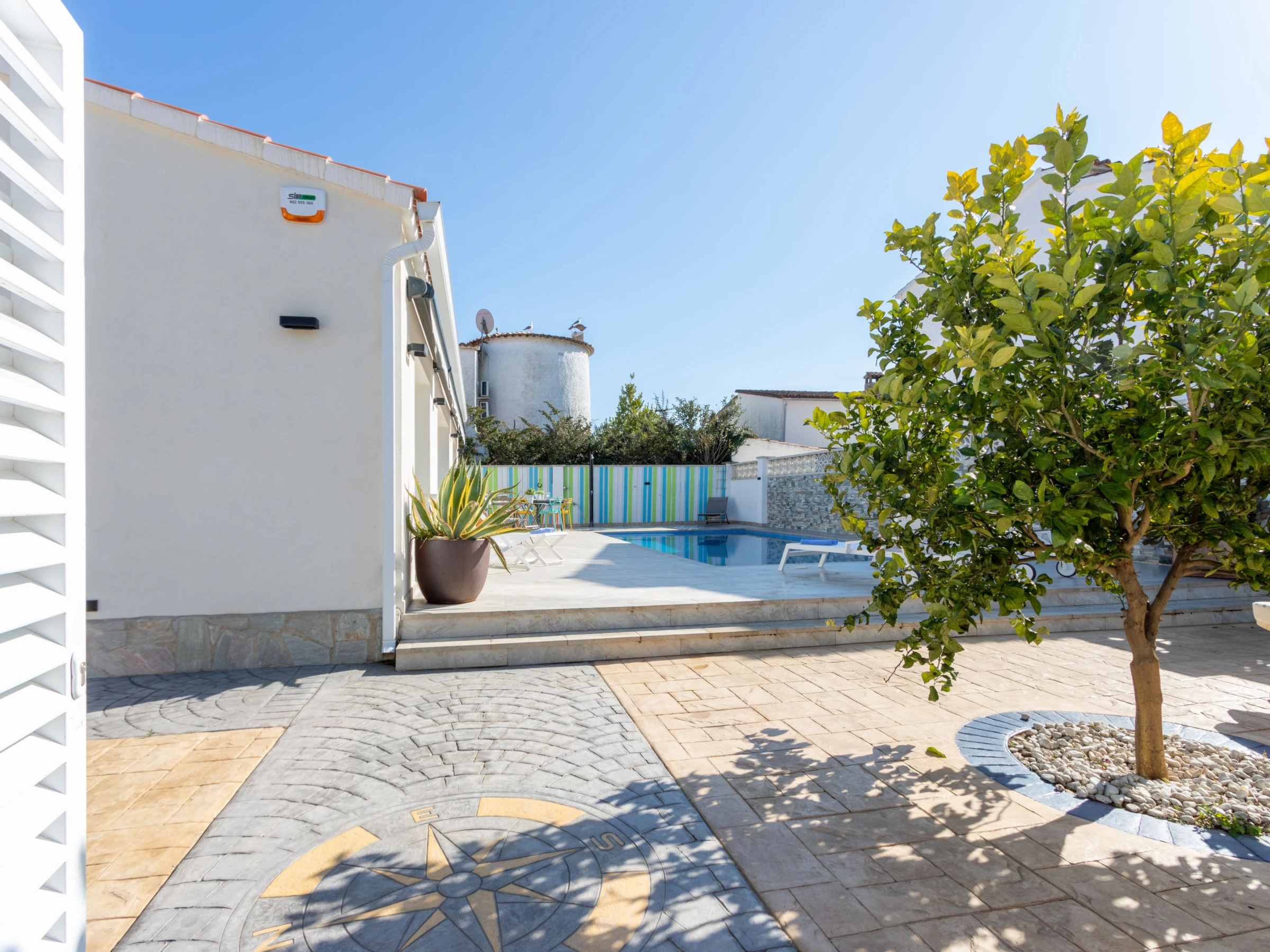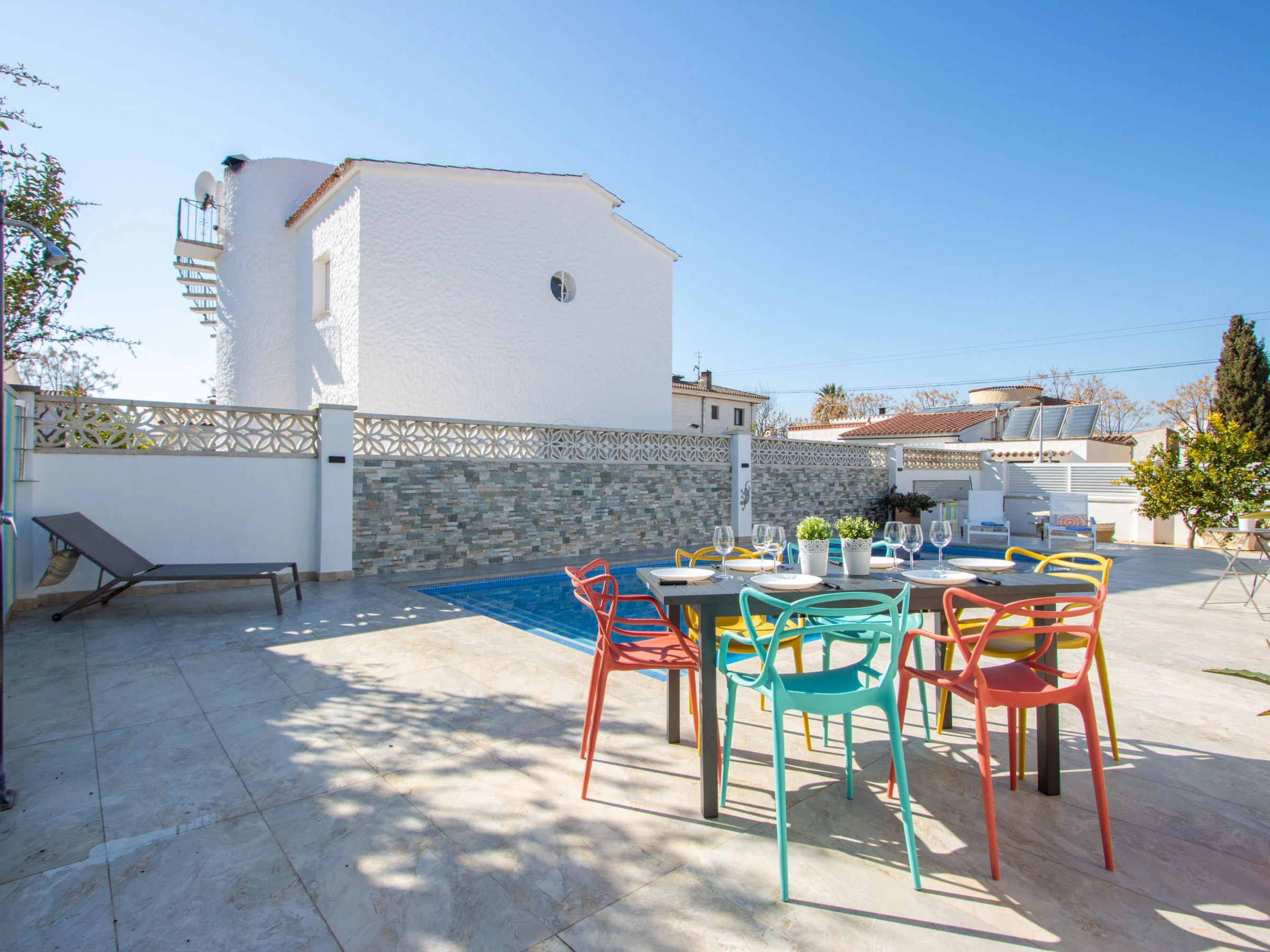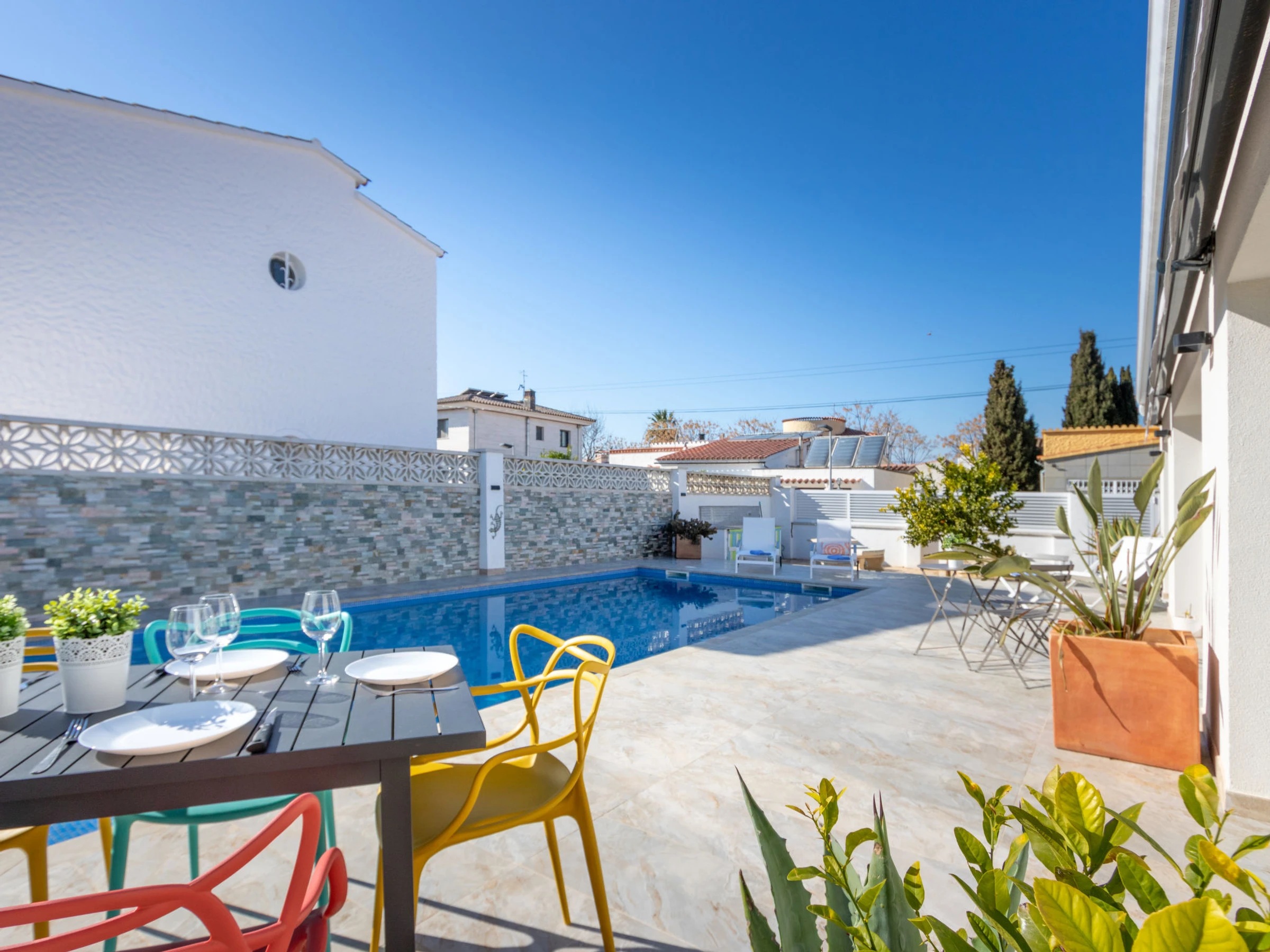 Modernes, gemütliches, komfortables Haus "Filisa", renoviert im Jahre 2021. Im Ortsteil Montgri, 800 m vom Zentrum von Empuriabrava, ruhige, sonnige Lage im Villenviertel, verkehrsberuhigte Zone, 1 km vom Meer, 1 km vom Strand, 220 m vom Fluss, in einer Sackgasse. Zur Alleinbenutzung: Grundstück (eingezäunt), schöner, gepflegter Garten mit Pflanzen, Schwimmbad eckig (4 x 10 m, 100 - 200 cm tief, saisonale Verfügbarkeit: [hidden] - [hidden] mit Innentreppe. Aussendusche, Pergola, Terrasse, Gartenmöbel. Im Hause: Waschmaschine, Wäschetrockner. Parkplatz auf dem Grundstück. Einkaufsgeschäft 300 m, Lebensmittelgeschäft, Supermarkt 1 km, Einkaufszentrum 800 m, Restaurant, Bar, Bäckerei, Café 300 m, Bushaltestelle, Sandstrand "Empuriabrava" 1.2 km. Sporthafen 3 km, Golfplatz (18 Loch) 5 km, Surfschule 1.5 km, Segelschule 1.5 km, Tennis 2 km, Minigolf 800 m, Wanderwege ab Haus 50 m, Radweg. Nahe gelegene Sehenswürdigkeiten: Túnel del viento y skydive Empuriabrava 2 km, Parque Acuático Roses 6 km, Casino y festival de Peralada 12 km, Museo Dalí Figueres 15 km, Ruïnes de Empuries 21 km, Monasterio de Sant Pere de Rodes 23 km. Wandergebiete: Cadaqués / Cap de Creus 20 km. Der Besitzer akzeptiert keine Gruppen. Die Schlüsselübergabe findet bei der Agentur in Empuriabrava statt.