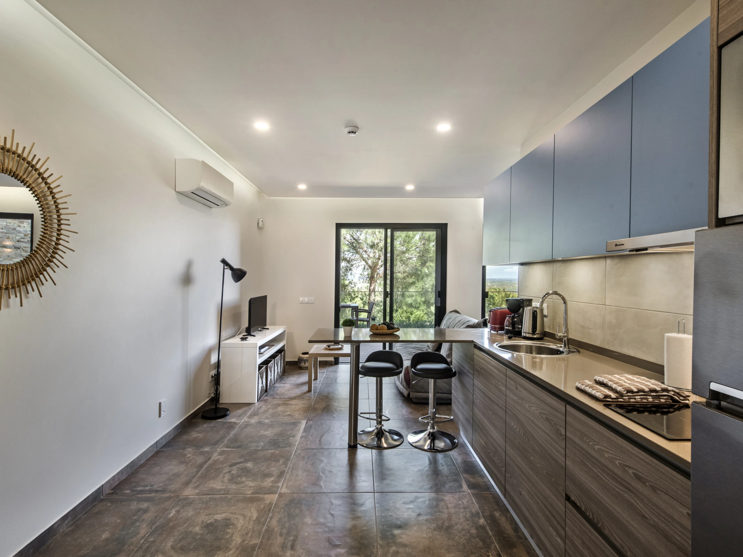 Dieses offene küche, ist ausgestattet in kühlschrank, mikrowelle, backofen, gefrierschrank, spülmaschine, geschirr/besteck, kochutensilien, kaffeemaschine, toaster, wasserkocher, saftpresse, herdplatte, küchengeschirr, teller und schüsseln.