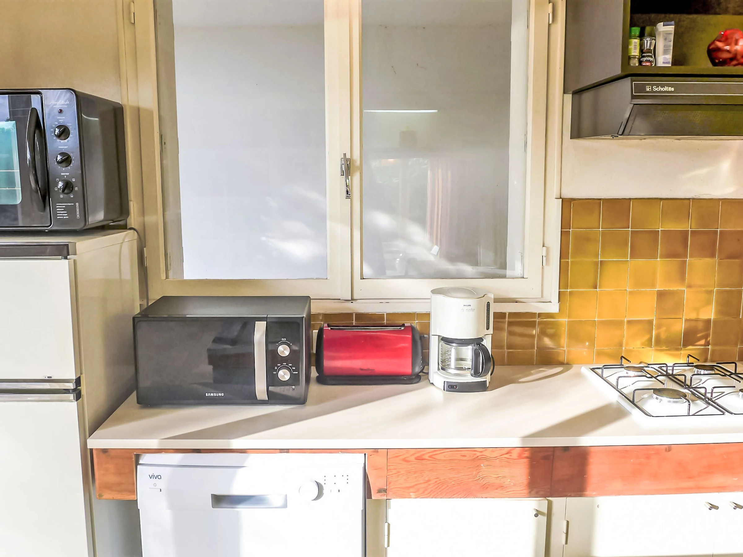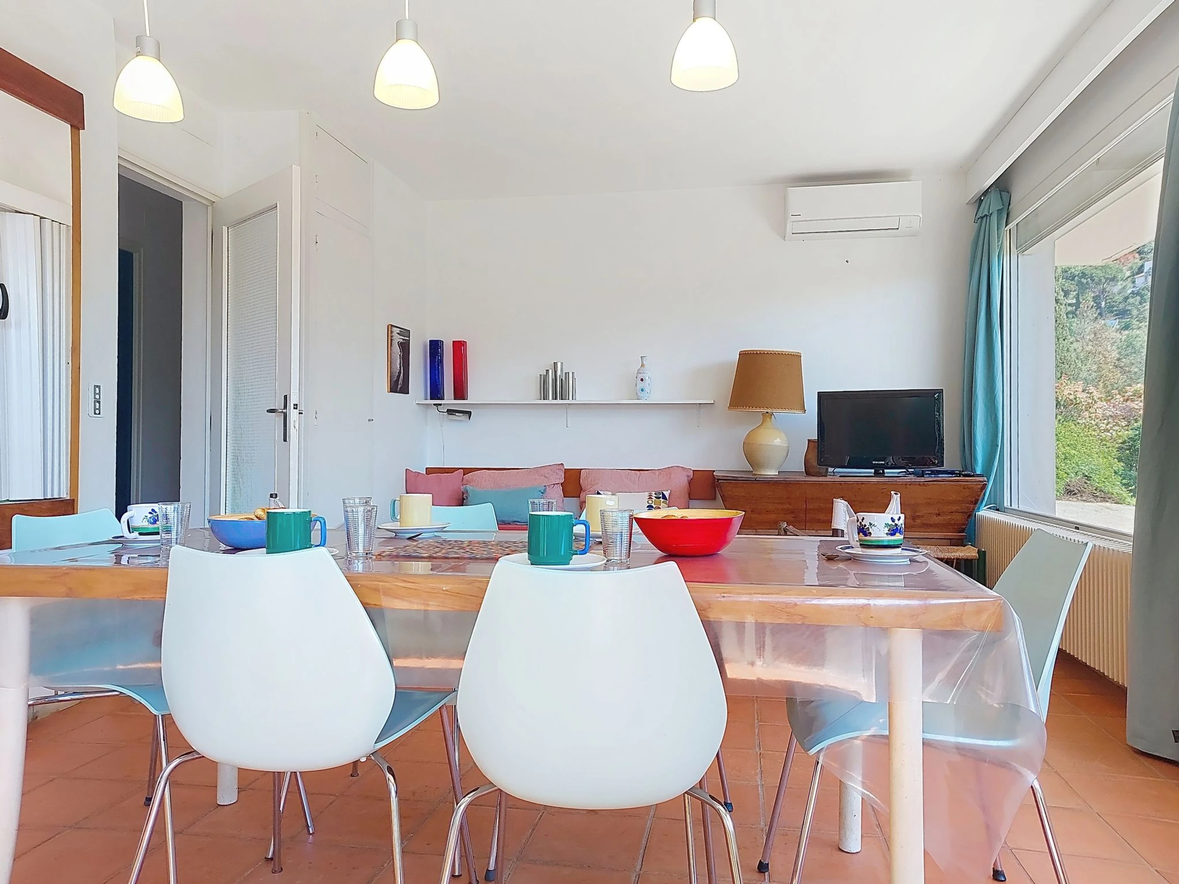 3-Zimmer-Wohnung 77 m2, im Erdgeschoss, Südostlage. Zweckmässig und komfortabel eingerichtet: Wohnzimmer mit Panoramafenster Richtung Südosten mit 1 Bett (80 cm, Länge 190 cm), TV (Flachbildschirm). Ausgang zur Terrasse. 1 Zimmer, Richtung Osten mit 1 franz. Bett. 1 Zimmer, Richtung Osten mit 2 Betten (90 cm, Länge 190 cm). Küche (Mini-Backofen, Geschirrspüler, Toaster, Wasserkocher, elektrische Kaffeemaschine) mit G-Heizofen. Ausgang zur Terrasse. Dusche, sep. WC. E-Heizung, Klimaanlage. Grosse Terrasse. Terrassenmöbel, Liegestühle (4). Sicht auf den Garten. Zur Verfügung: Waschmaschine, Bügeleisen. Internet (WLAN, gratis). Parkplatz beim Haus. Bitte beachten: Maximal 1 kleines Haustier/Hund erlaubt. Rauchmelder.