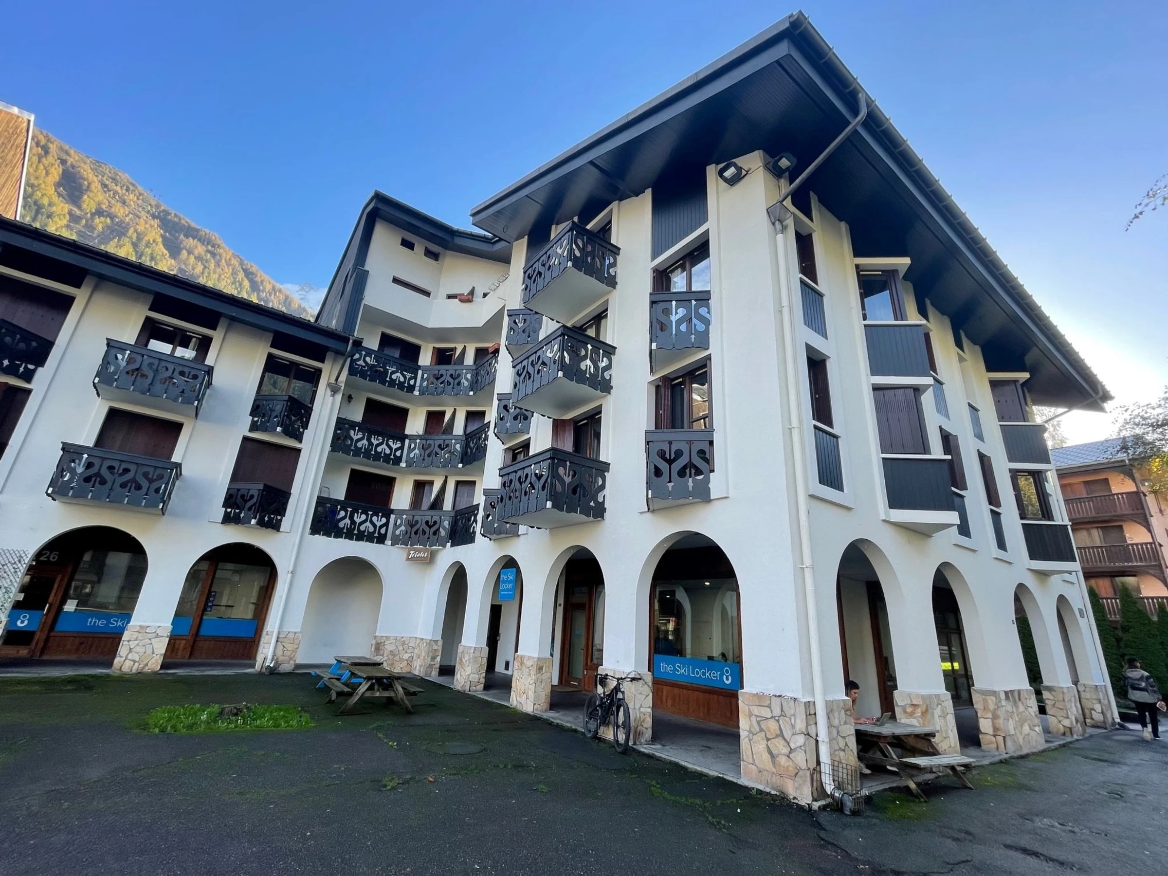 Residenz "Le Triolet", auf 4 Stockwerken. Im Ortsteil Chamonix Sud, 500 m vom Zentrum, belebte Lage. In der Anlage: Fahrstuhl. Einkaufsgeschäft 50 m, Supermarkt, Einkaufszentrum 600 m, Restaurant 50 m, Bar, Bushaltestelle 150 m, Bahnstation 800 m. Golfplatz (18 Loch) 4.4 km, Sportzentrum 1 km, Skisportanlagen 1 km, Langlaufloipe 1 km. Bitte beachten: Nacht Club/Disco in der Nähe.